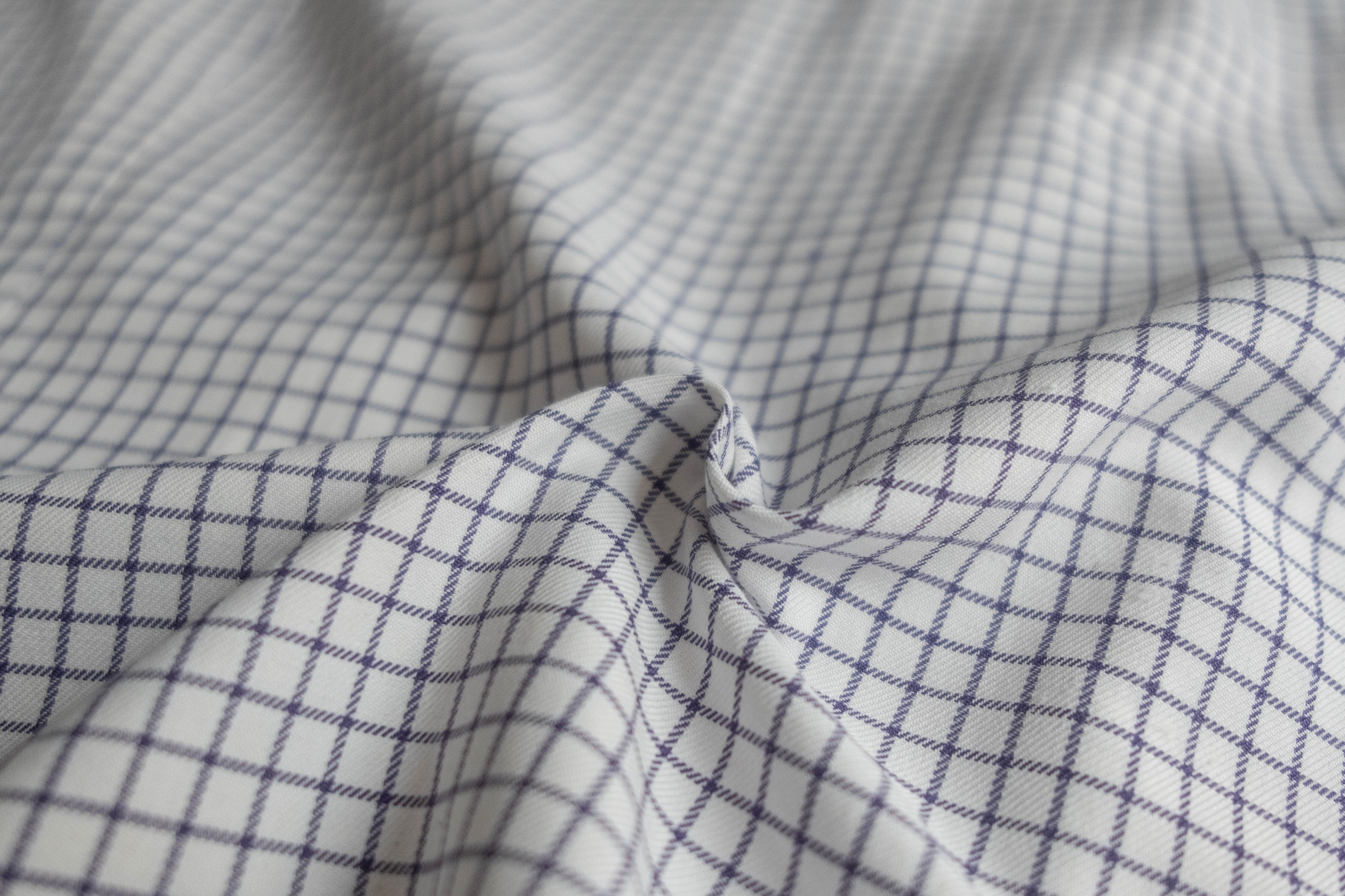 ホワイト×ブルーのチェック柄、ピッチの細かいチャック柄なのでカジュアルとフォーマルの中間に位置するような印象受けます。