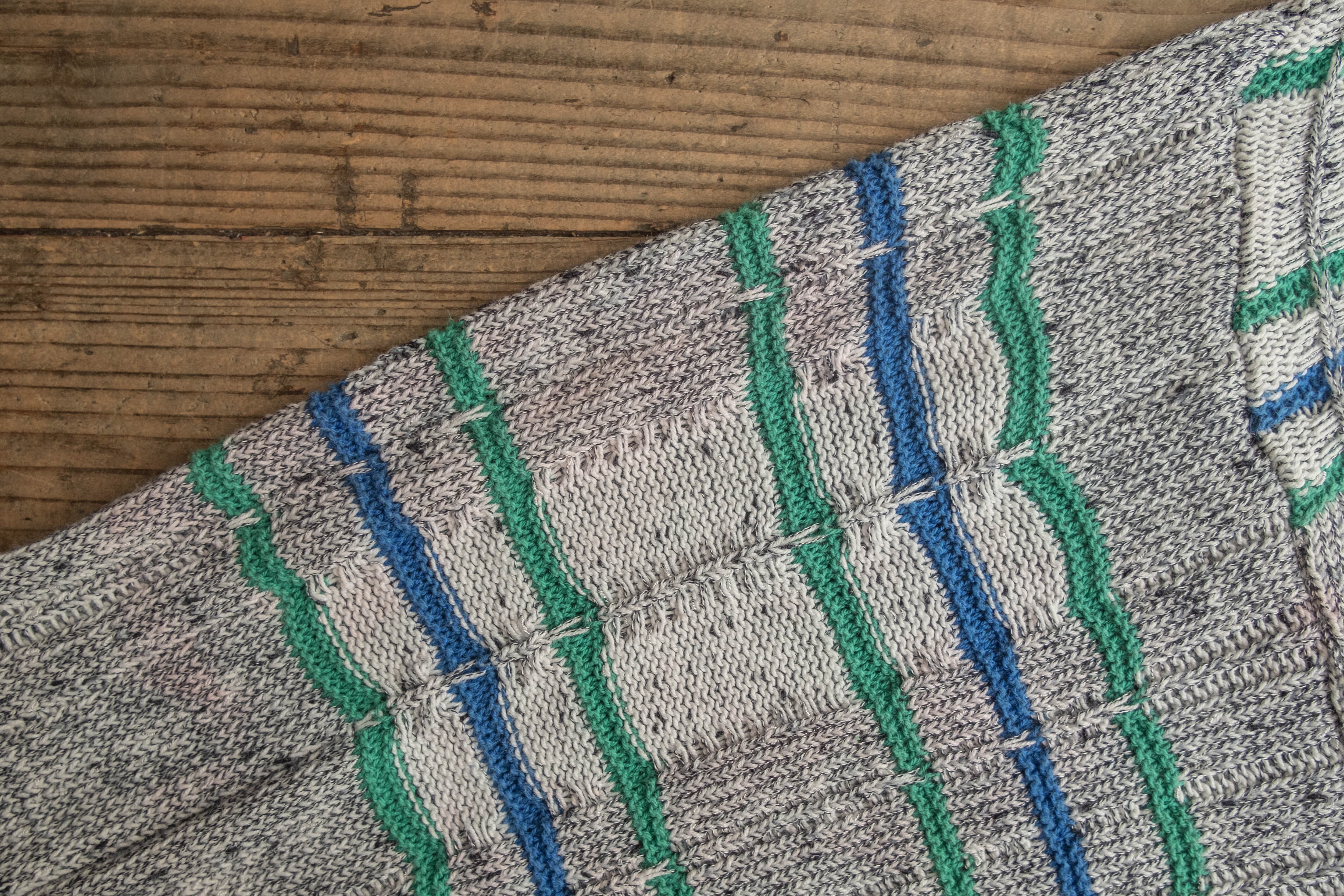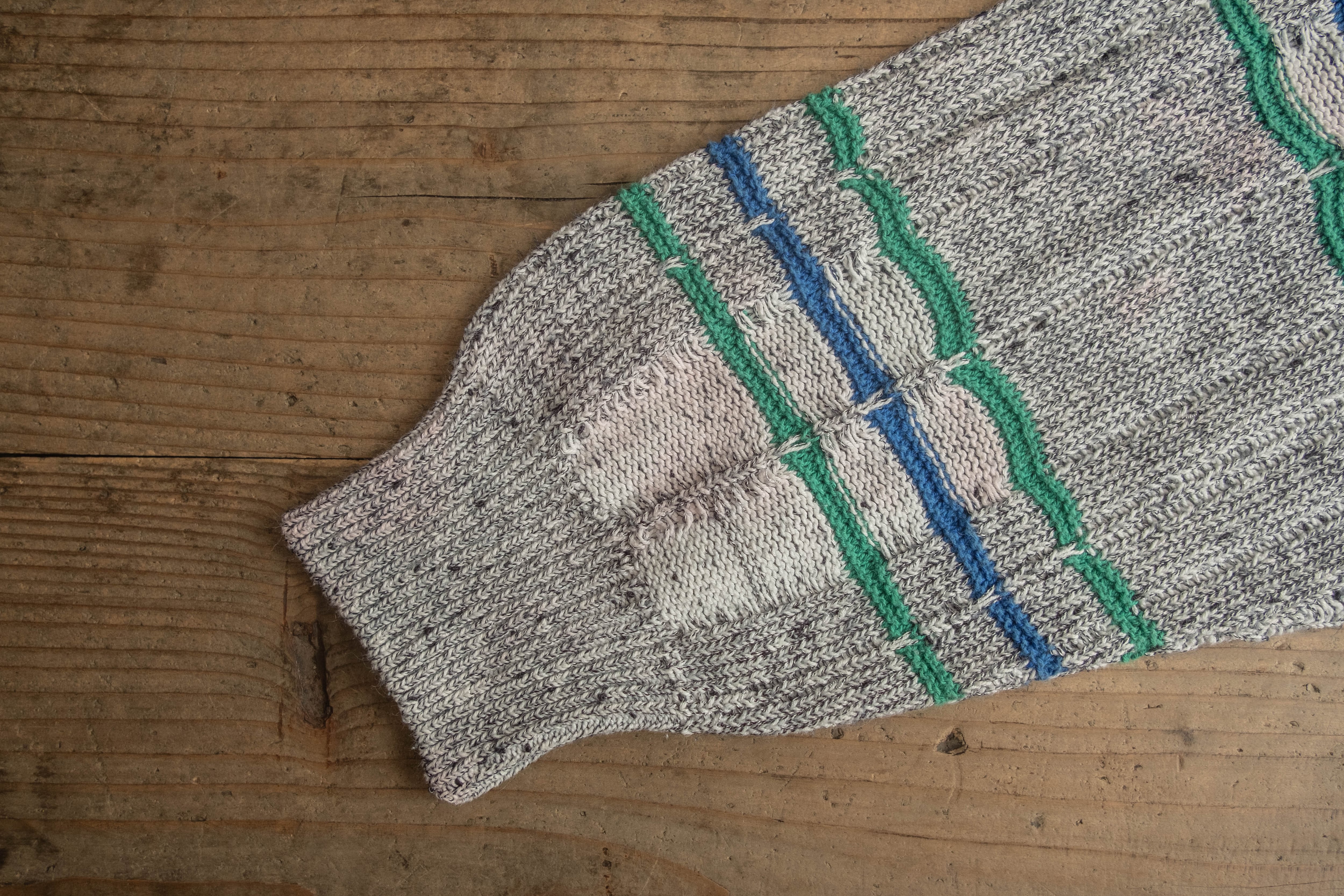 ホワイトとグレーの糸のベースにブルー、グリーンのラインが入っています。