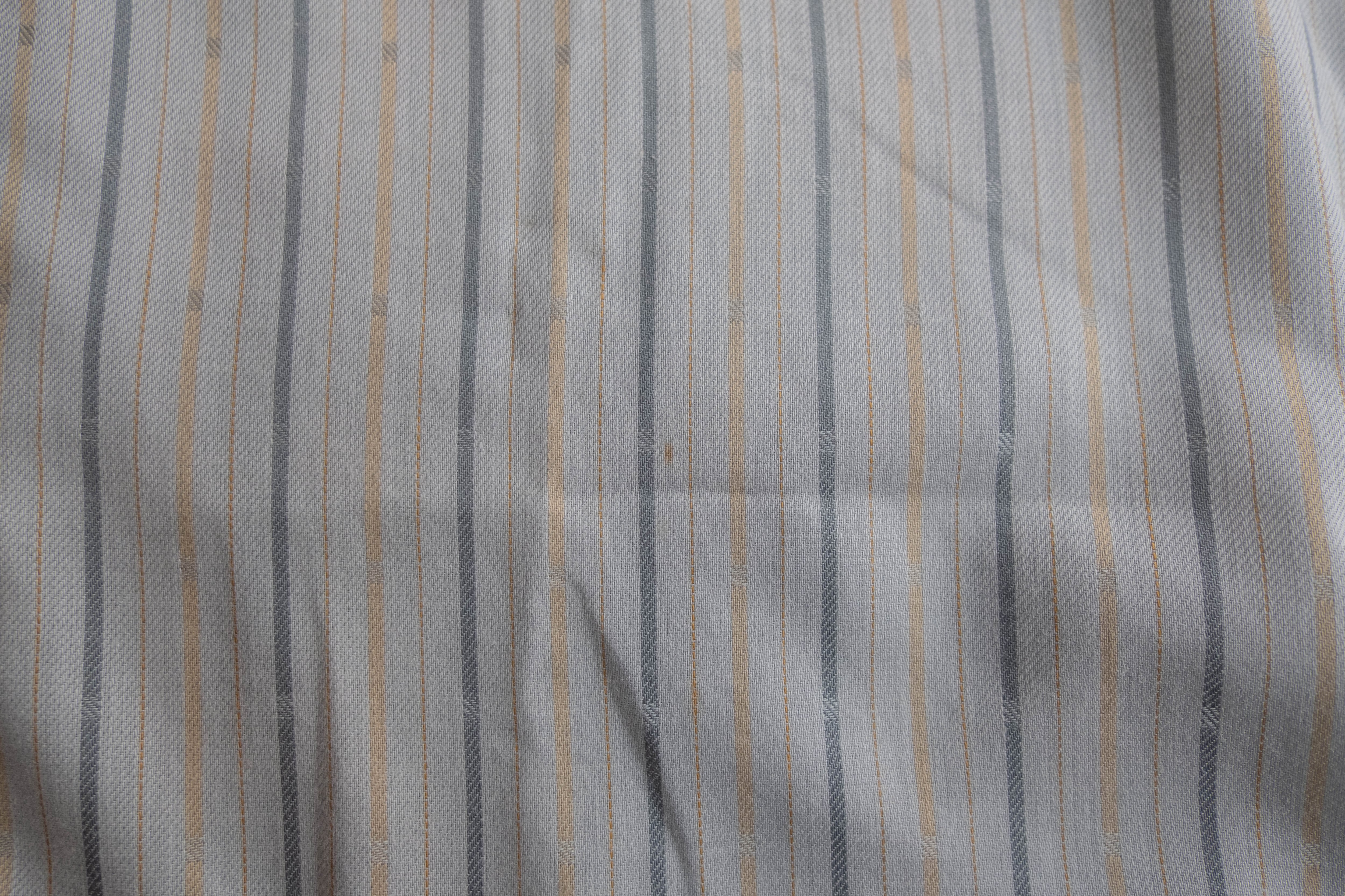 こちらはコットン50%、ポリエステル50%の生地で、ブルーグレーカラーにイエローとブルーのストライプが入る個体です。