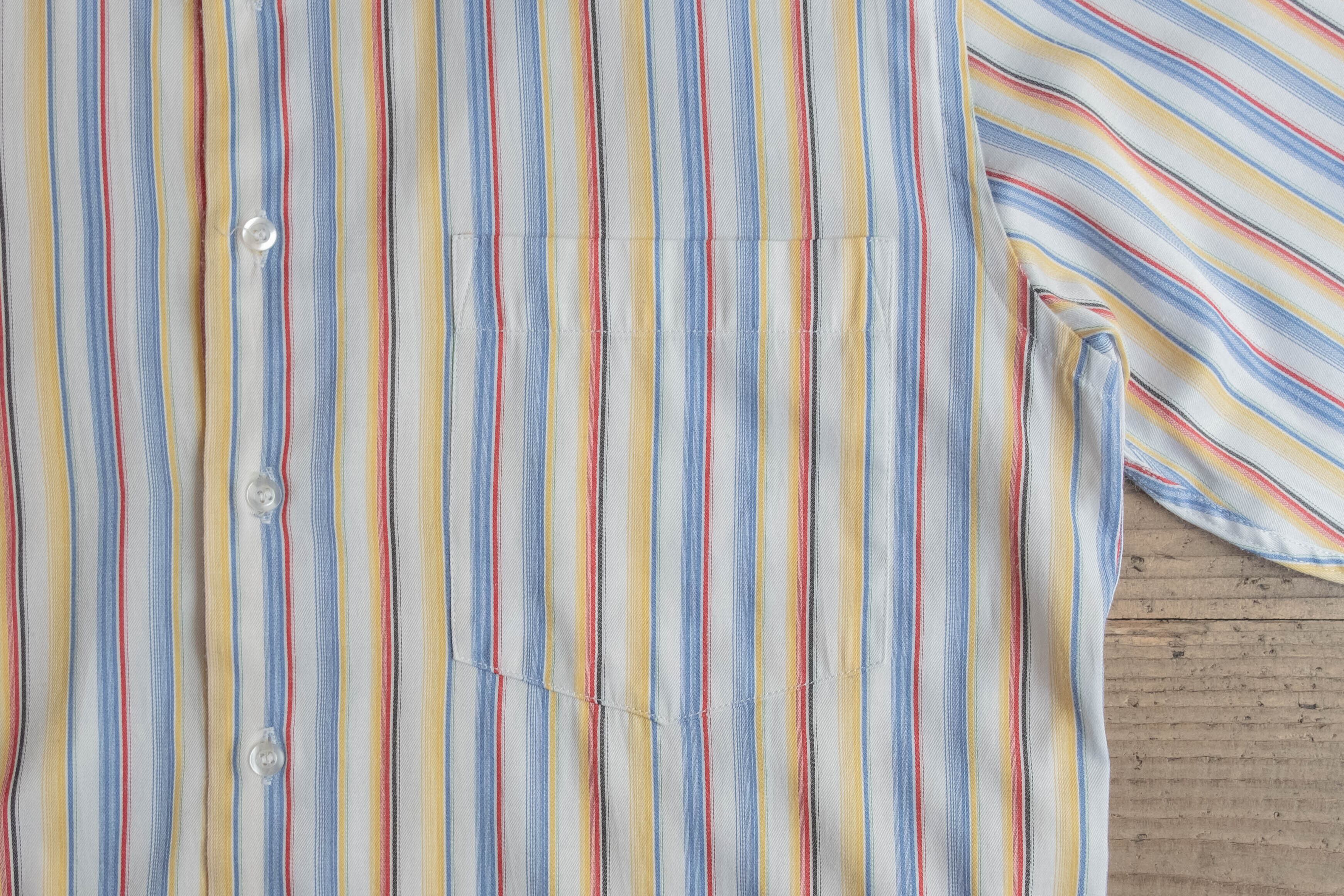 レッド、ブルー、イエロー、ブラック、グリーンと様々なカラーが使われたストライプ柄。