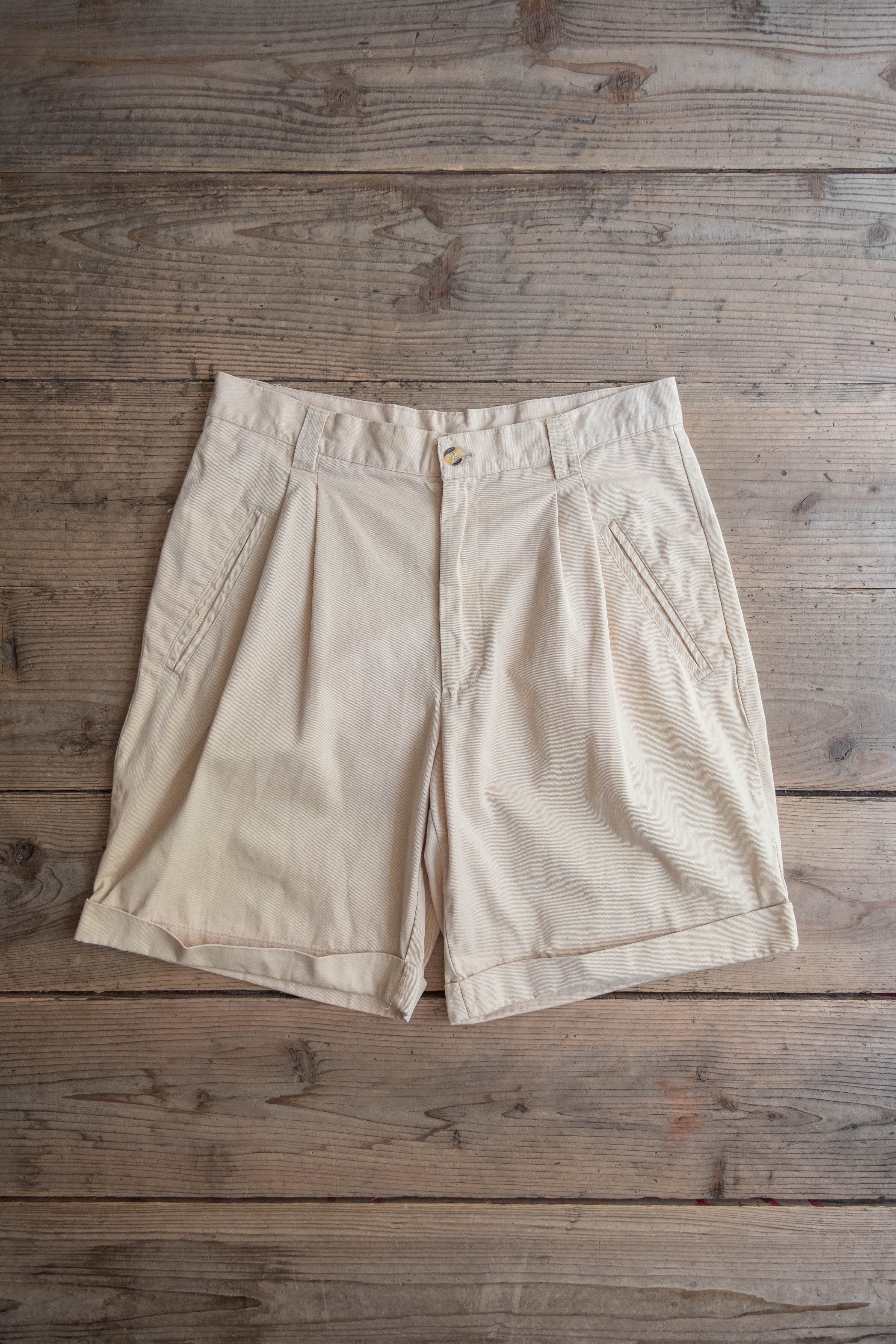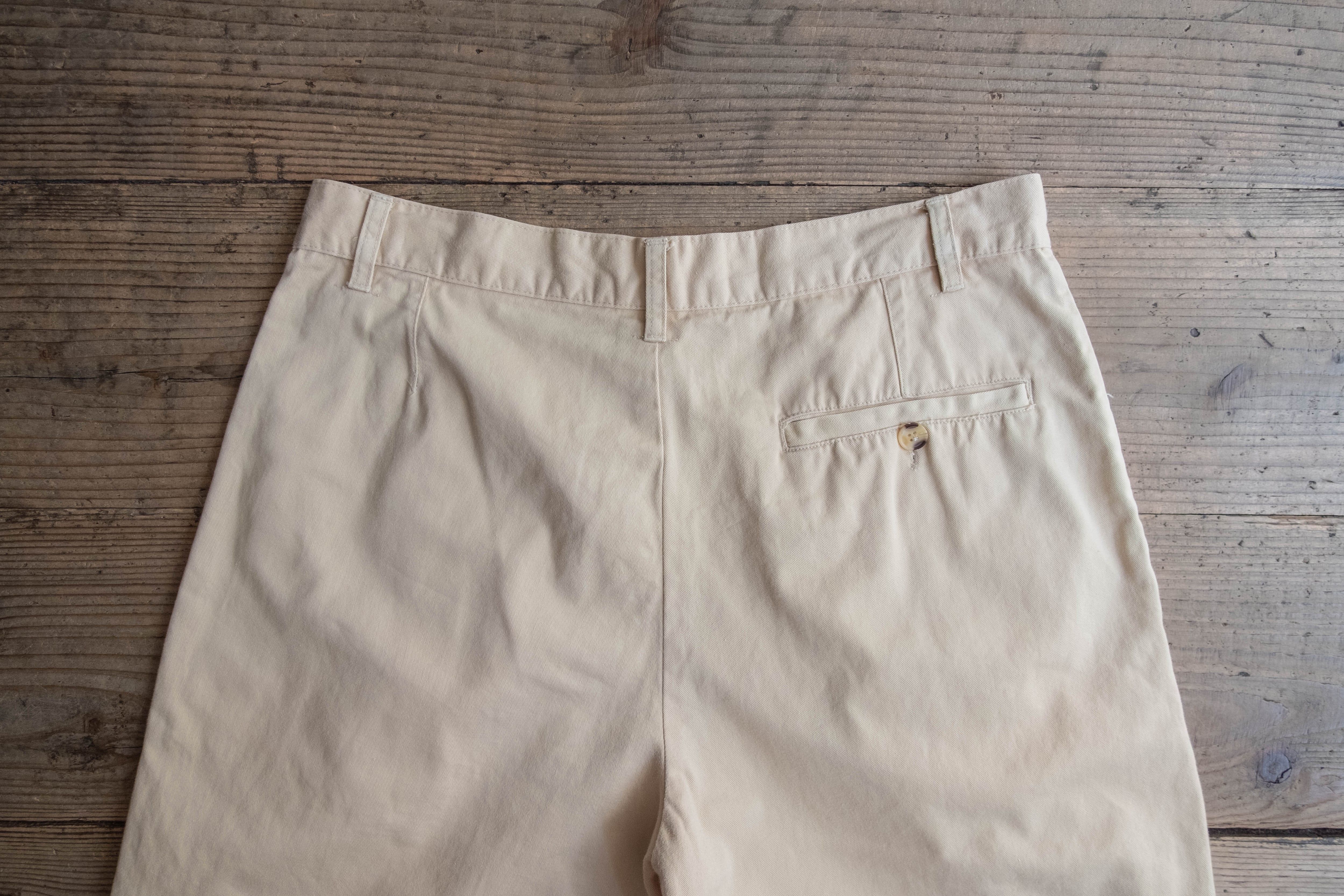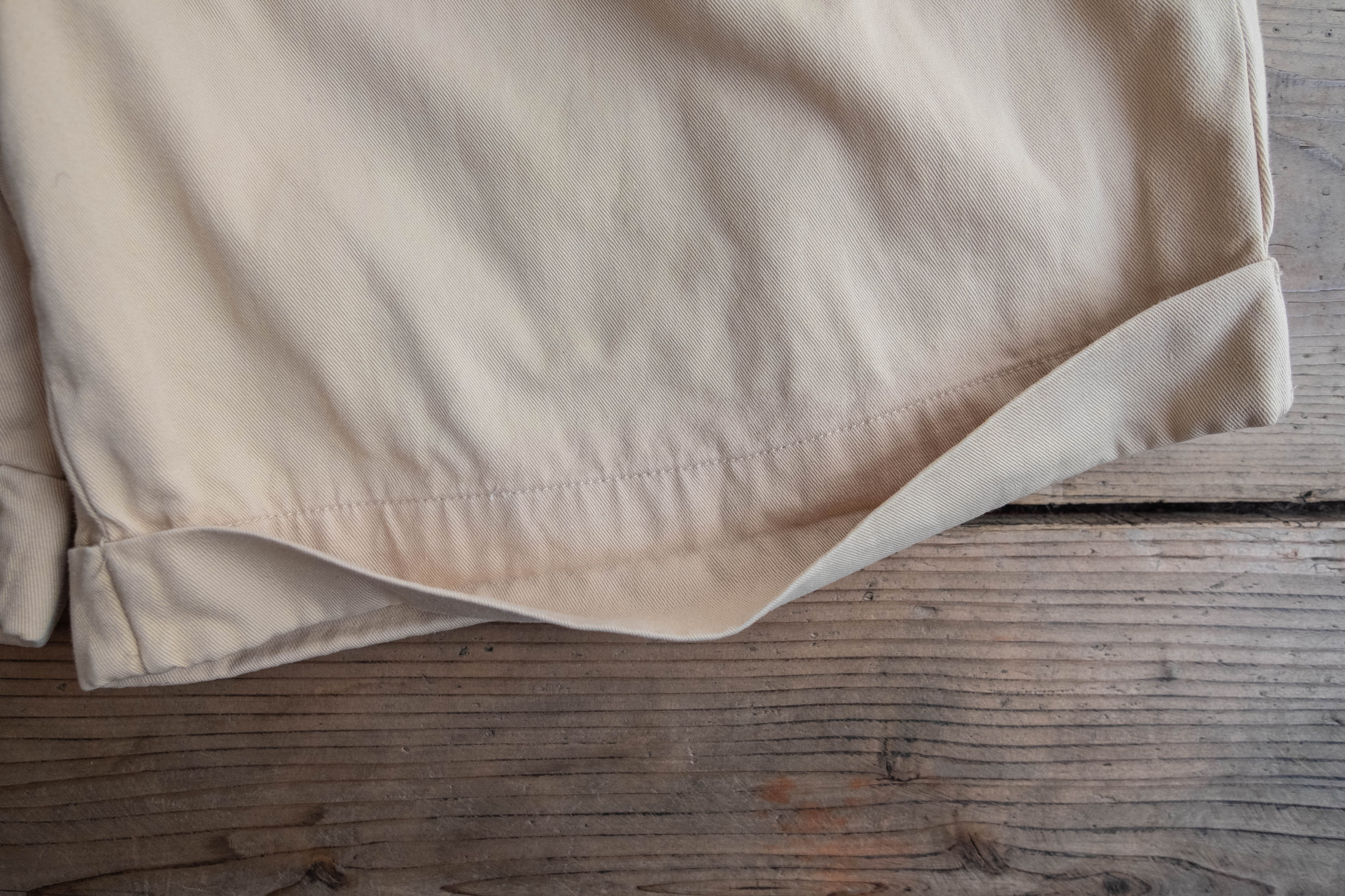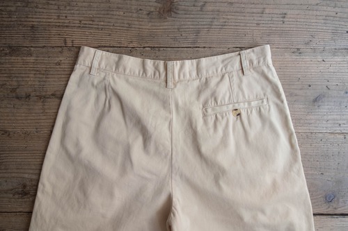 玉縁仕様のポケット、ダブルに上げられた裾、広いワタリと裾幅で個人的に嬉しいポイントが多い、おすすめのショーツです。