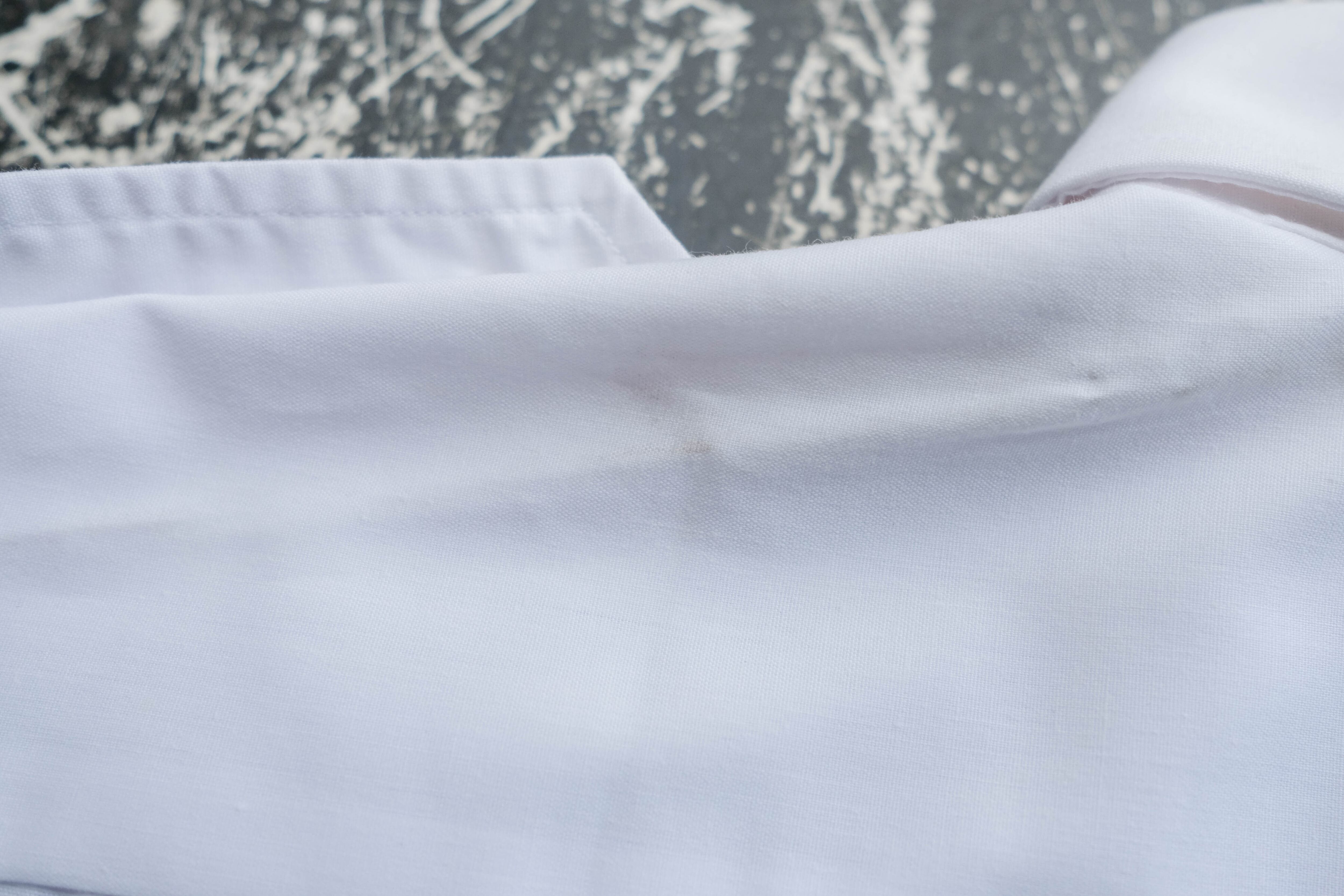 こちらはコットン55%、ポリエステル45%の生地で、クリーンなホワイトカラーの個体です。