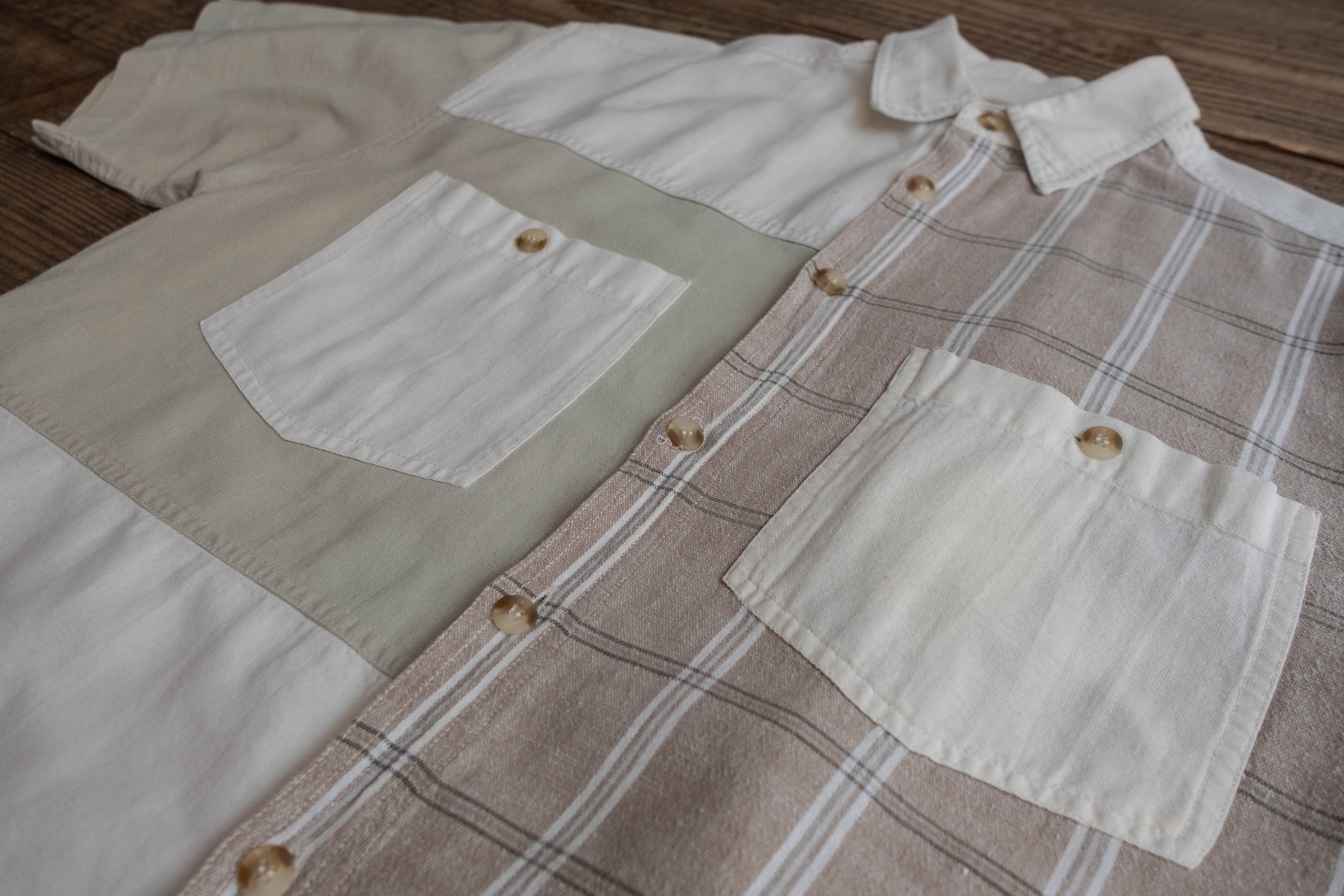 クレイジーパターンと言っても、オリーブ、ピスタチオ、ホワイトの良い色合わせのパターンなので、所謂クレイジーパターンのシャツよりはシンプルで合わせやすいと思います。