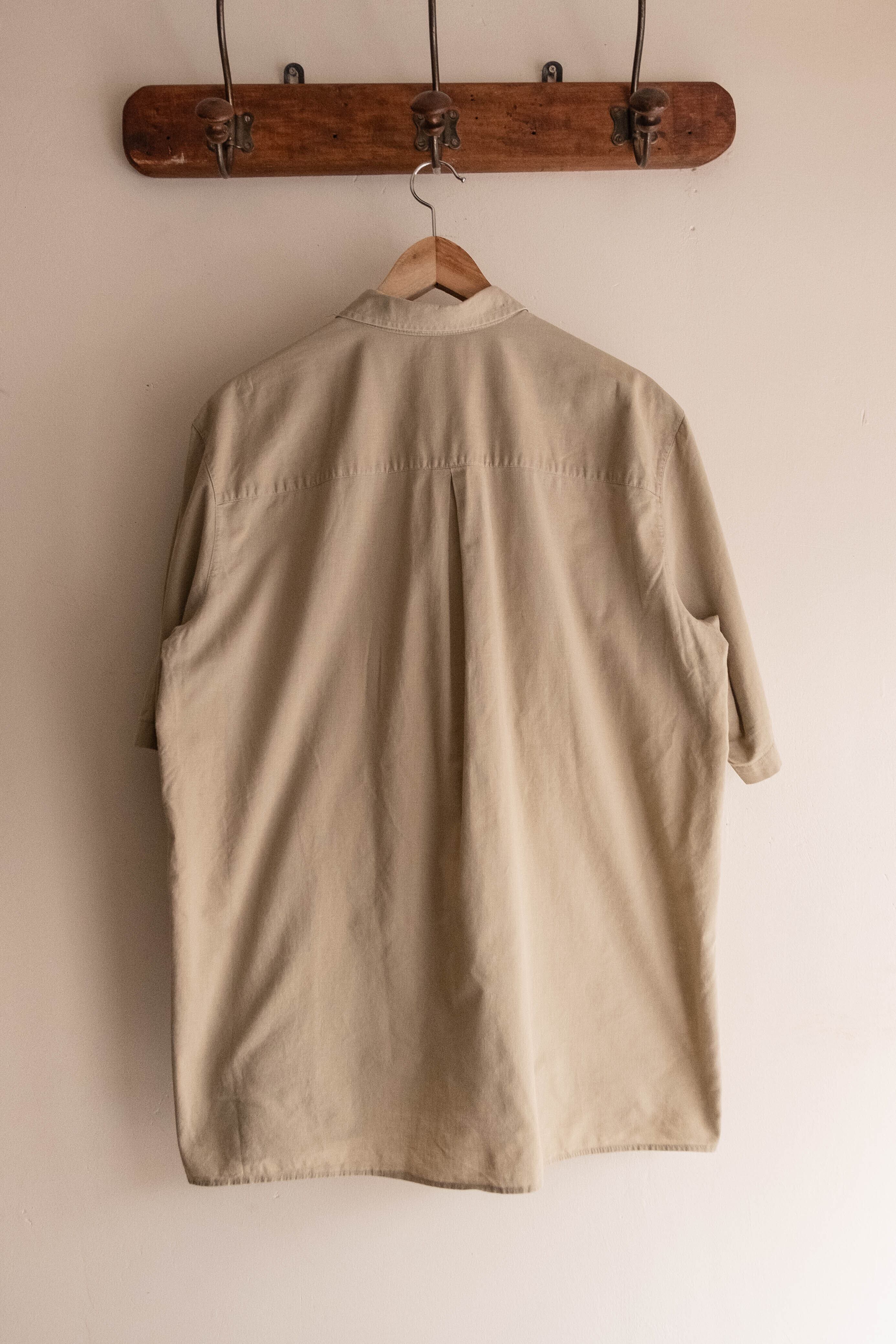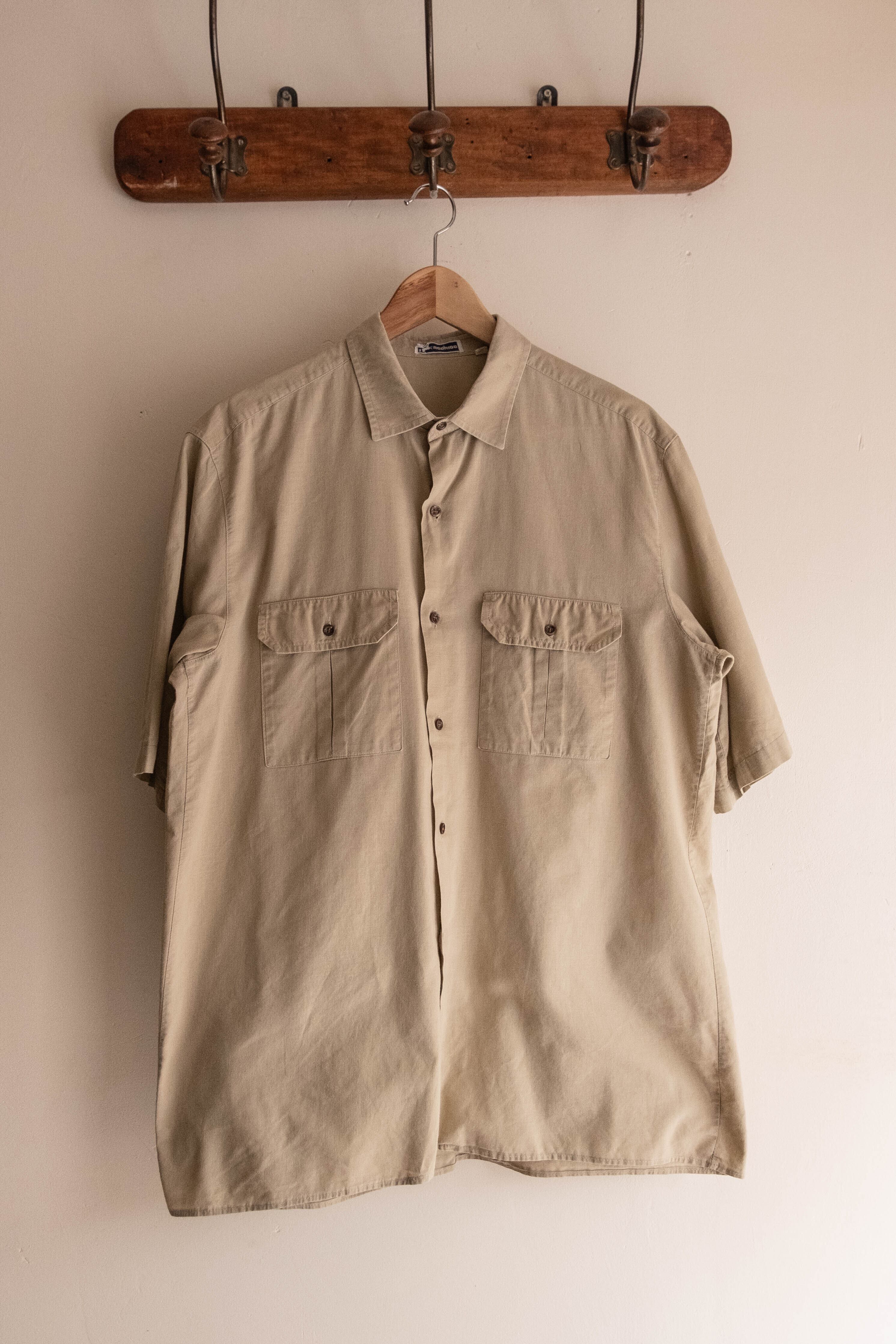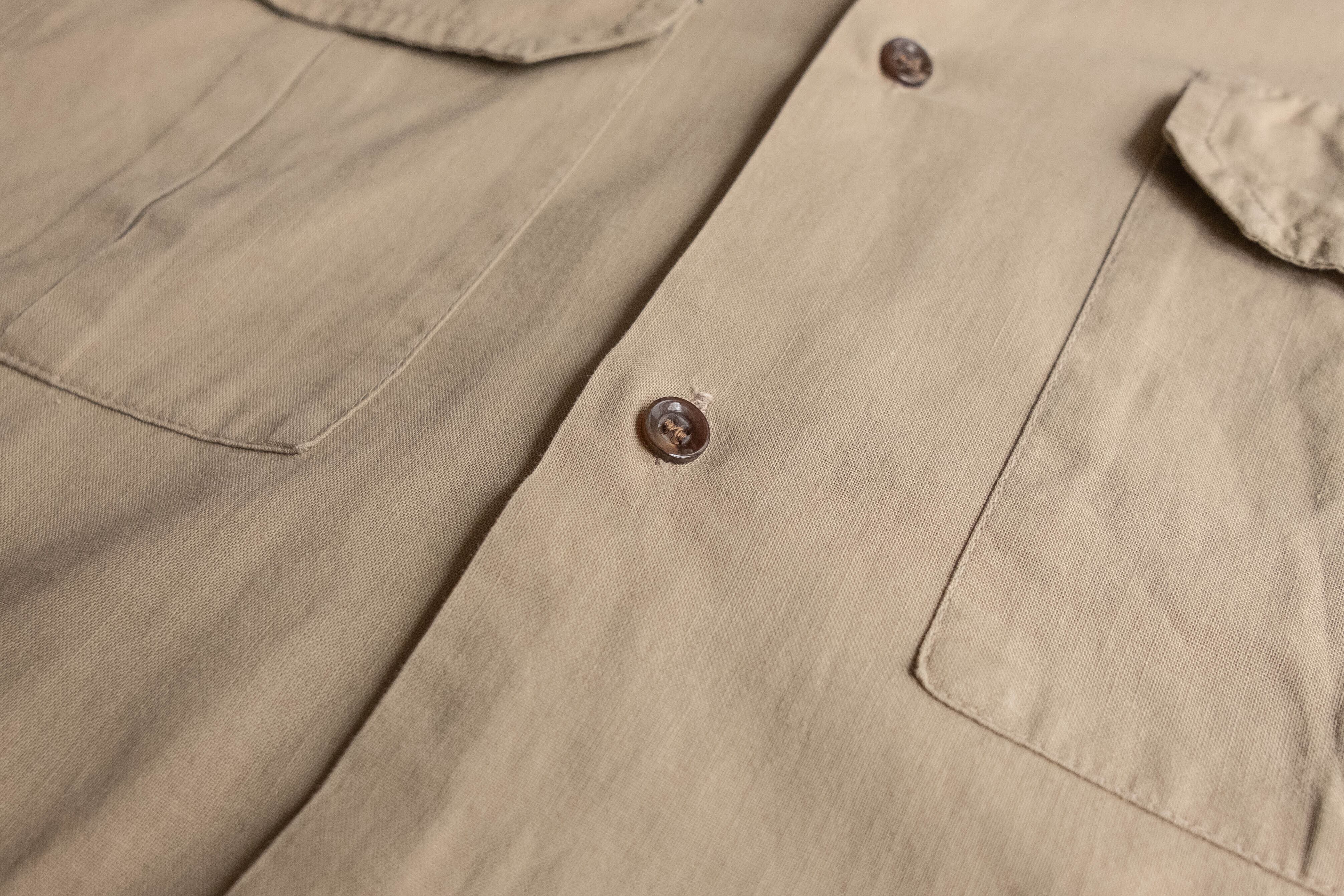 サンドベージュカラーで両胸ポケのディテールがサファリシャツのようなルックスですが、エポレットは付いておらず、ありがちな細長いシルエットでもないので良いバランス感のシャツですね。