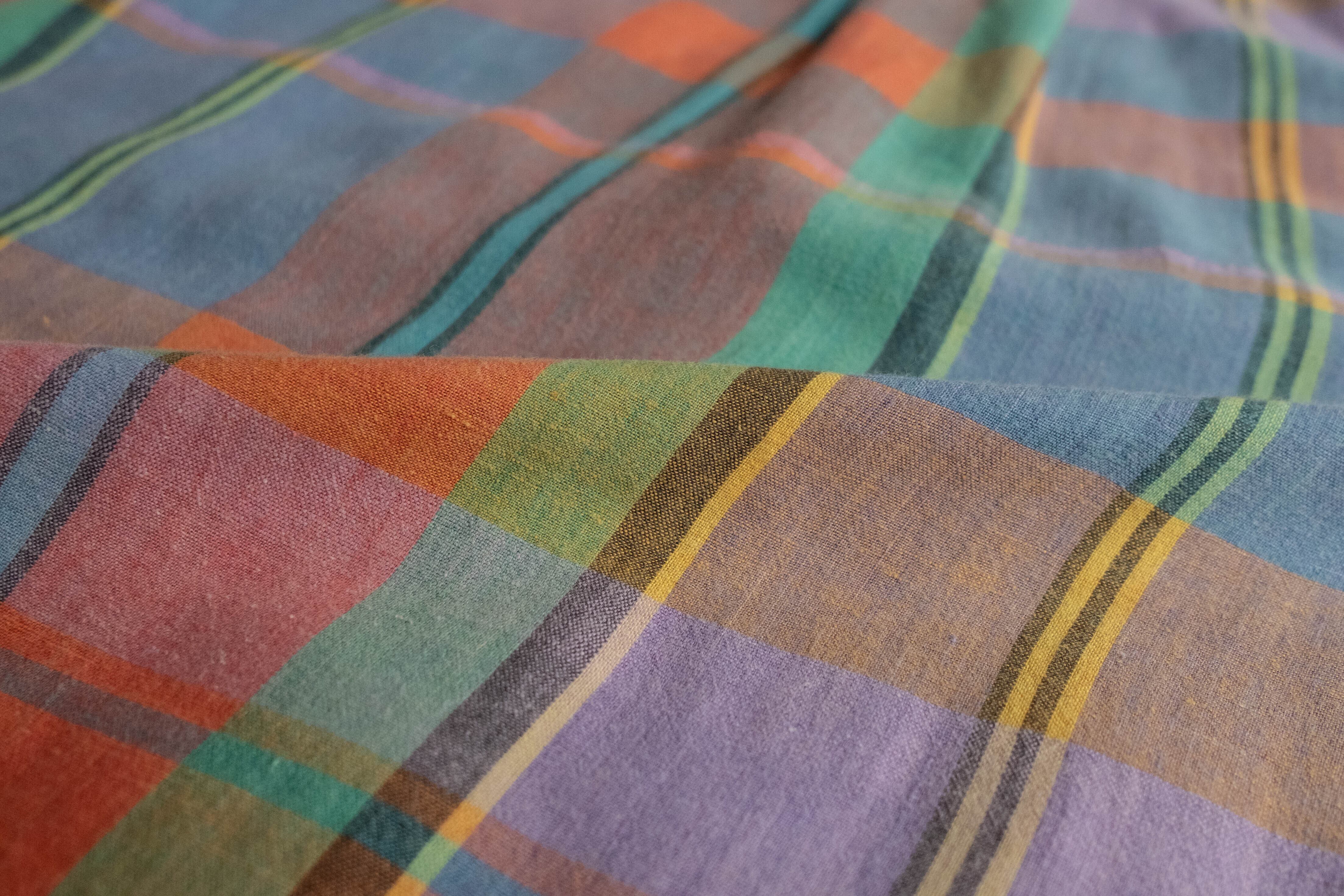 オレンジ、ブルー、グリーン、イエロー、パープルのマドラスチェックです。