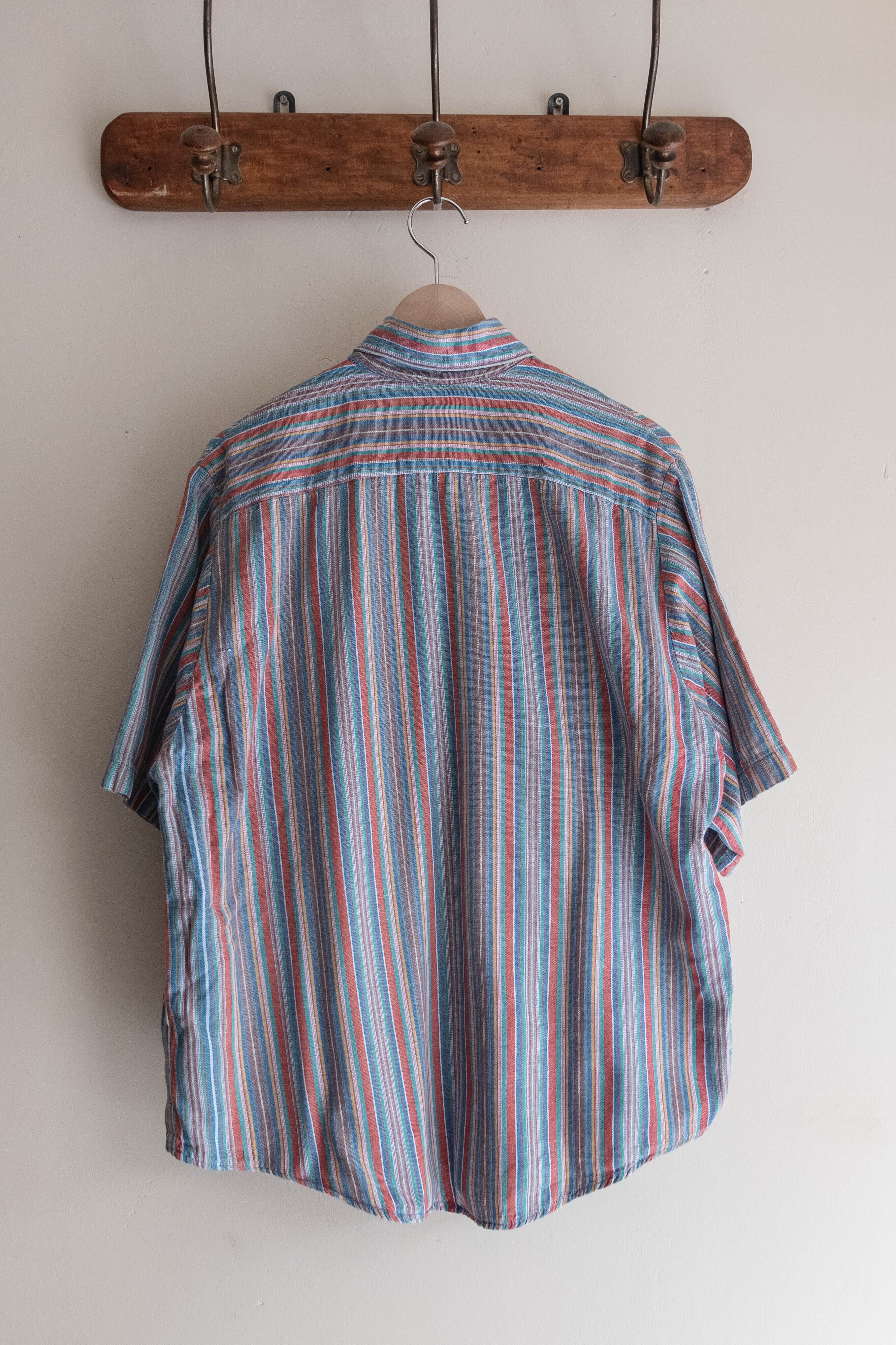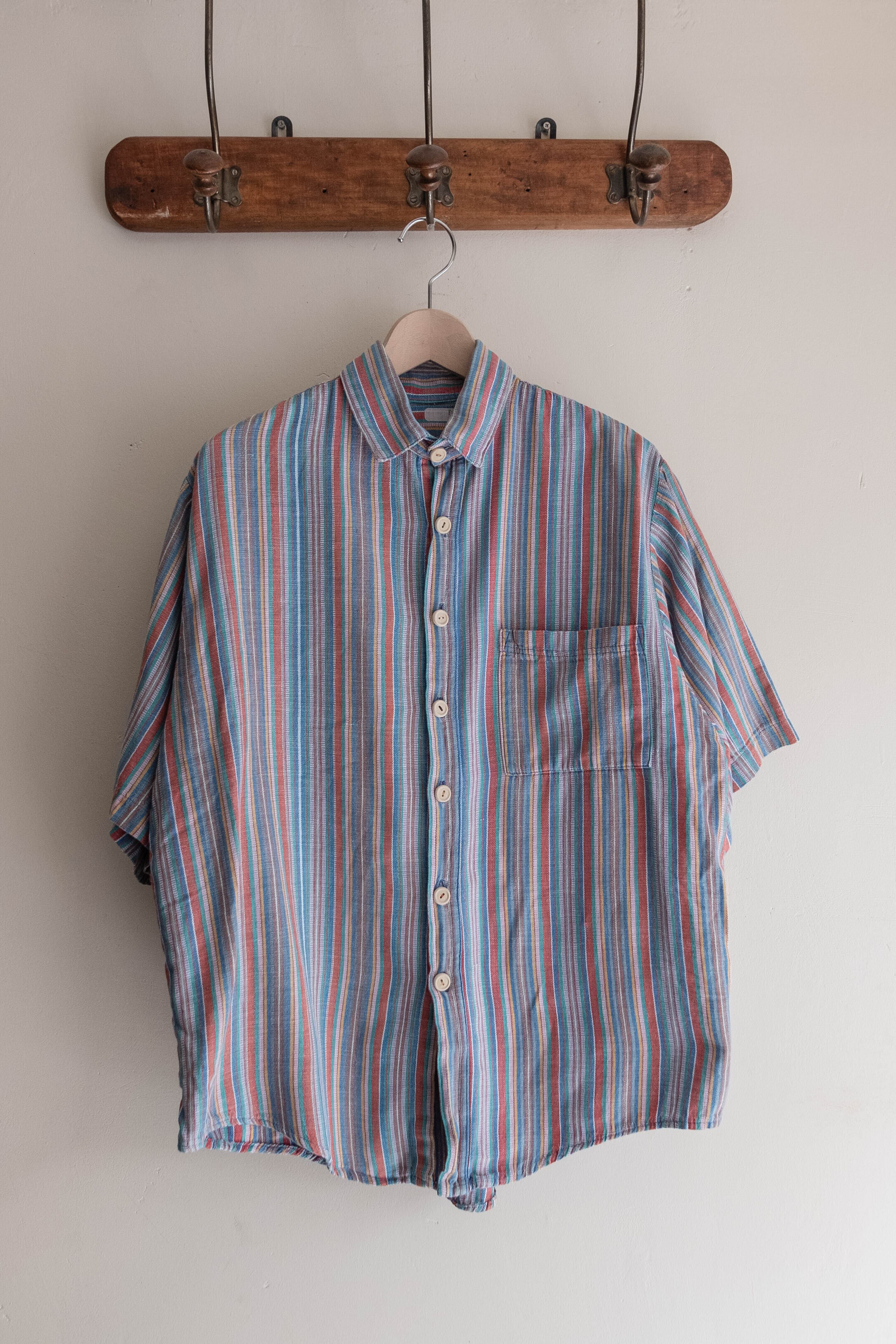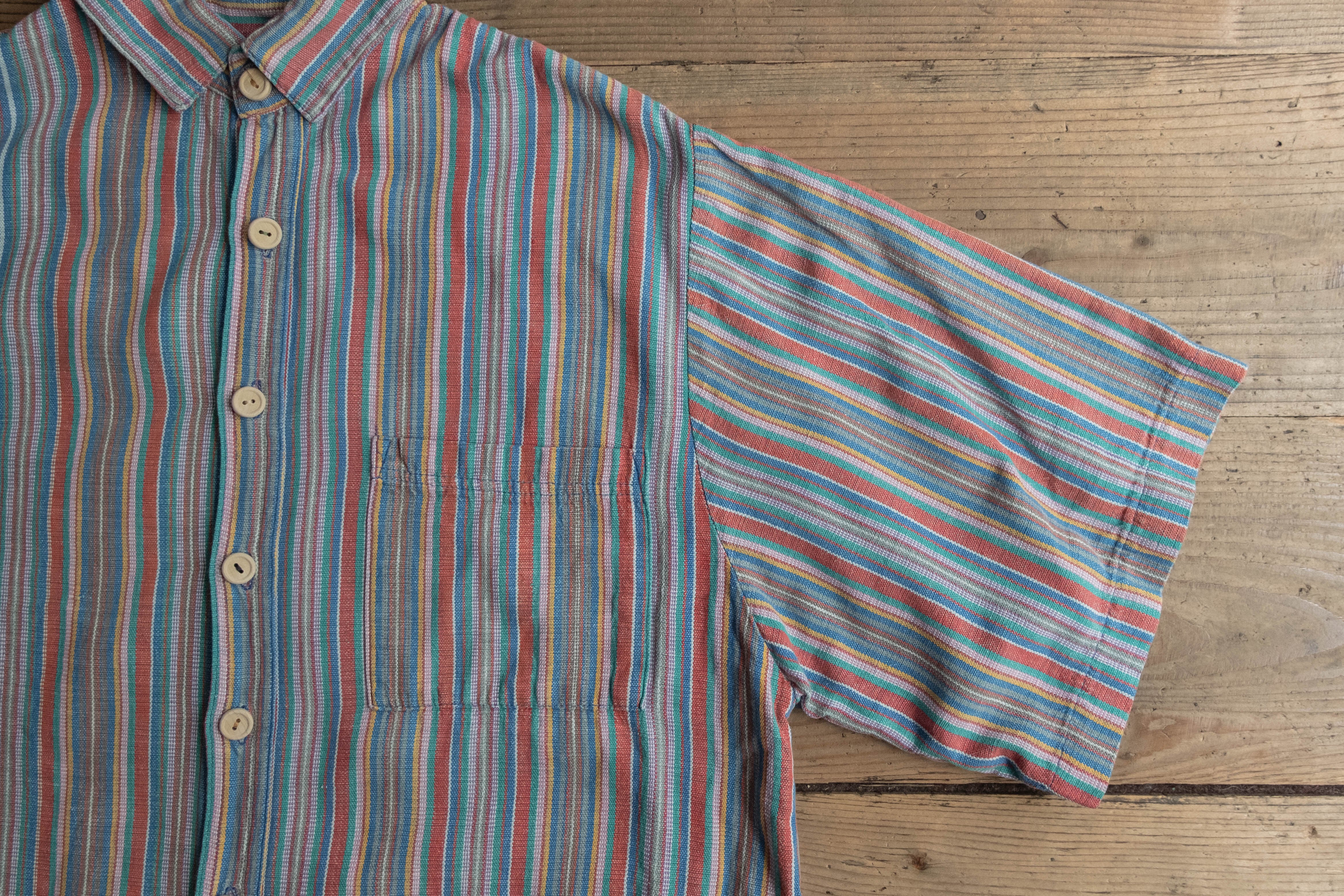 マドラスチェックのように様々なカラー、ユーロ物にたまにある変わった生地、厚ぼったい木のボタン、身幅広め着丈短めの変わったシャツです。