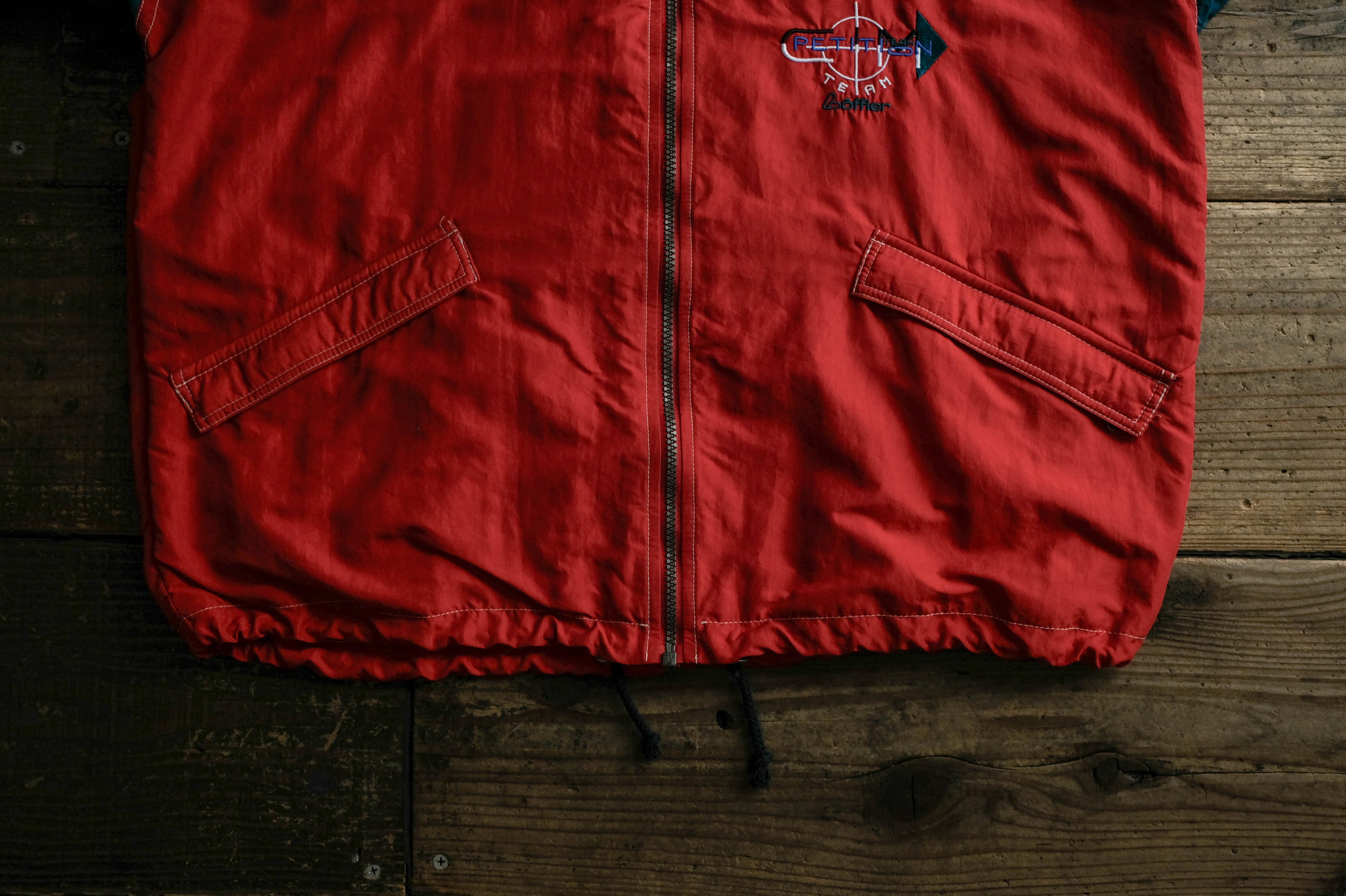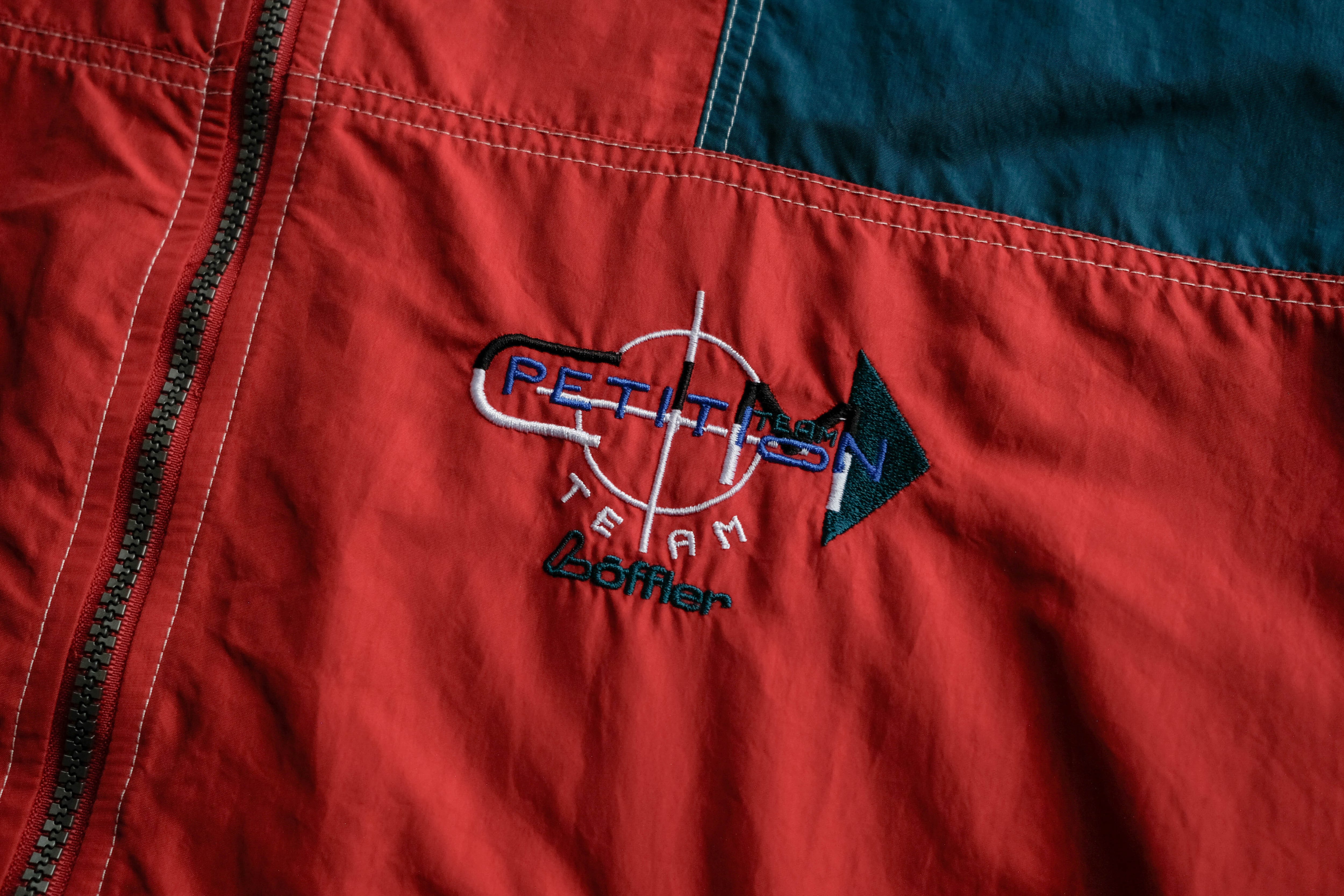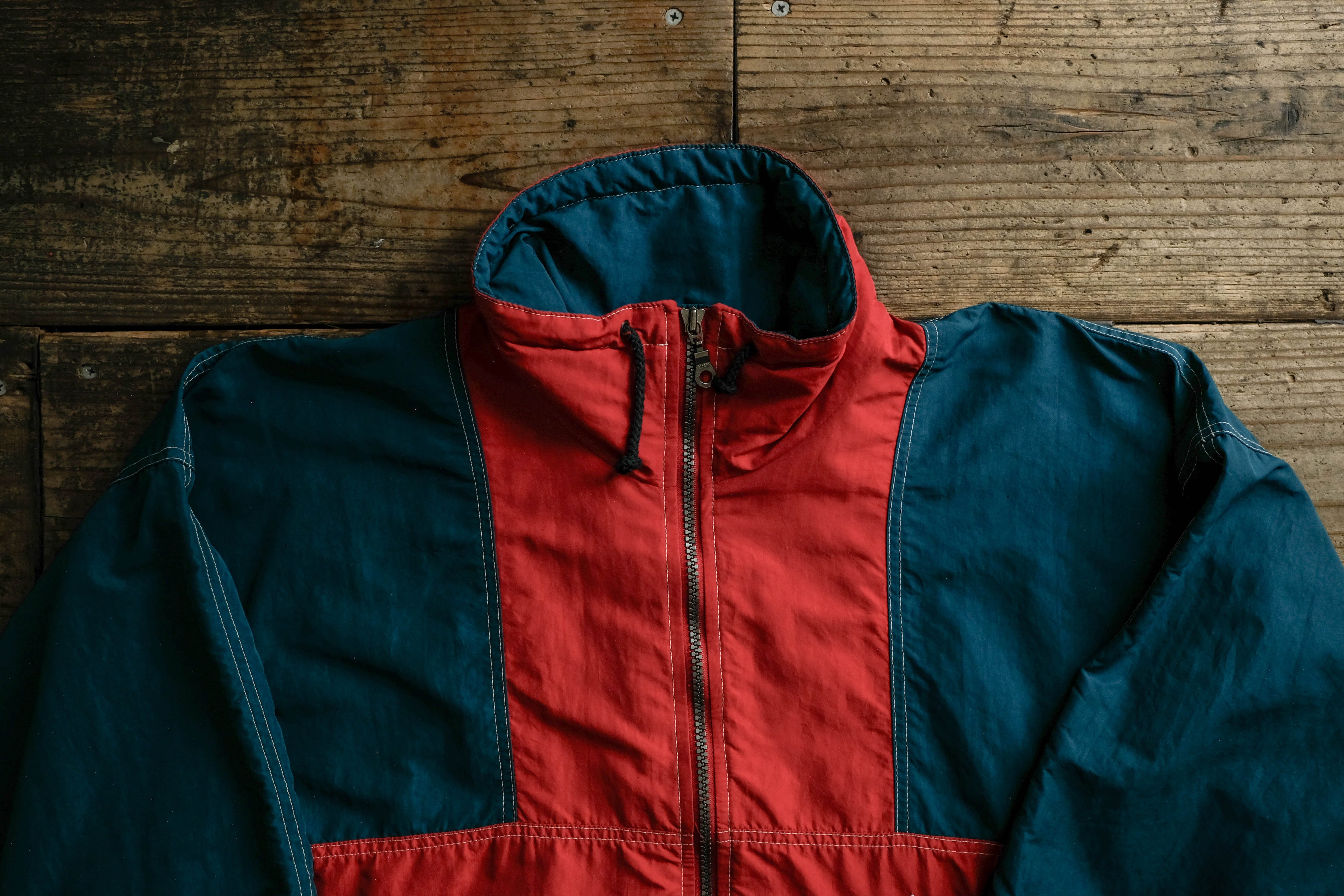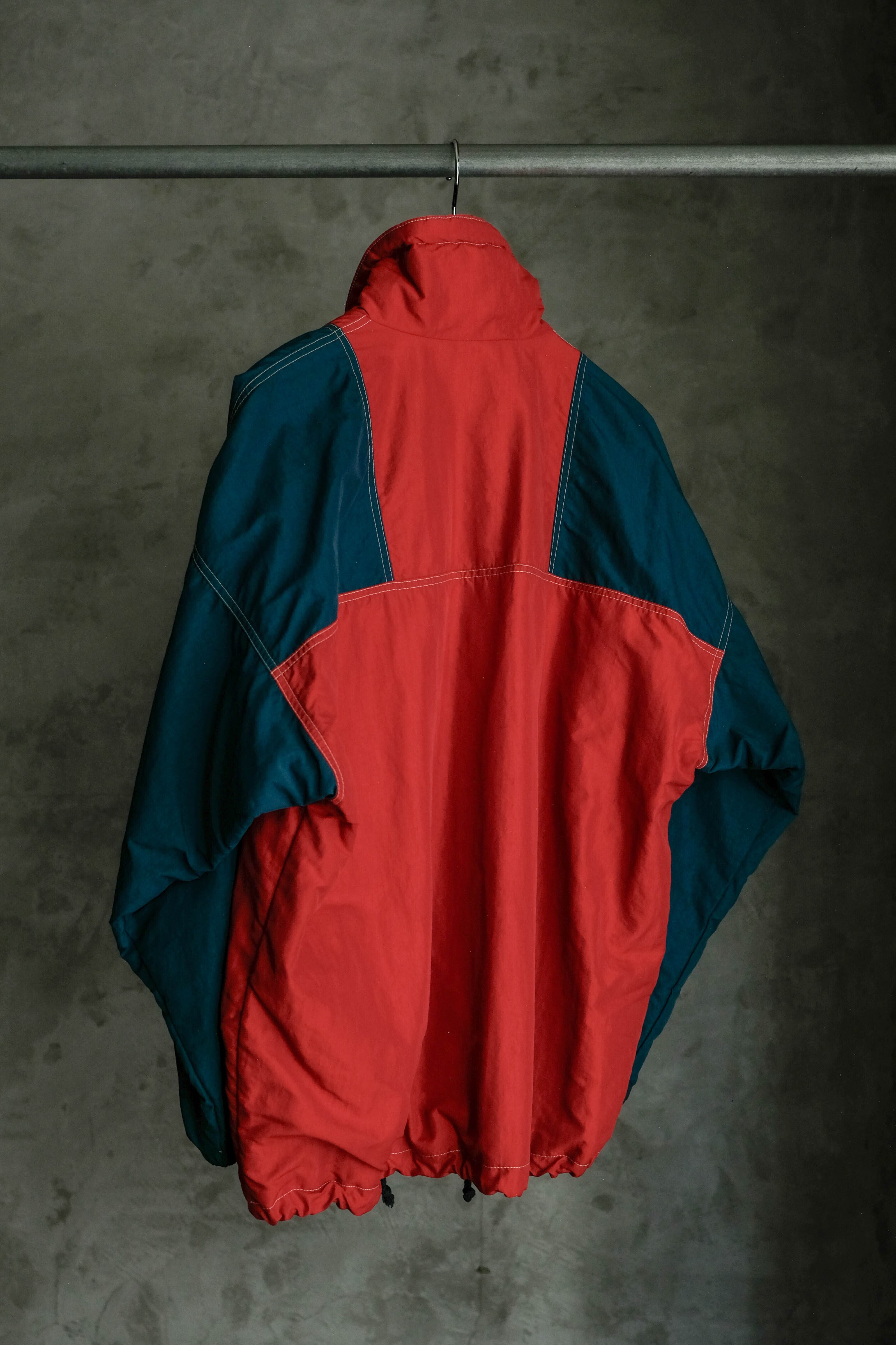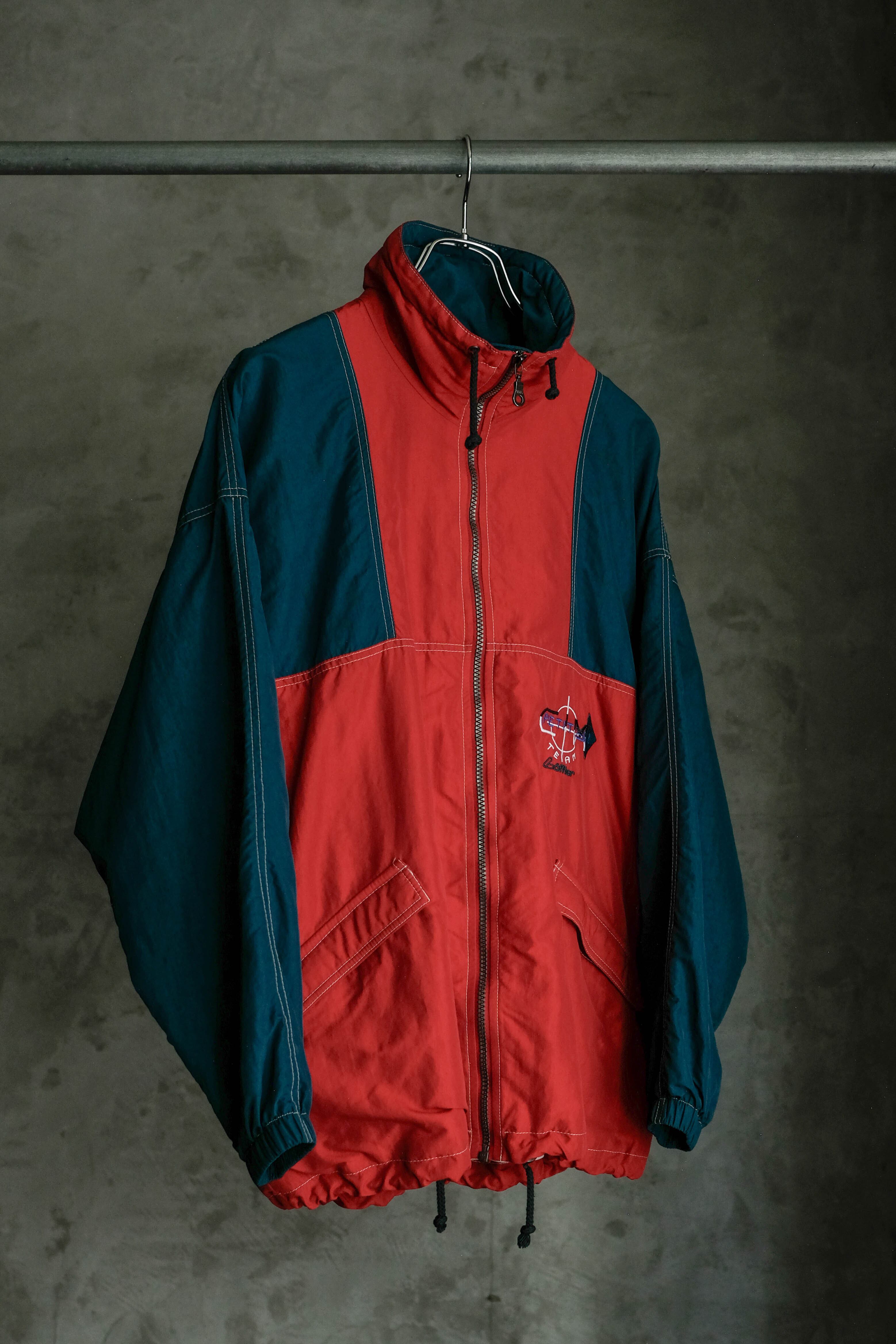 こちらはレッドカラーをベースに、肩から袖にかけてネイビーカラーの切り替えが入るデザイン。