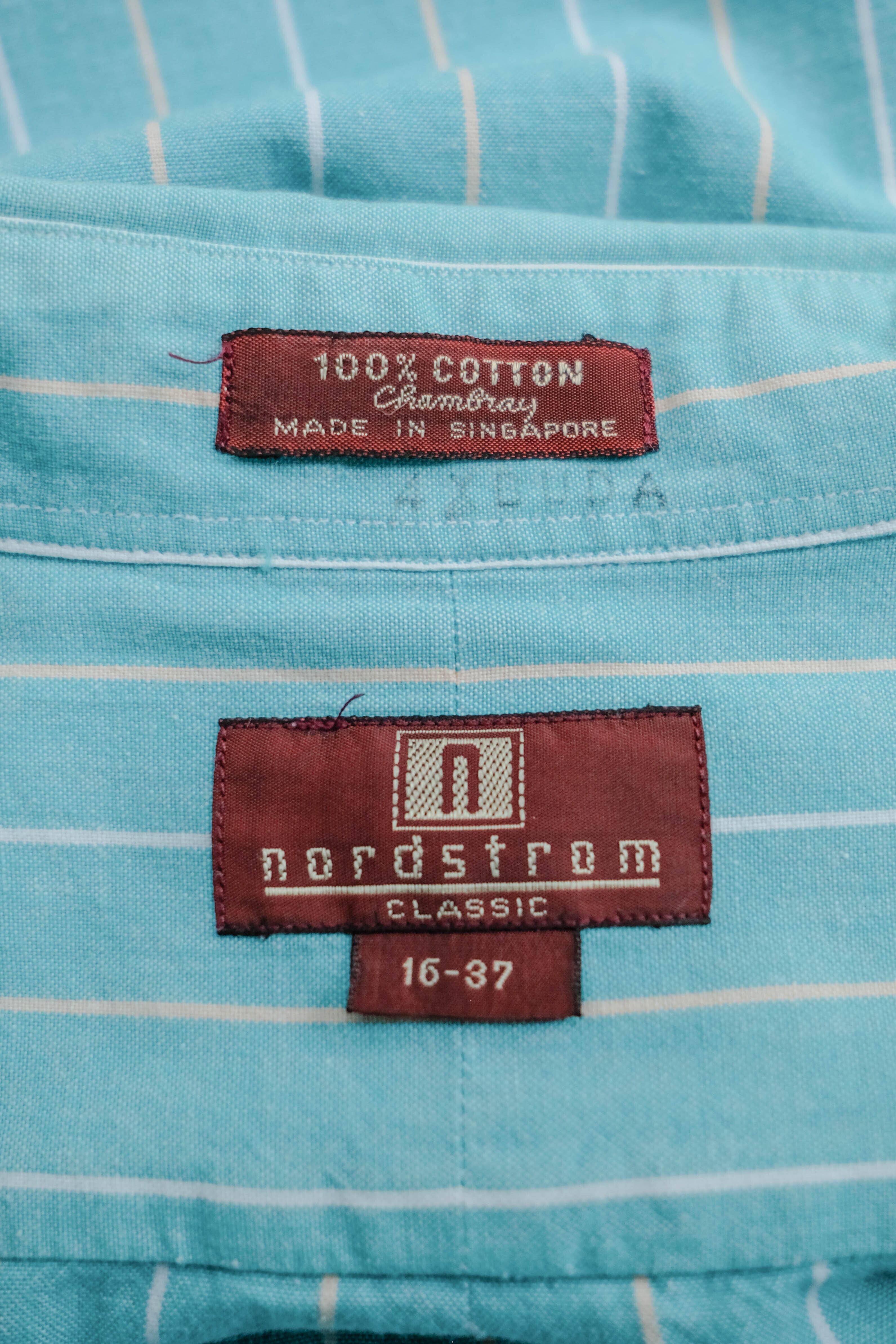 鮮やかなミントブルーをベースにベージュとホワイトのストライプが入ります。
