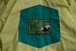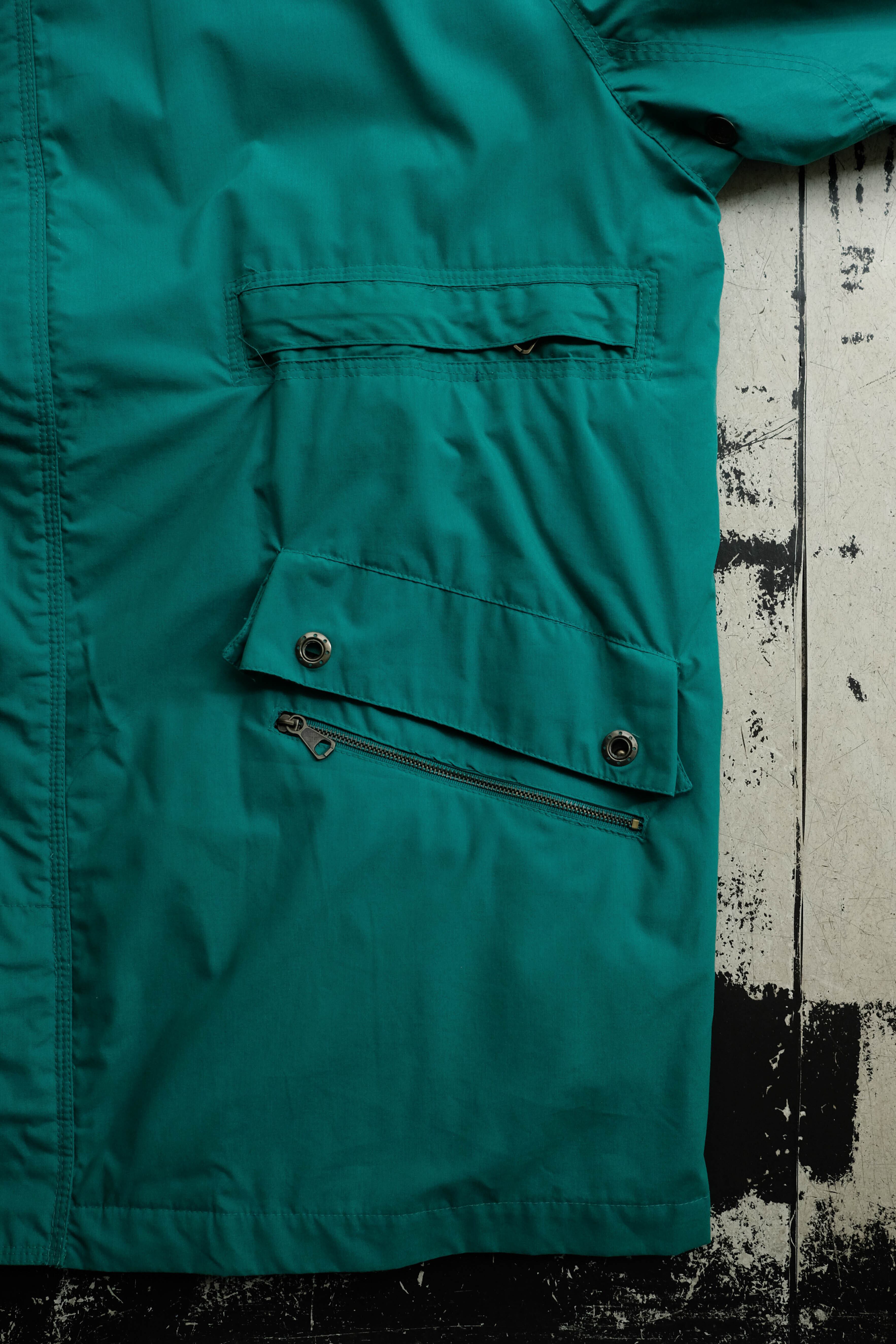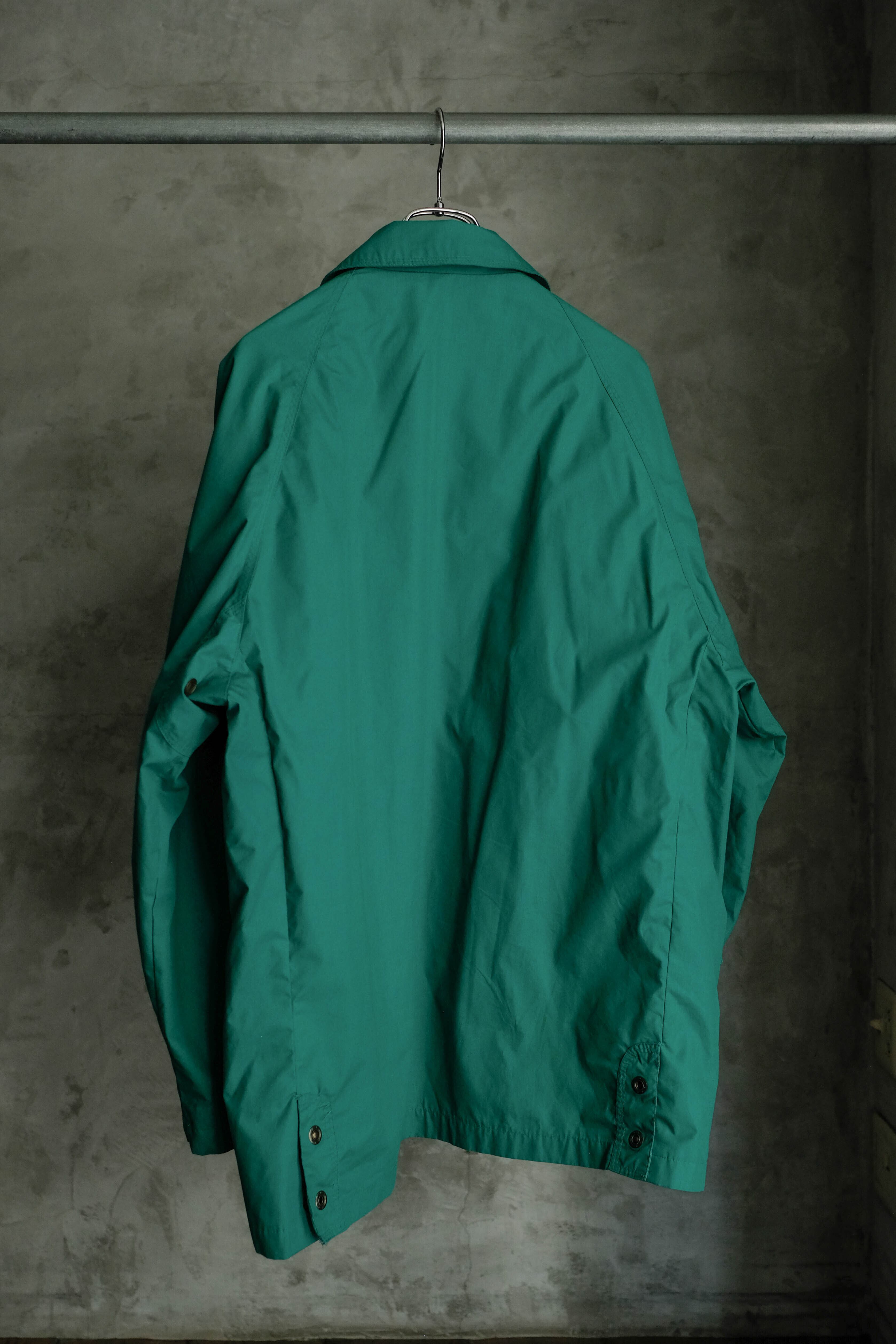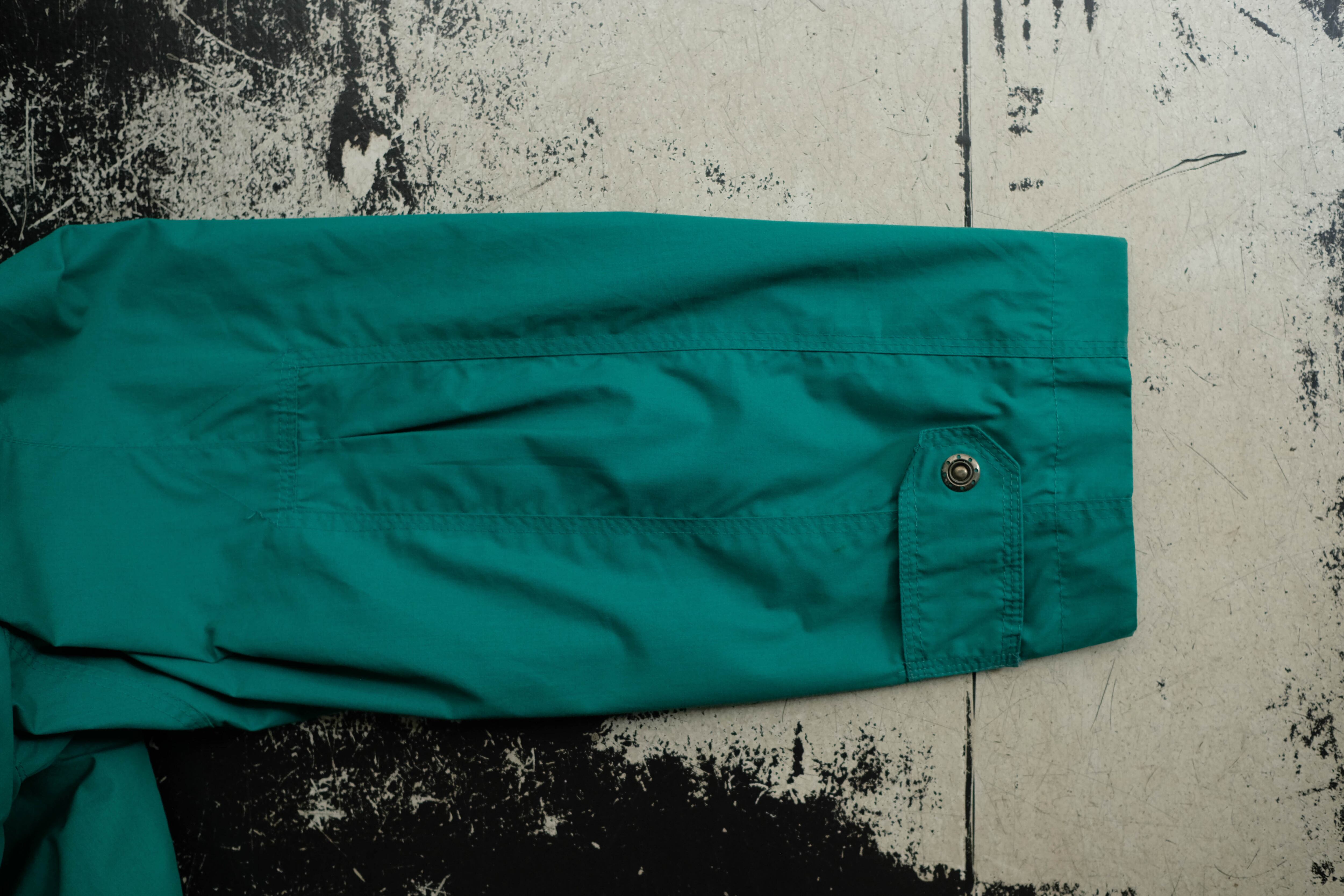 鮮やかなグリーンで、大きなスナップボタンが特徴的です。