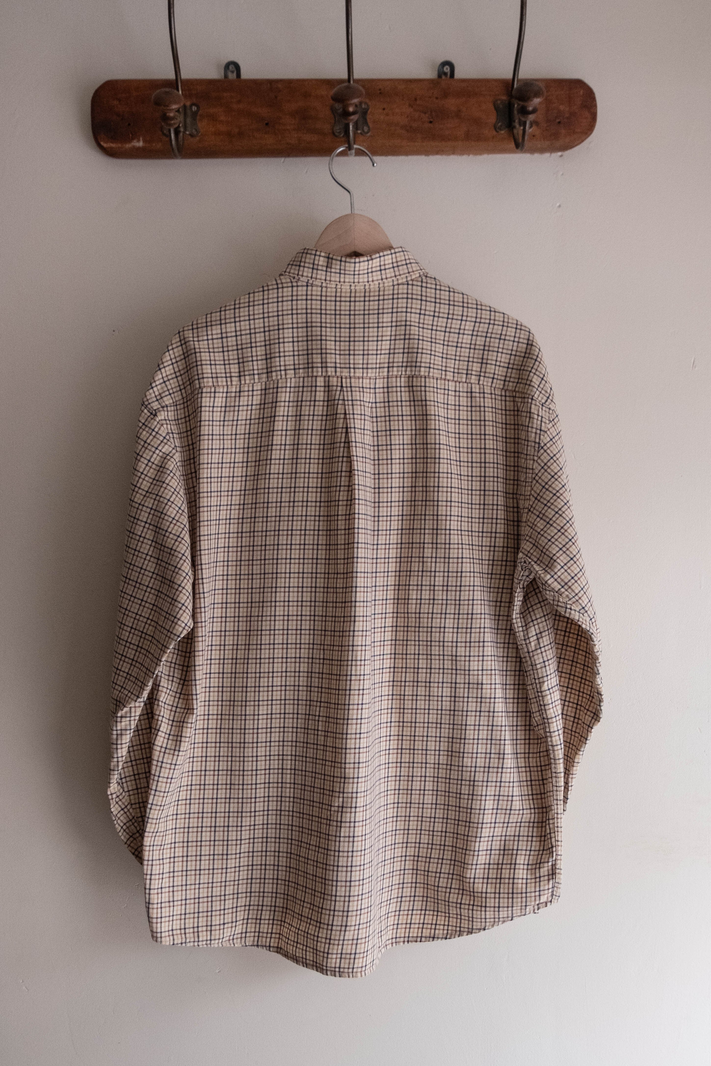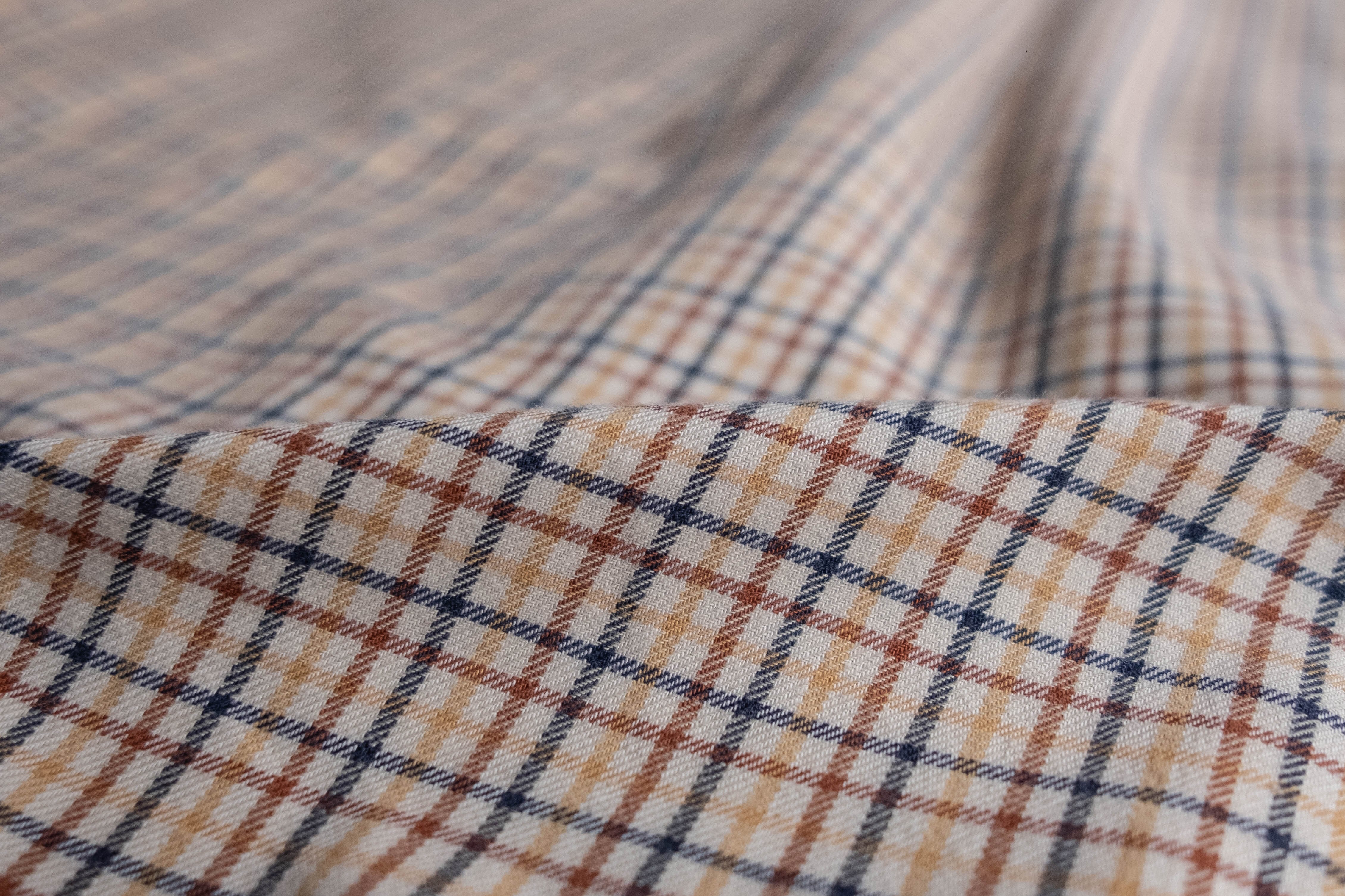 ベージュベースにブラウン、イエロー、ネイビーで細かくチェック柄が入ります。