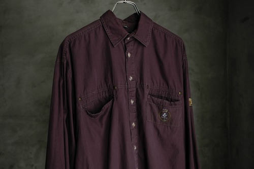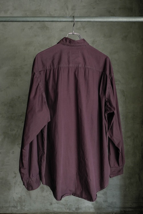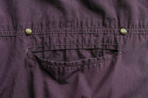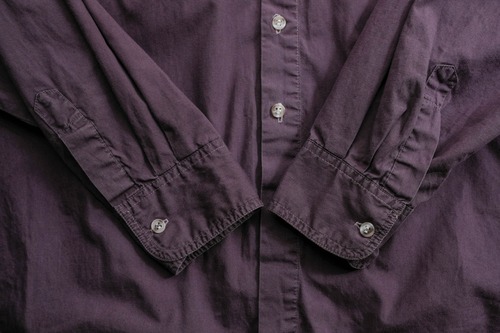 深いパープルカラーと胸ポケットのデザインが印象的な一着。