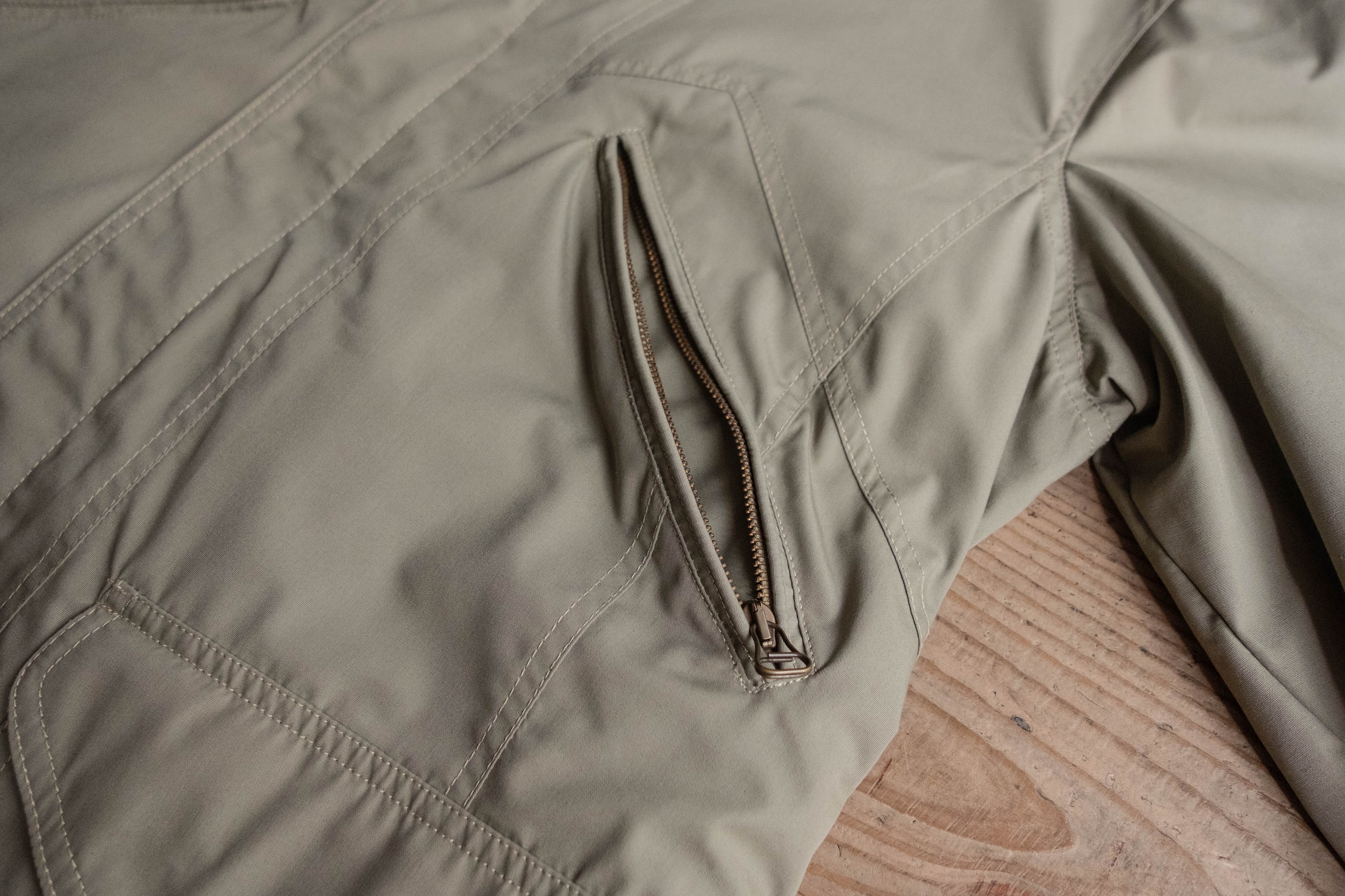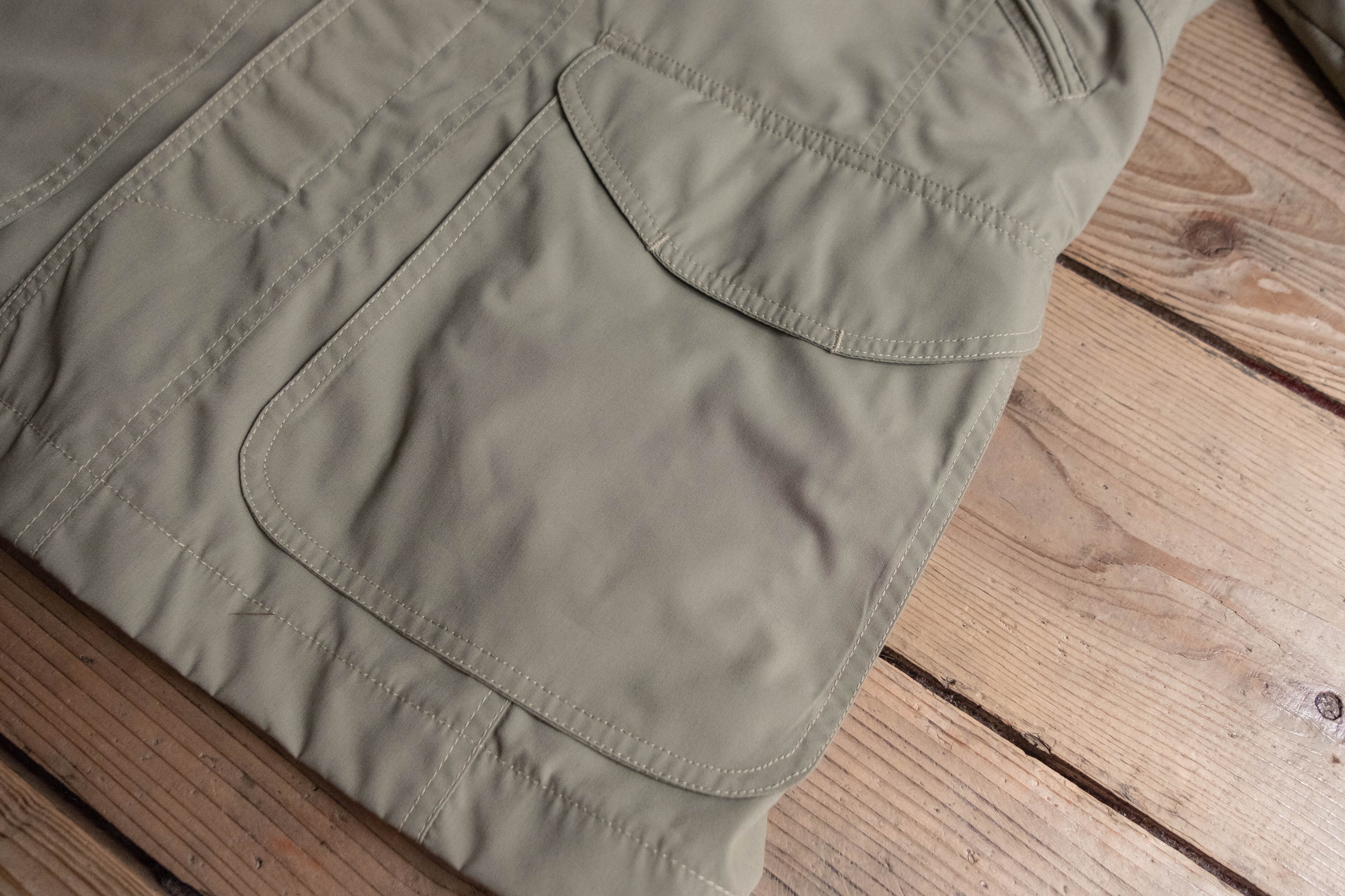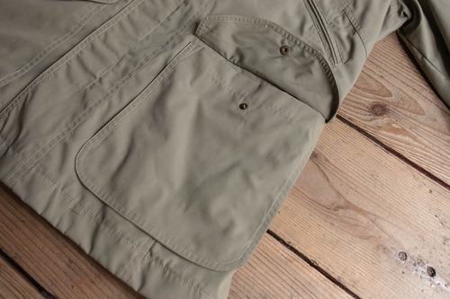 八の字の入るハンドウォームポケットや、大きめのフラップポケット、綺麗な袖付けや背面の絞りなど、ハンティングジャケットながらも色も相まって端正な見た目のジャケットです。