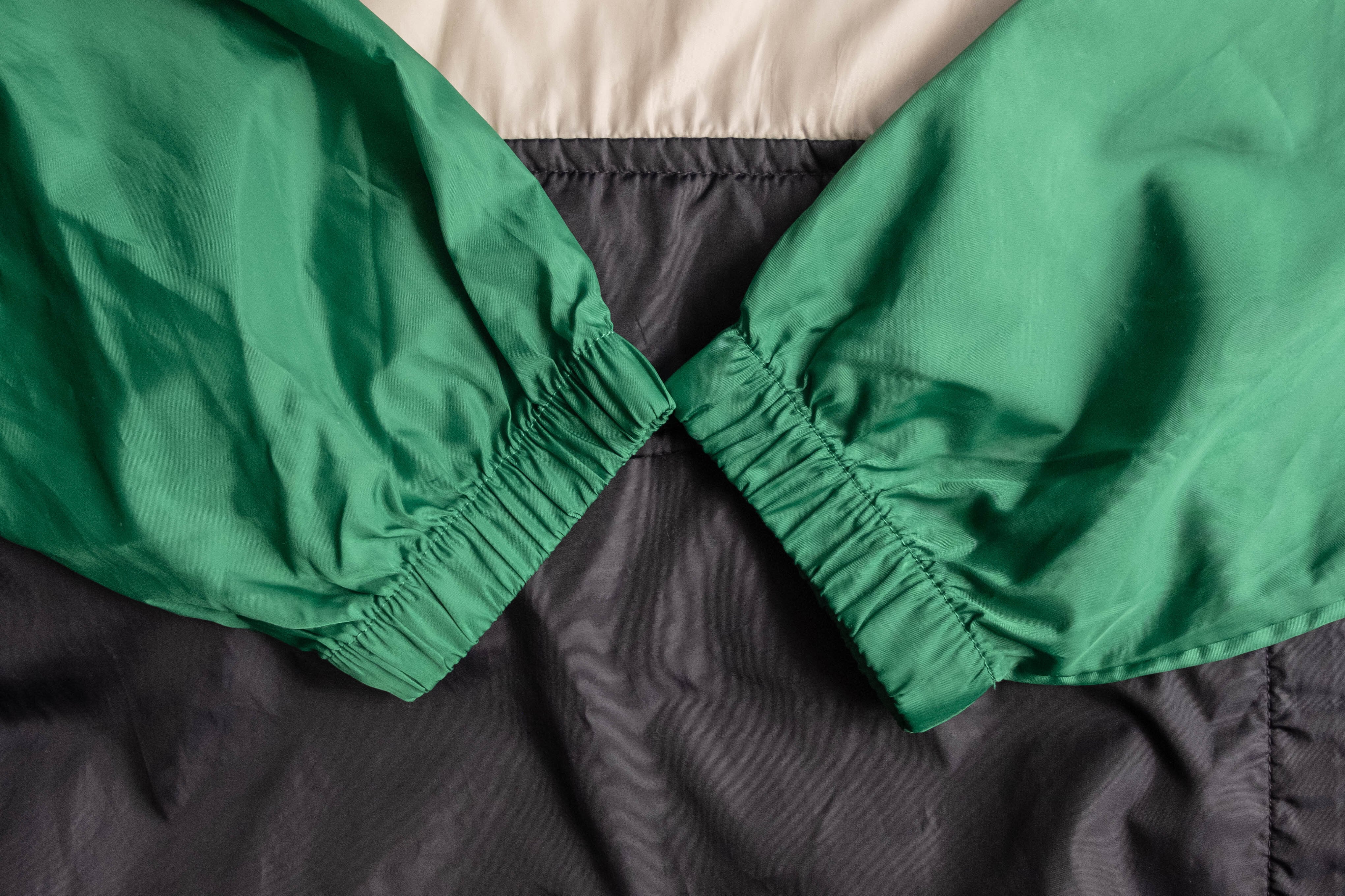 グリーン、ホワイト、ブラックの切り替えデザインが印象的な一着です。
