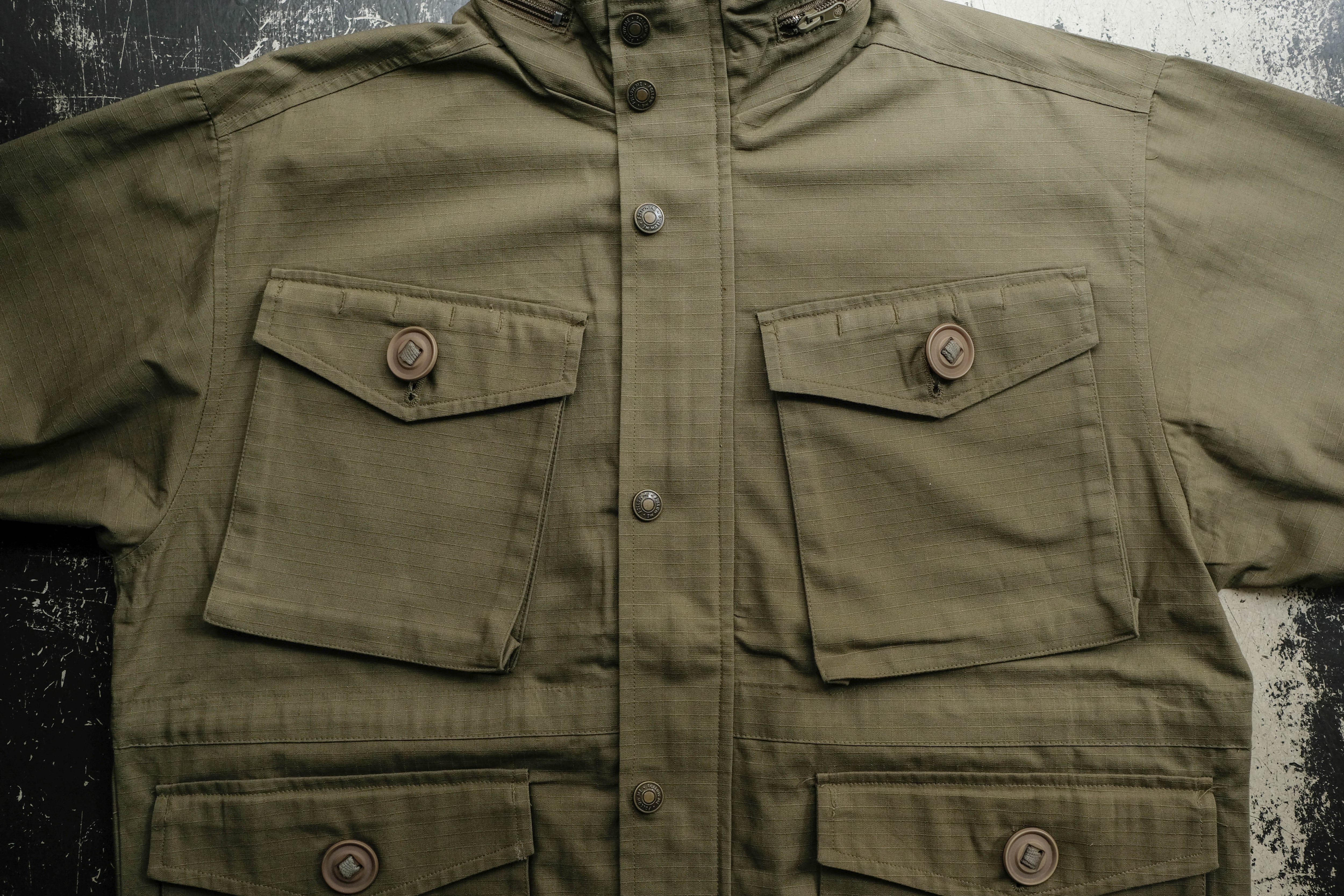 フラップポケットや収納できるフードなど、イギリス軍やカナダ軍のミリタリージャケットのようなデザイン。