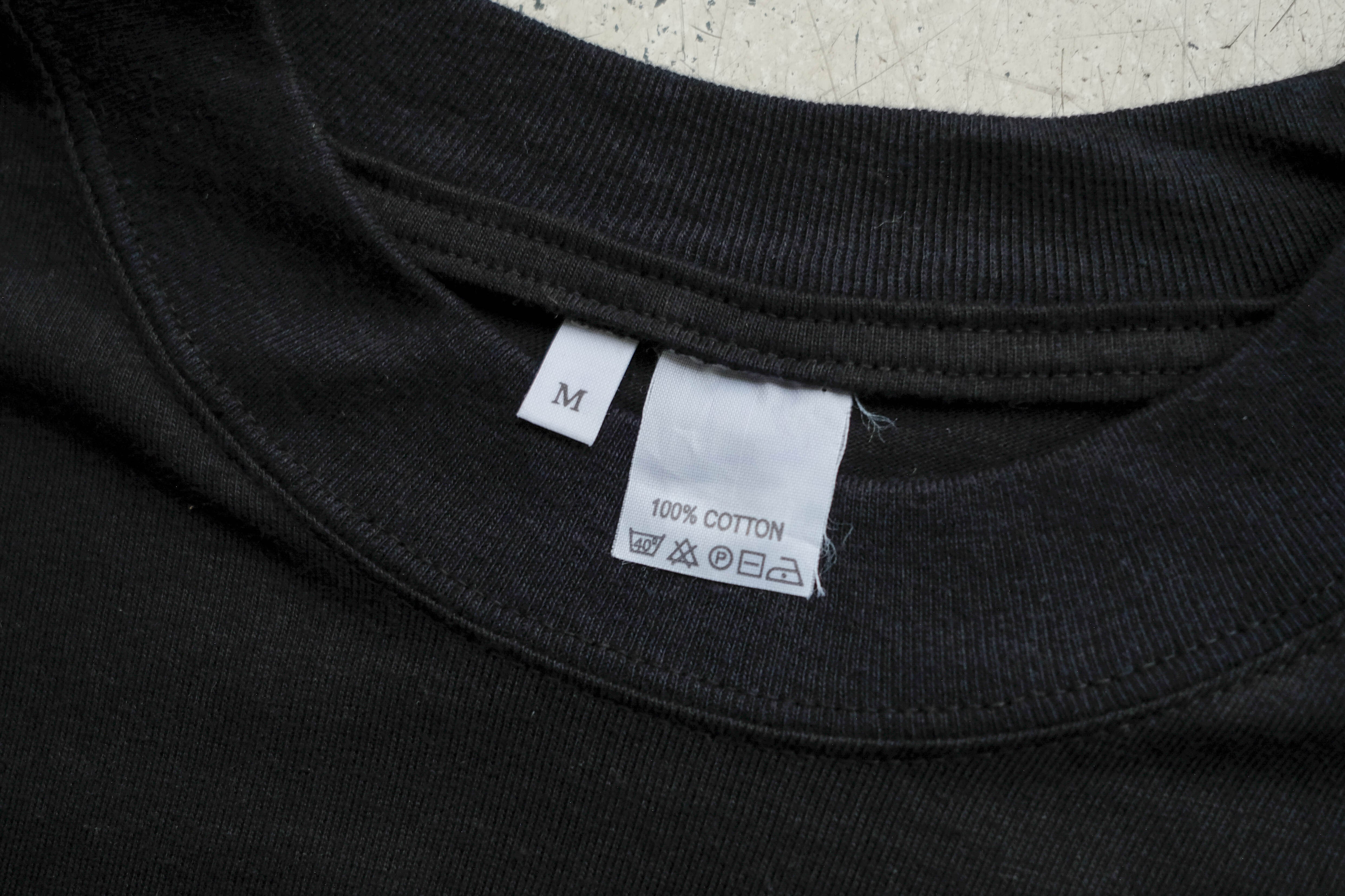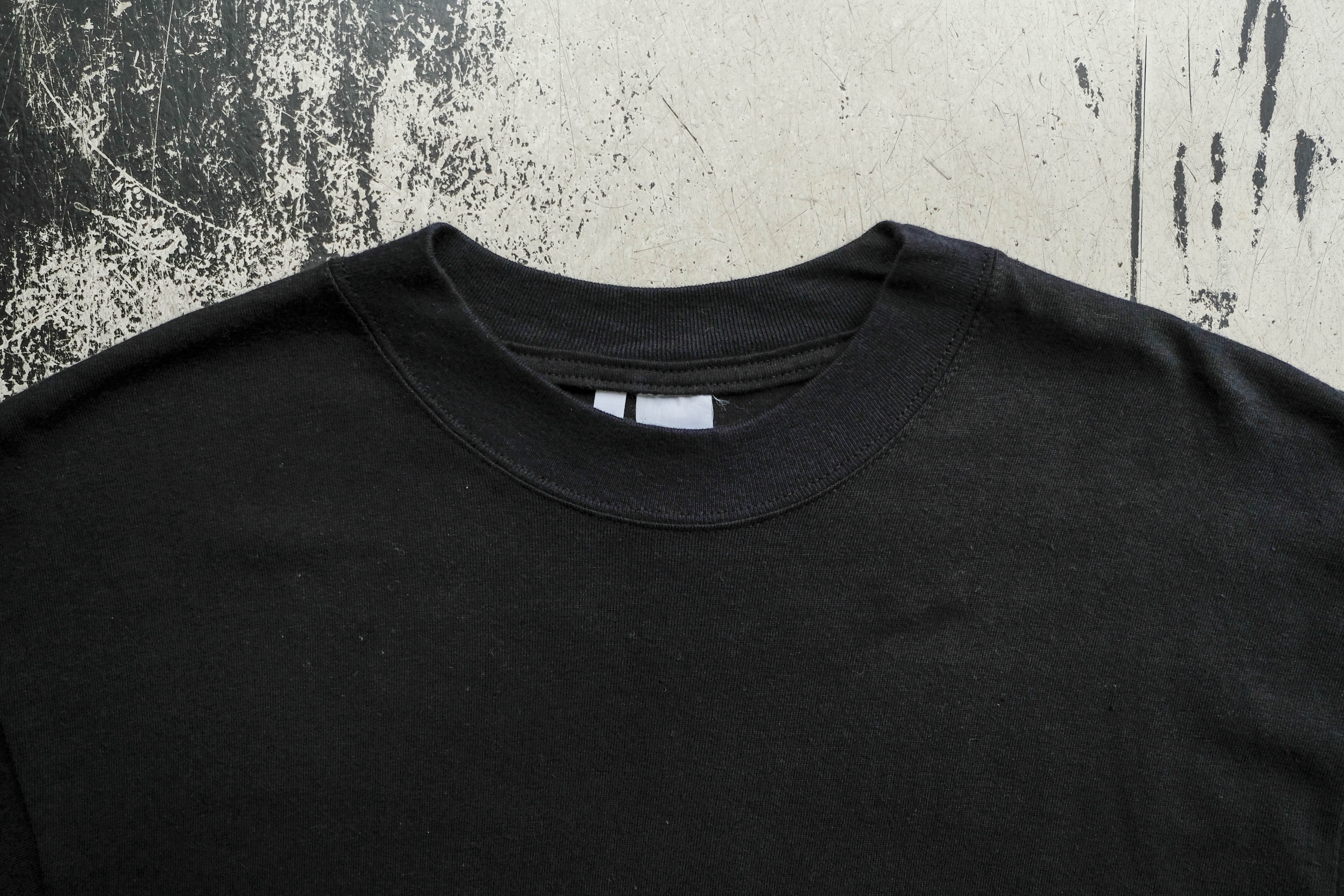 無地のボディにやや詰まり気味のクルーネックといったシンプルなデザイン。