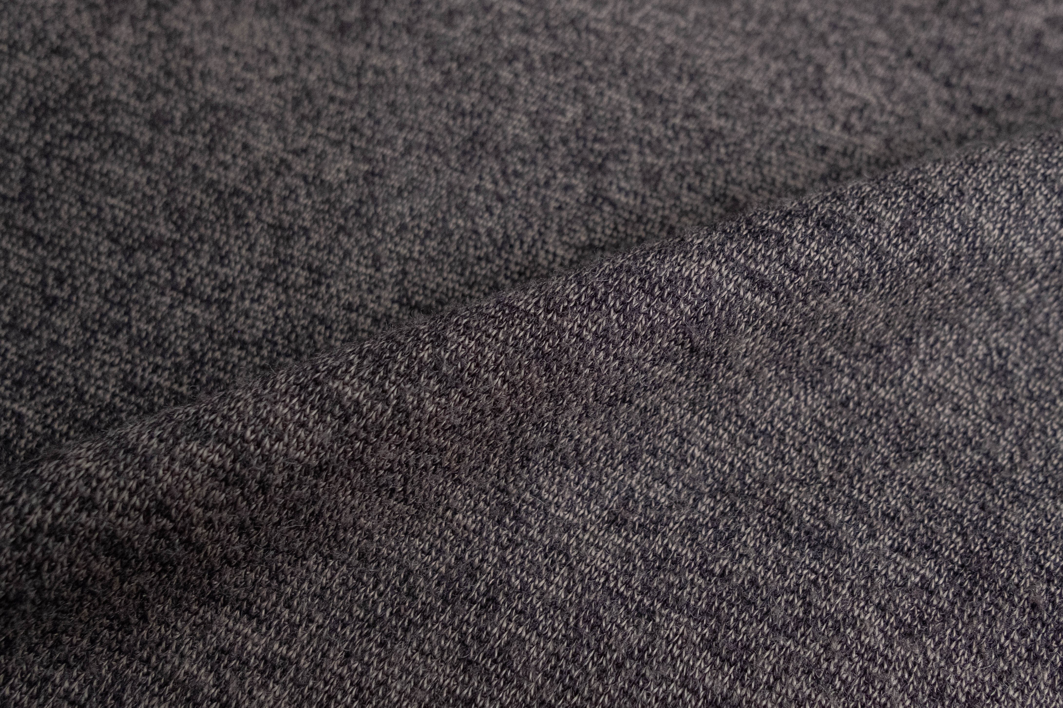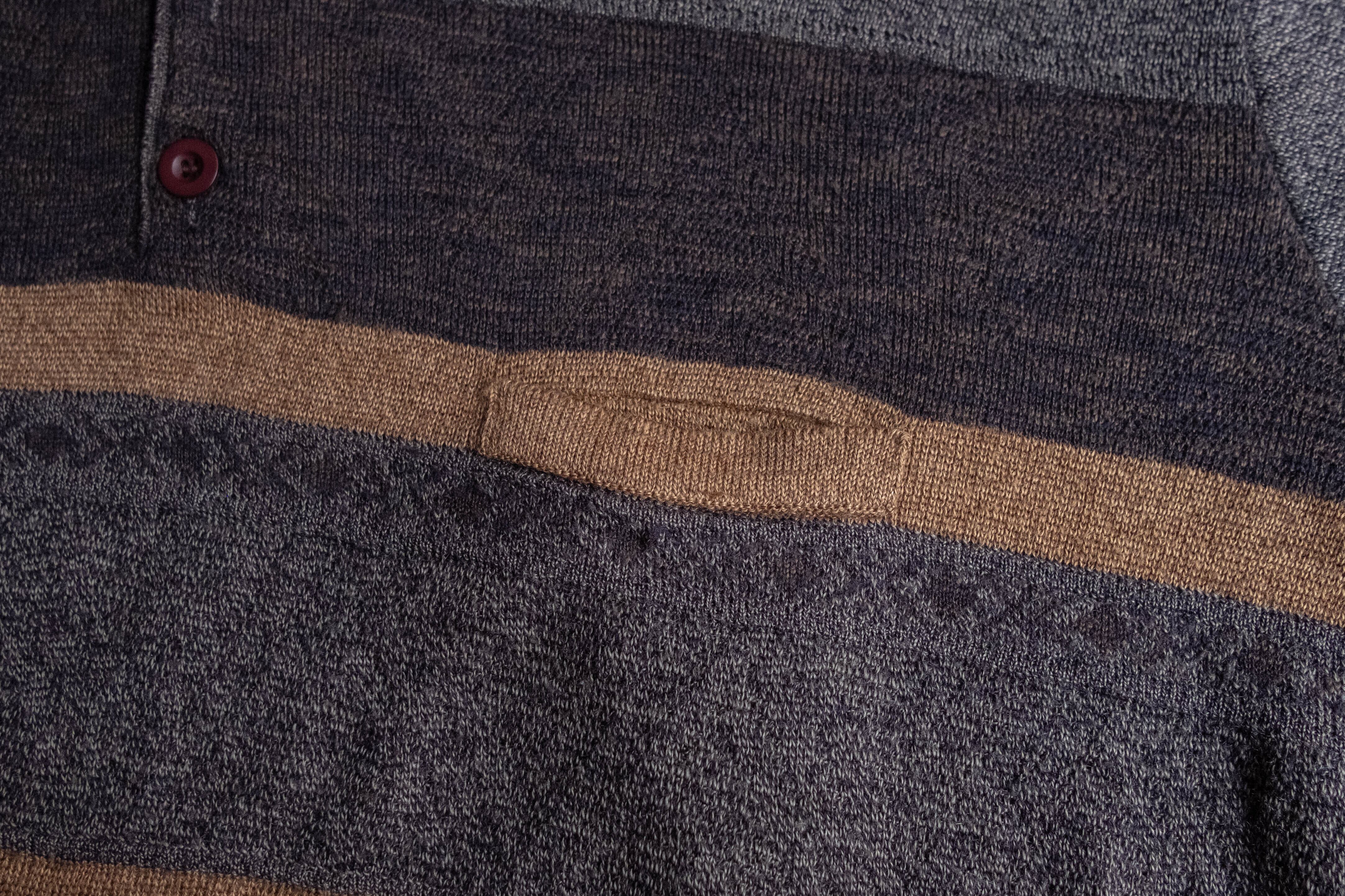 ベージュ、ブラウン、ブラックの糸が使われたメランジ生地をベースに、ブラウン、ベージュ、黄土色のボーダーが入ります。