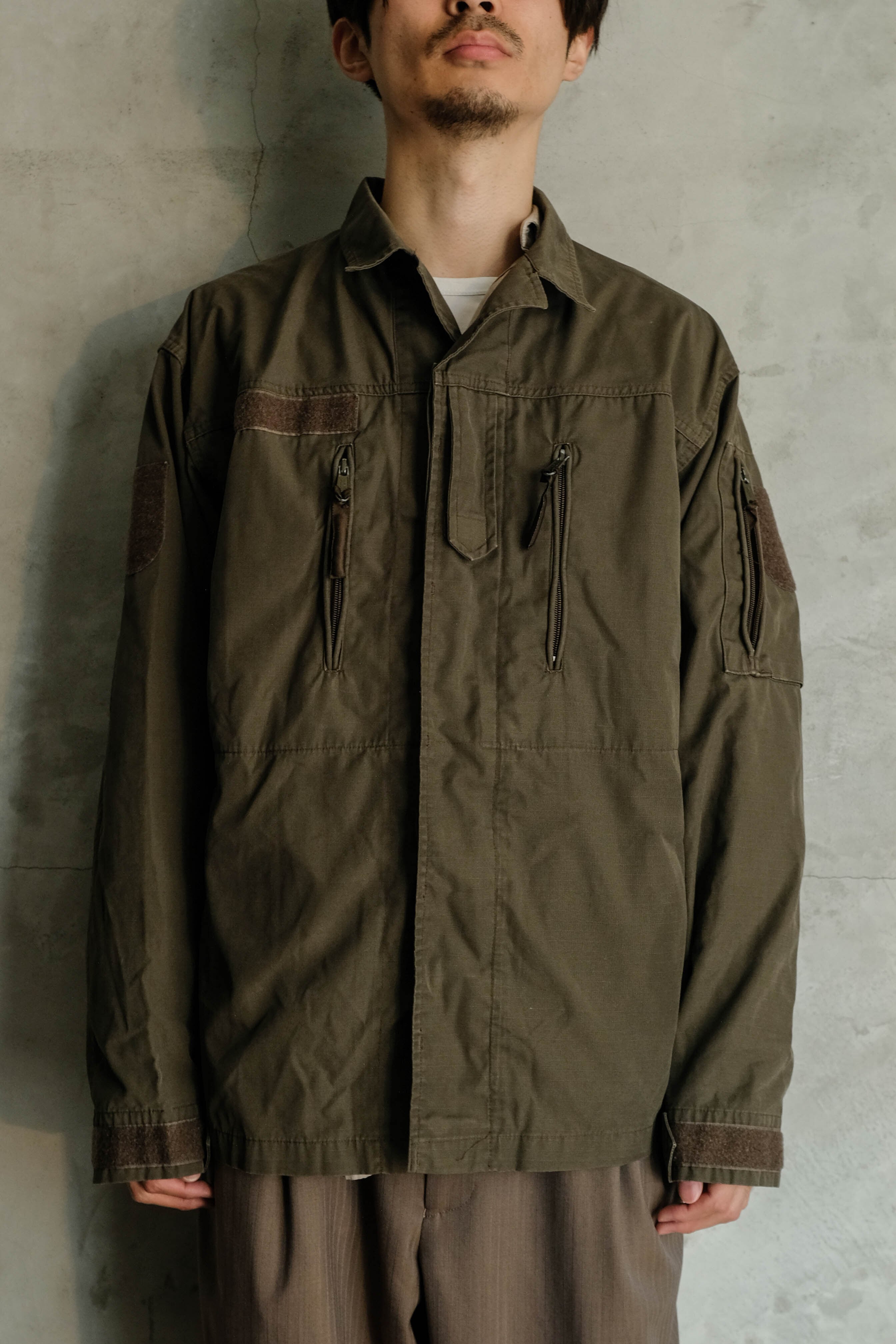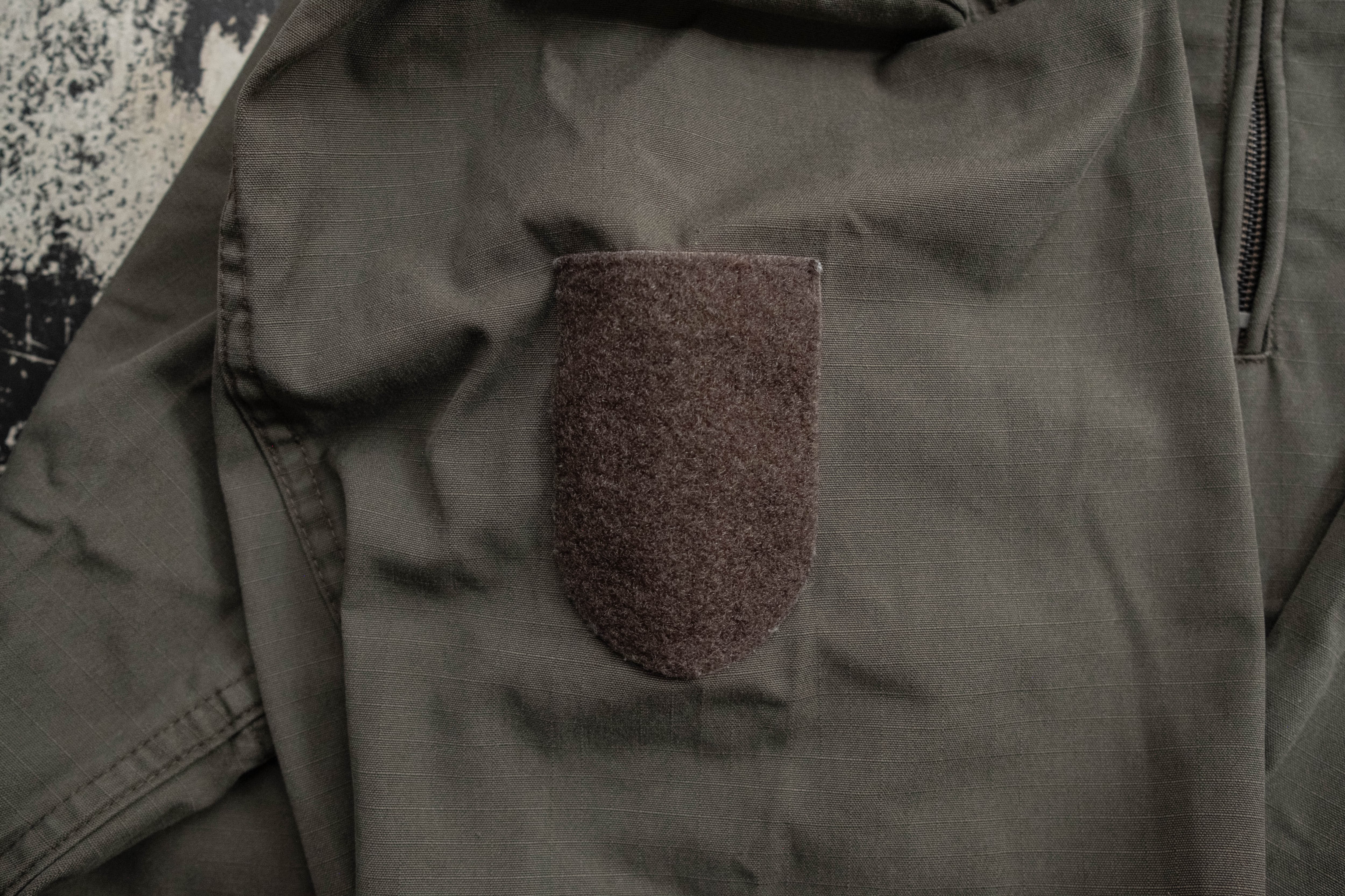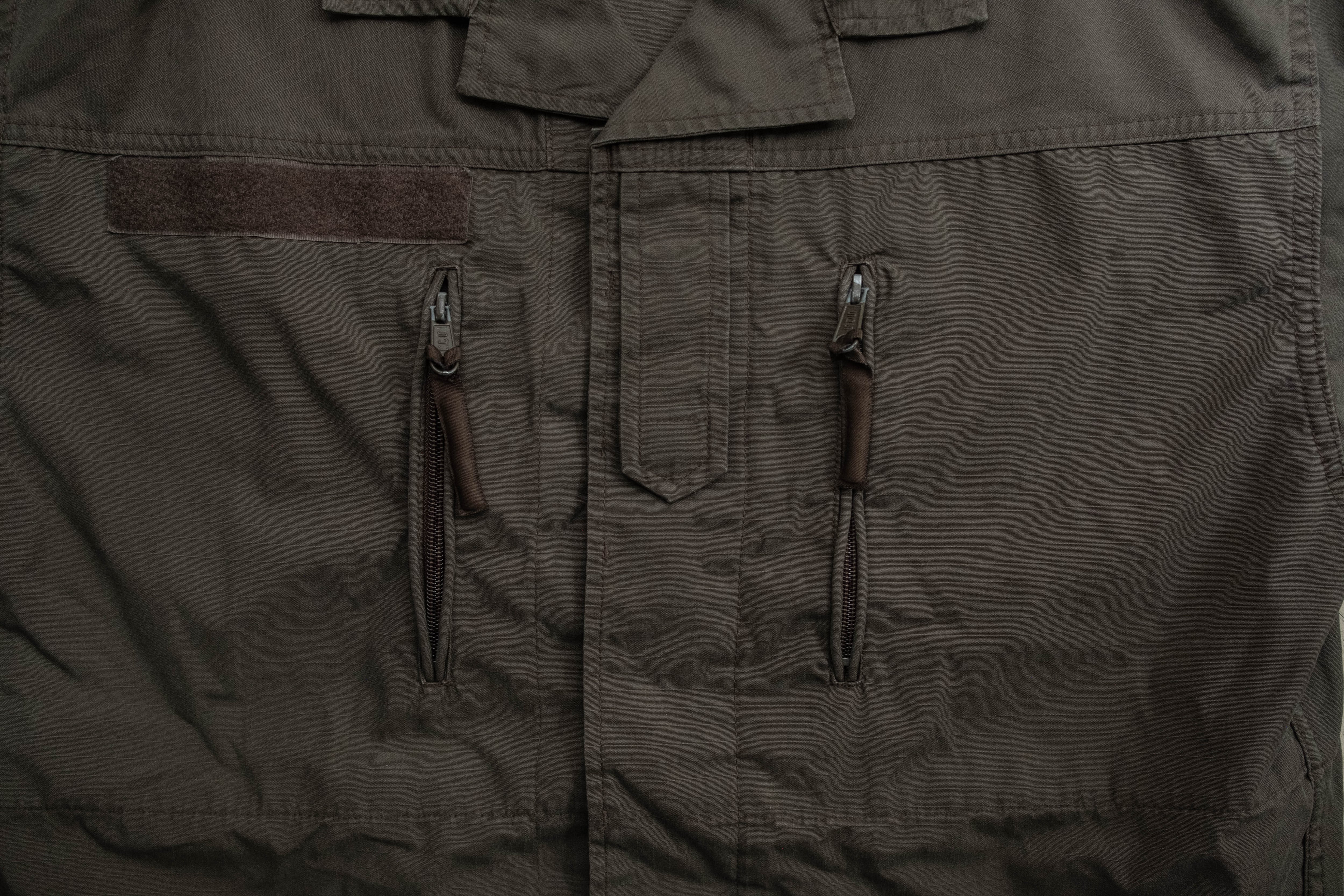 胸部分につくジップ開閉式の縦型ポケット、ベルクロデザインが特徴的な一着です。