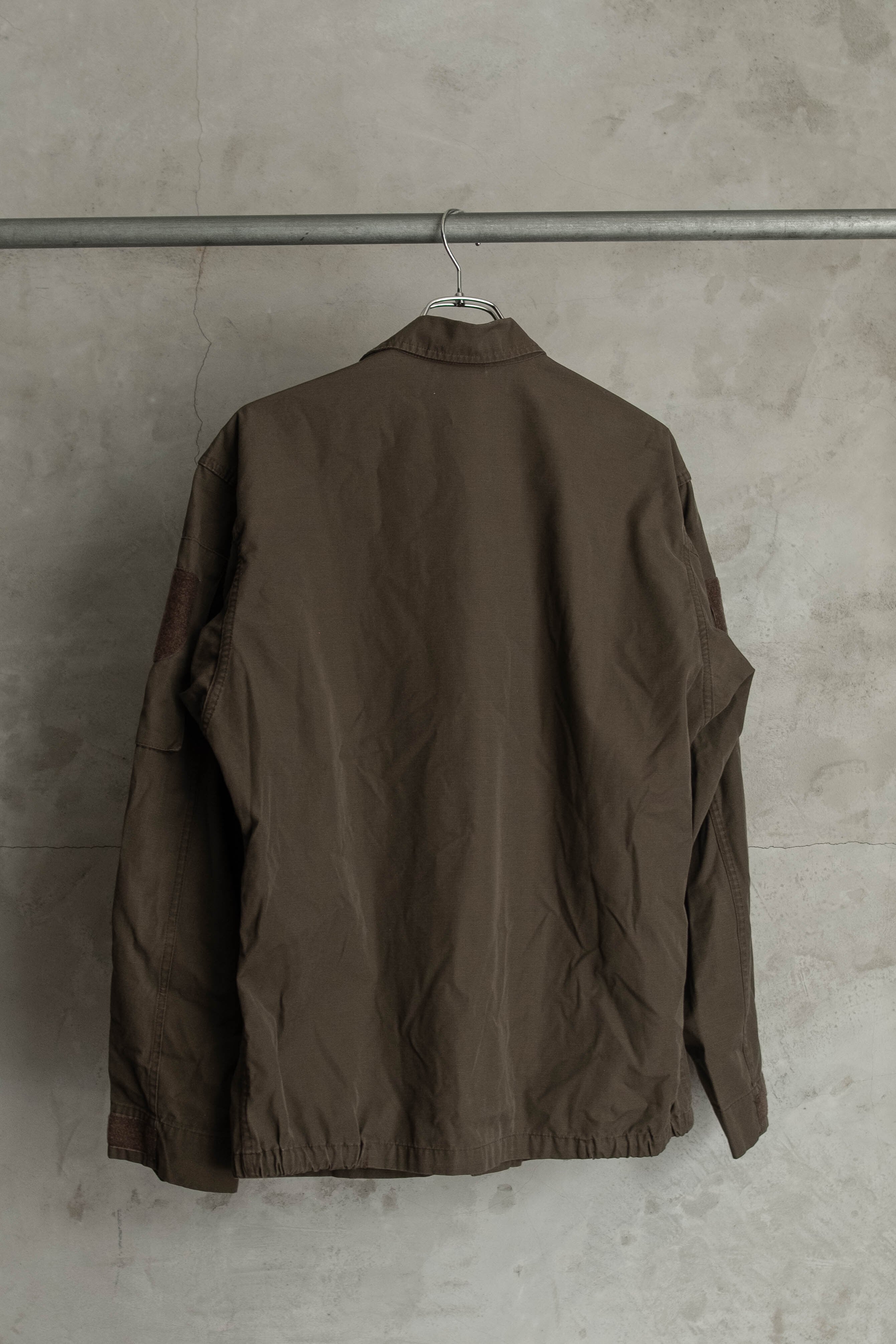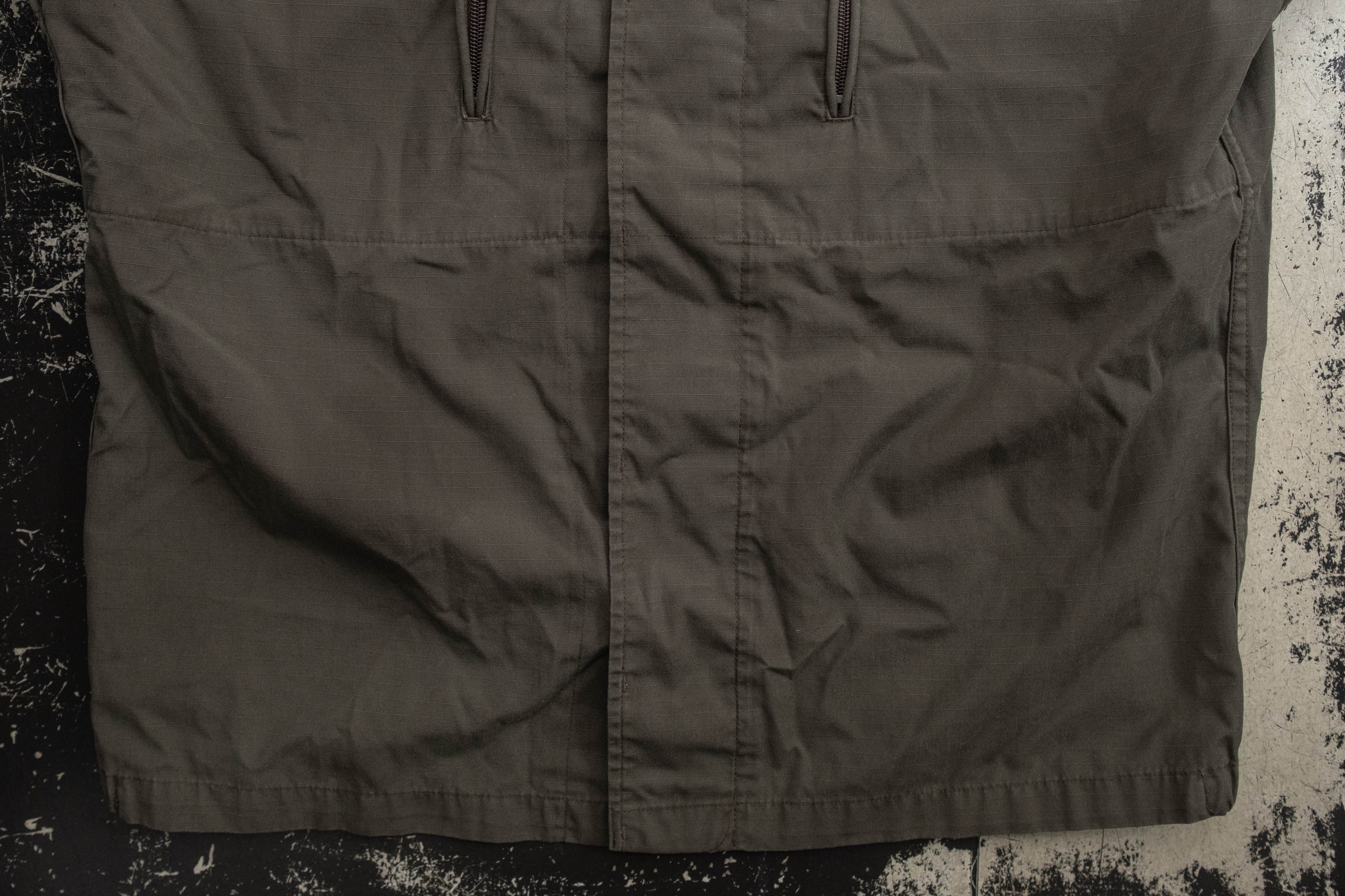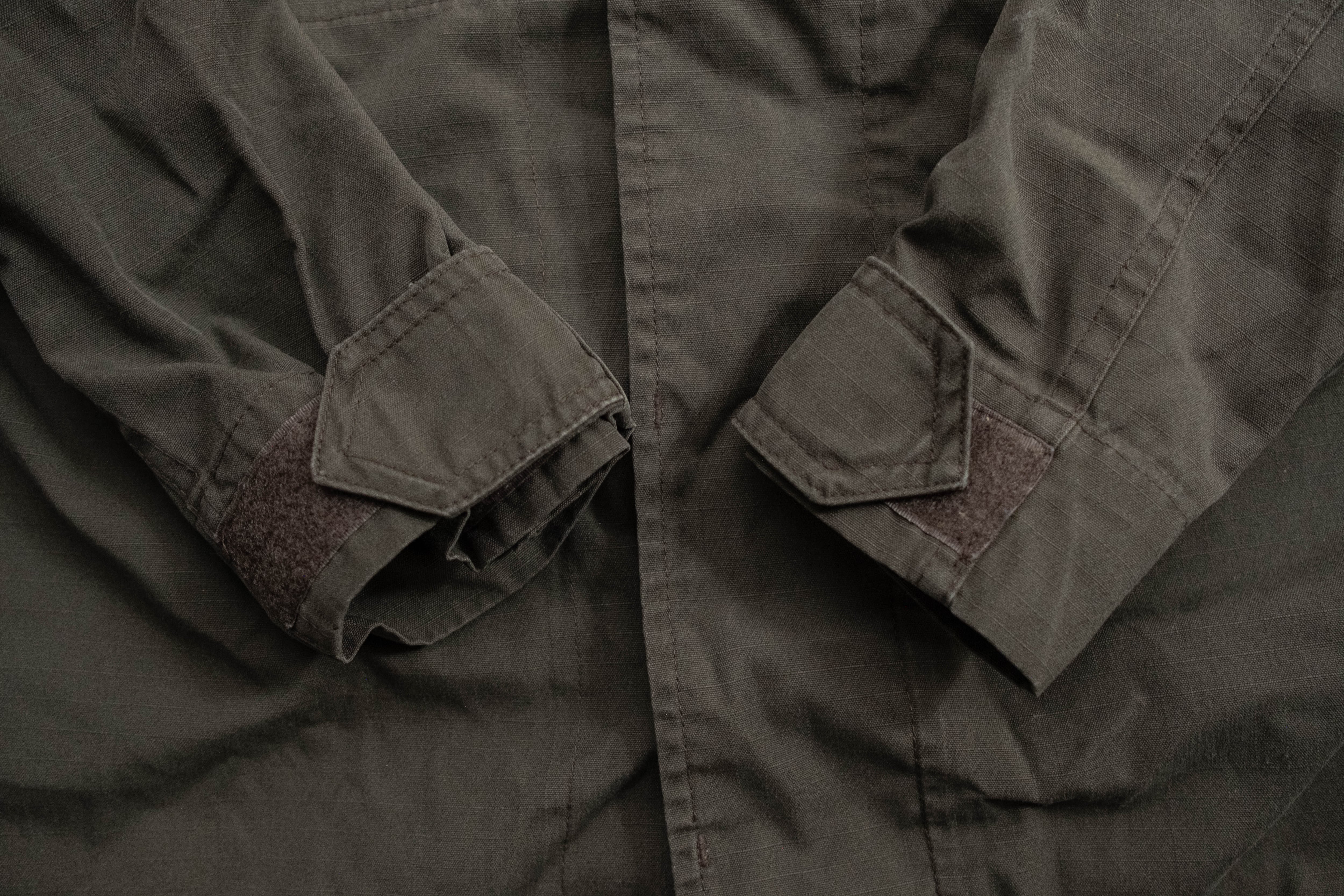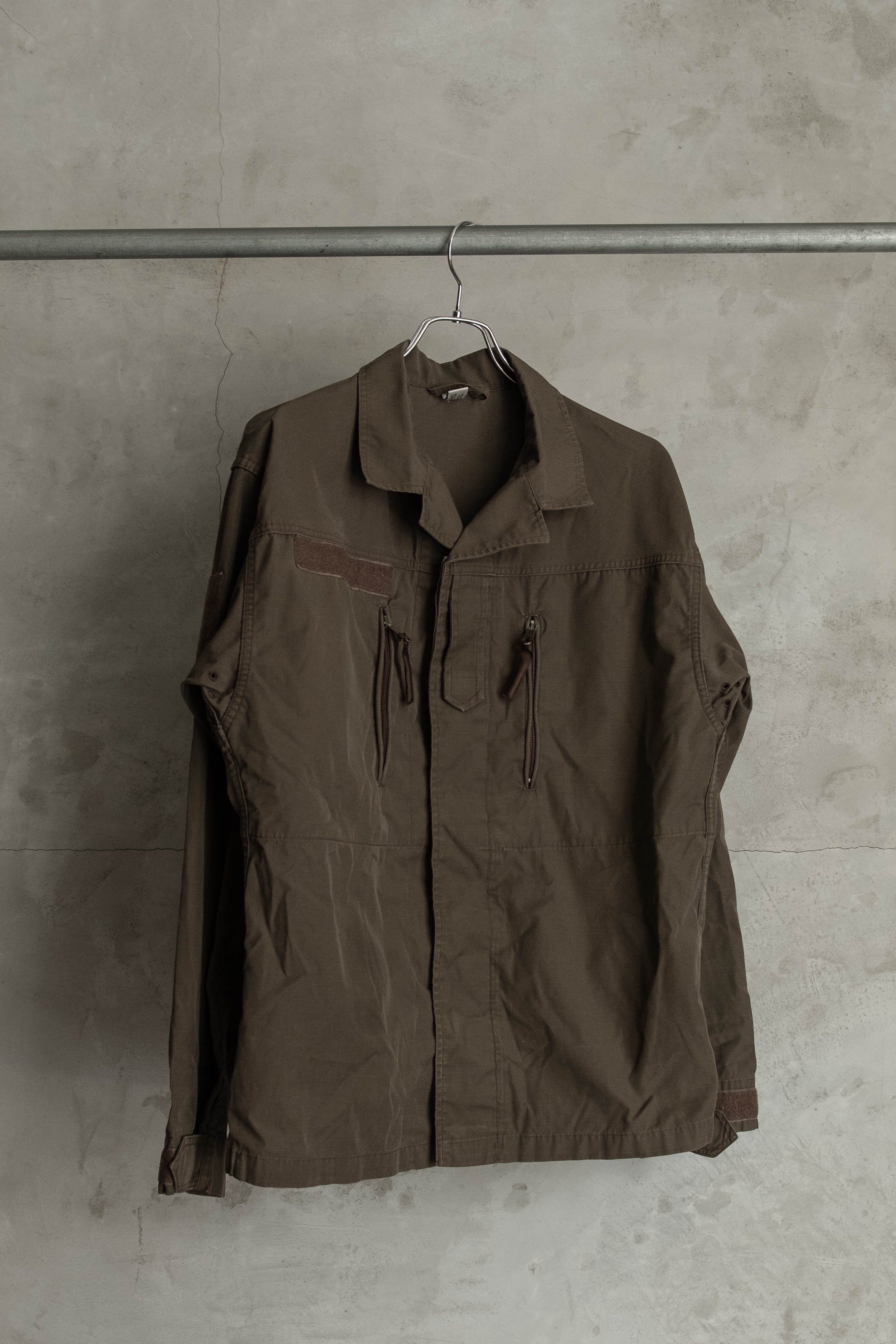 胸部分につくジップ開閉式の縦型ポケット、ベルクロデザインが特徴的な一着です。