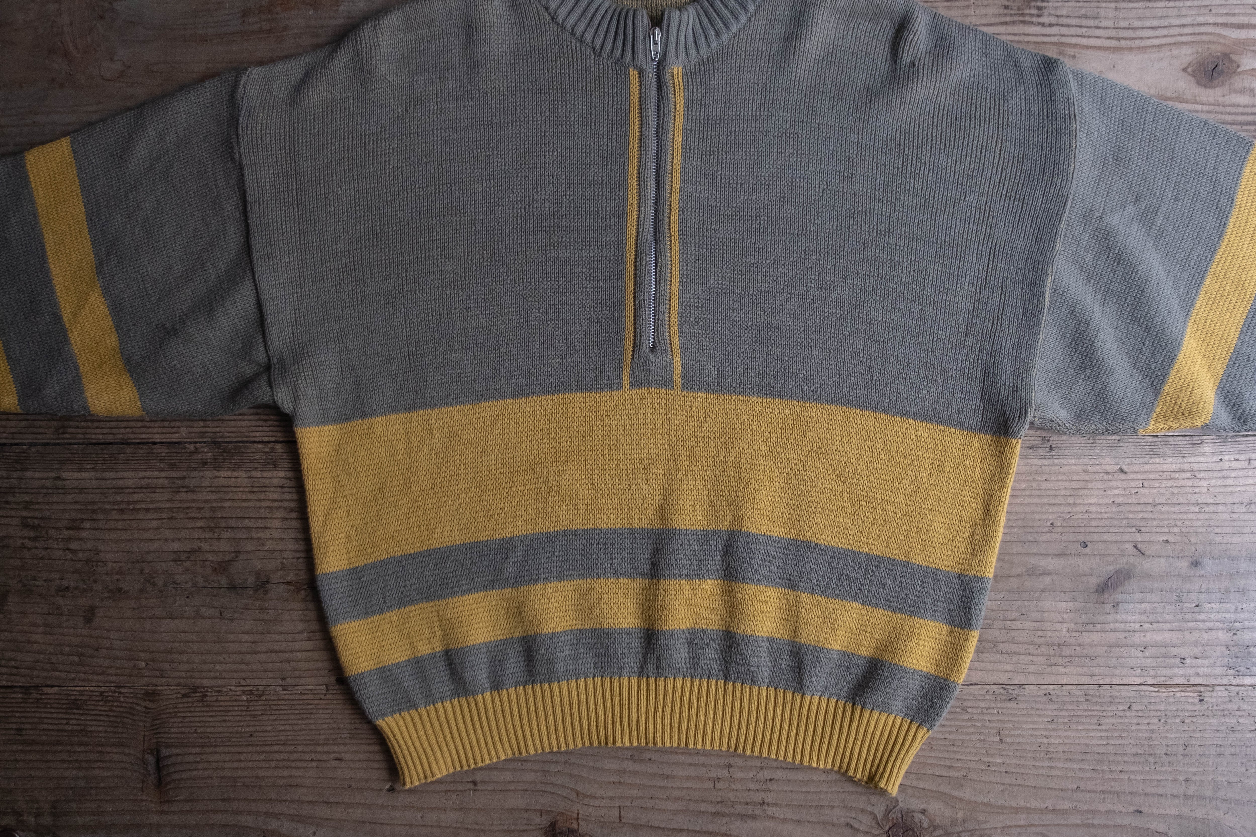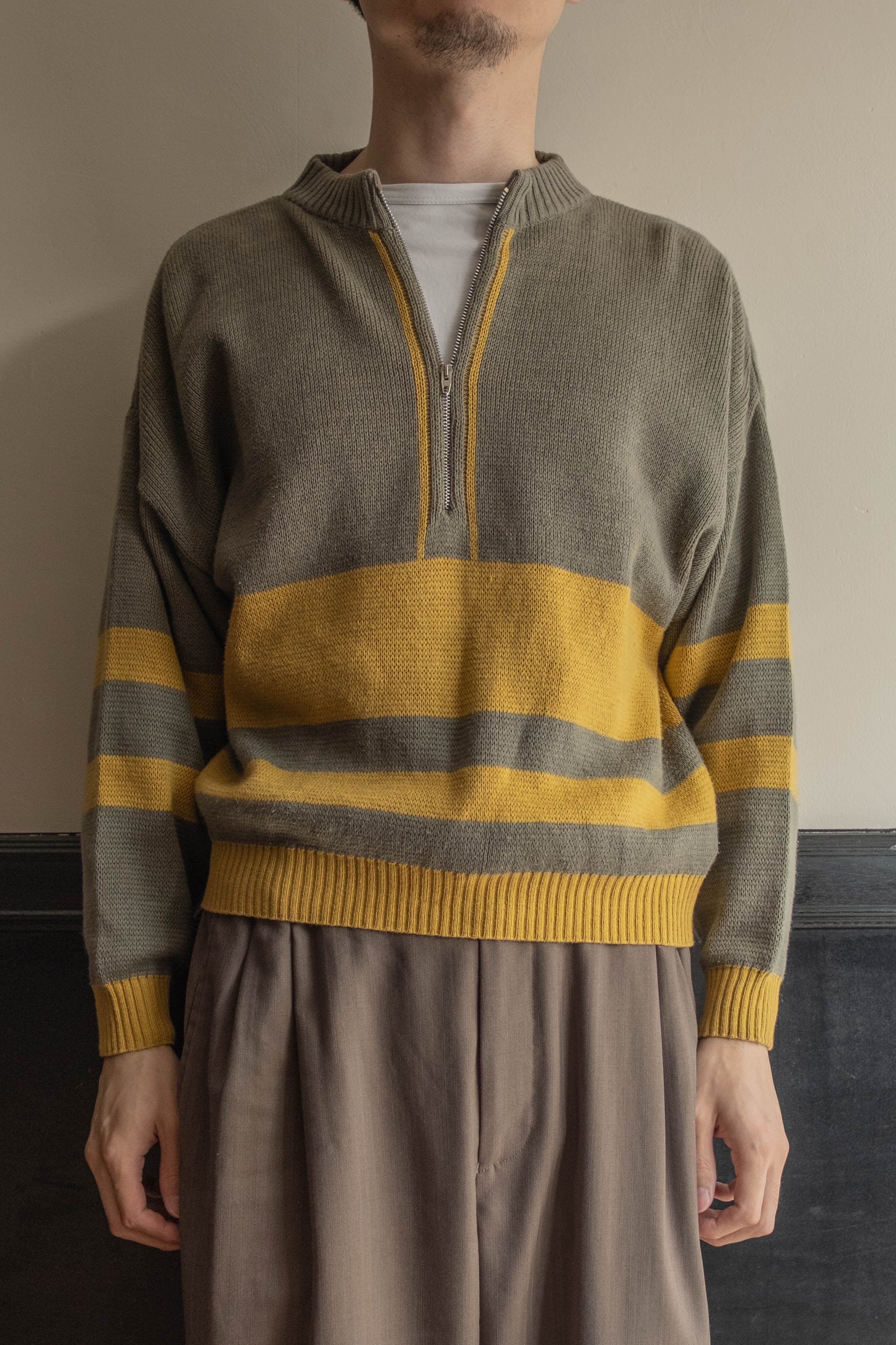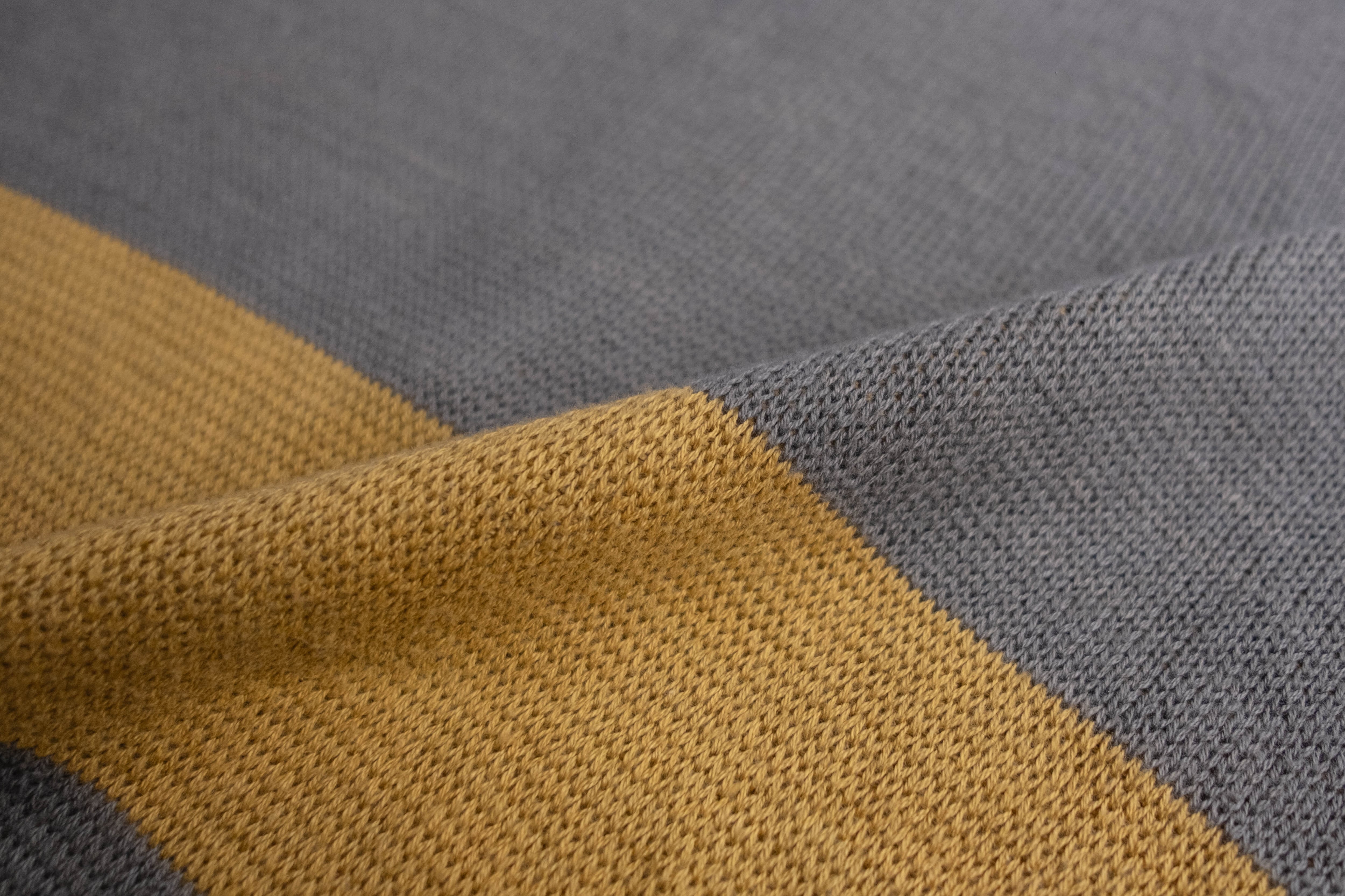 グレーベージュのようなカラーをベースに、落ち着いたトーンのイエローのボーダーが入ります。