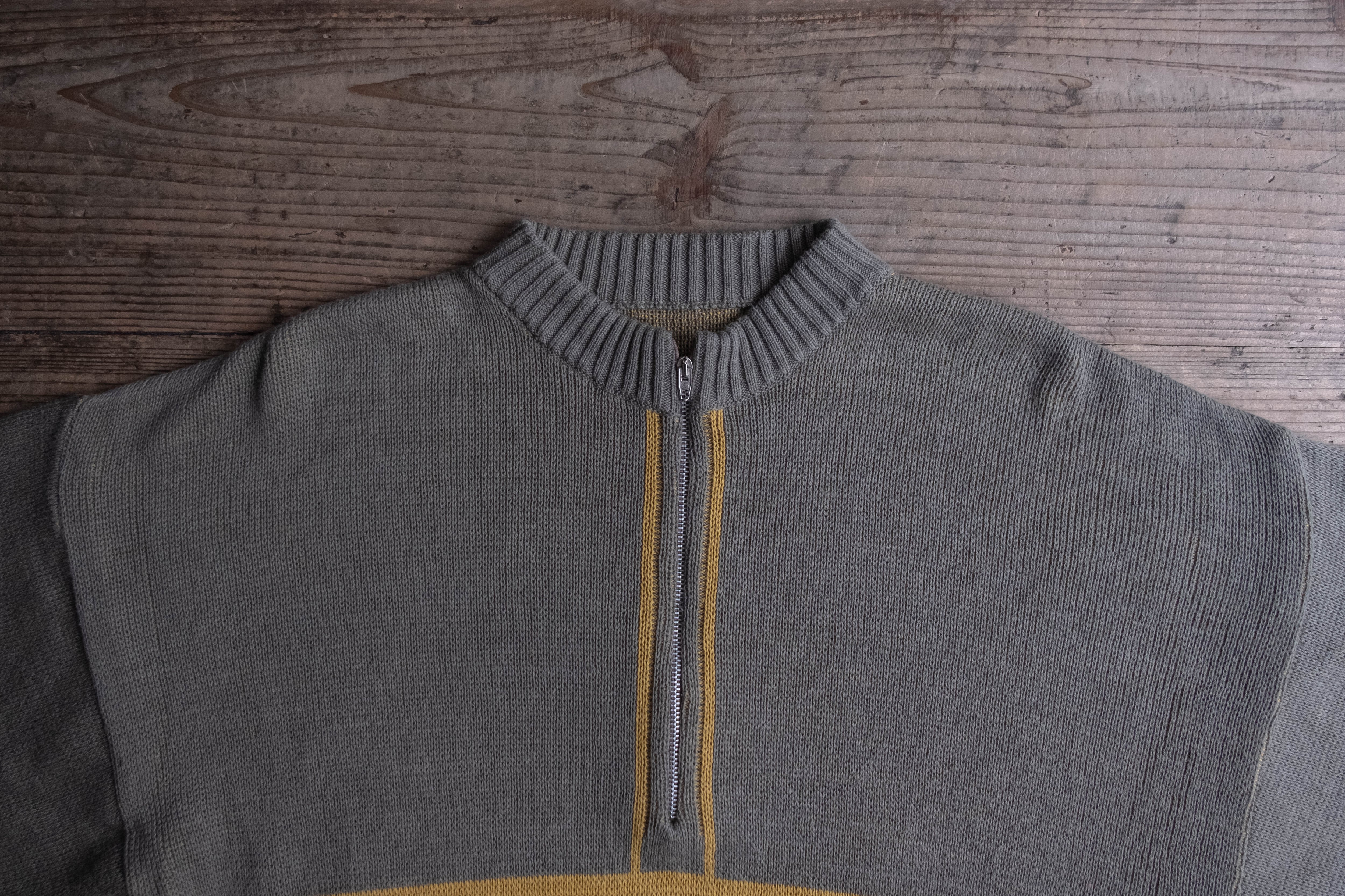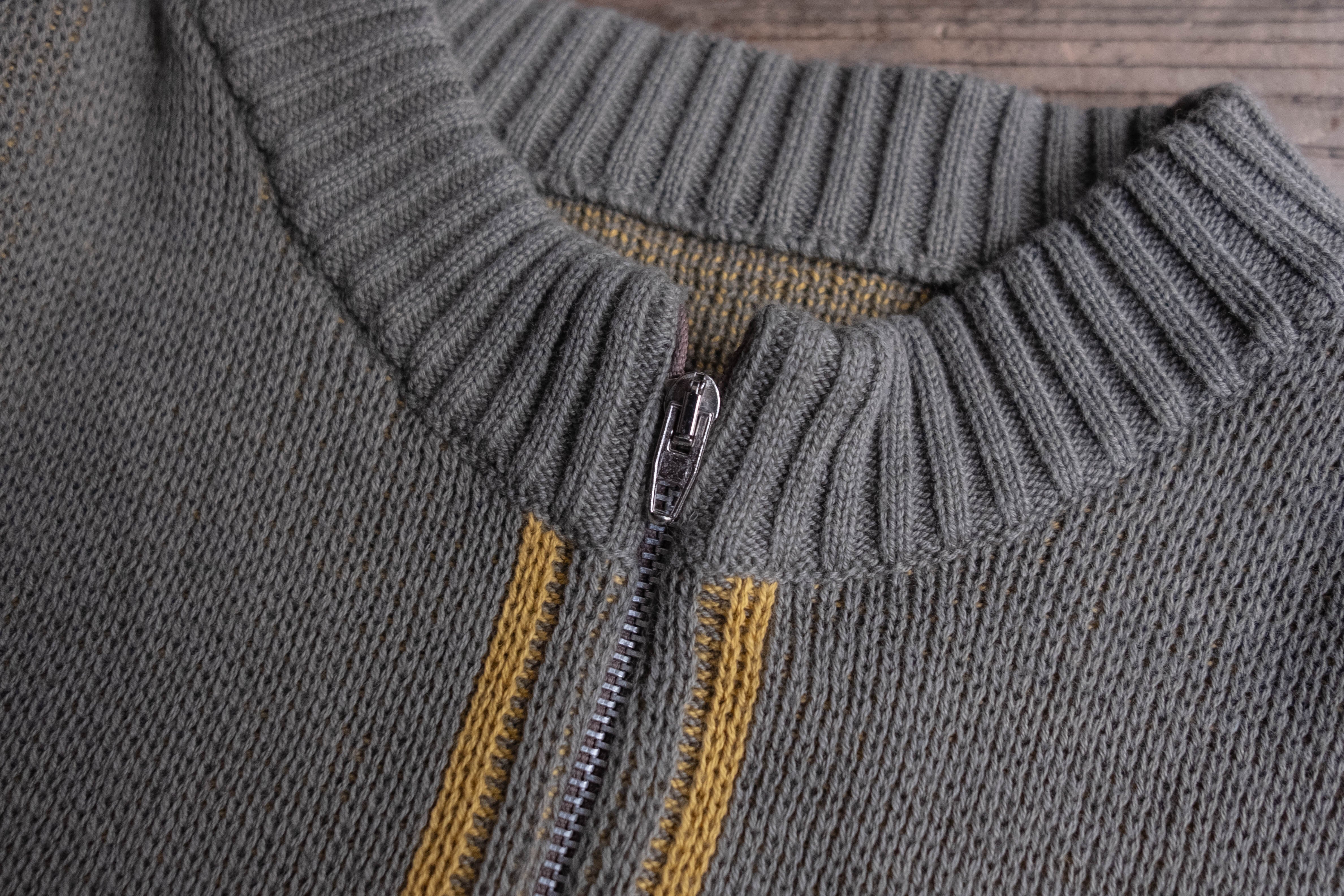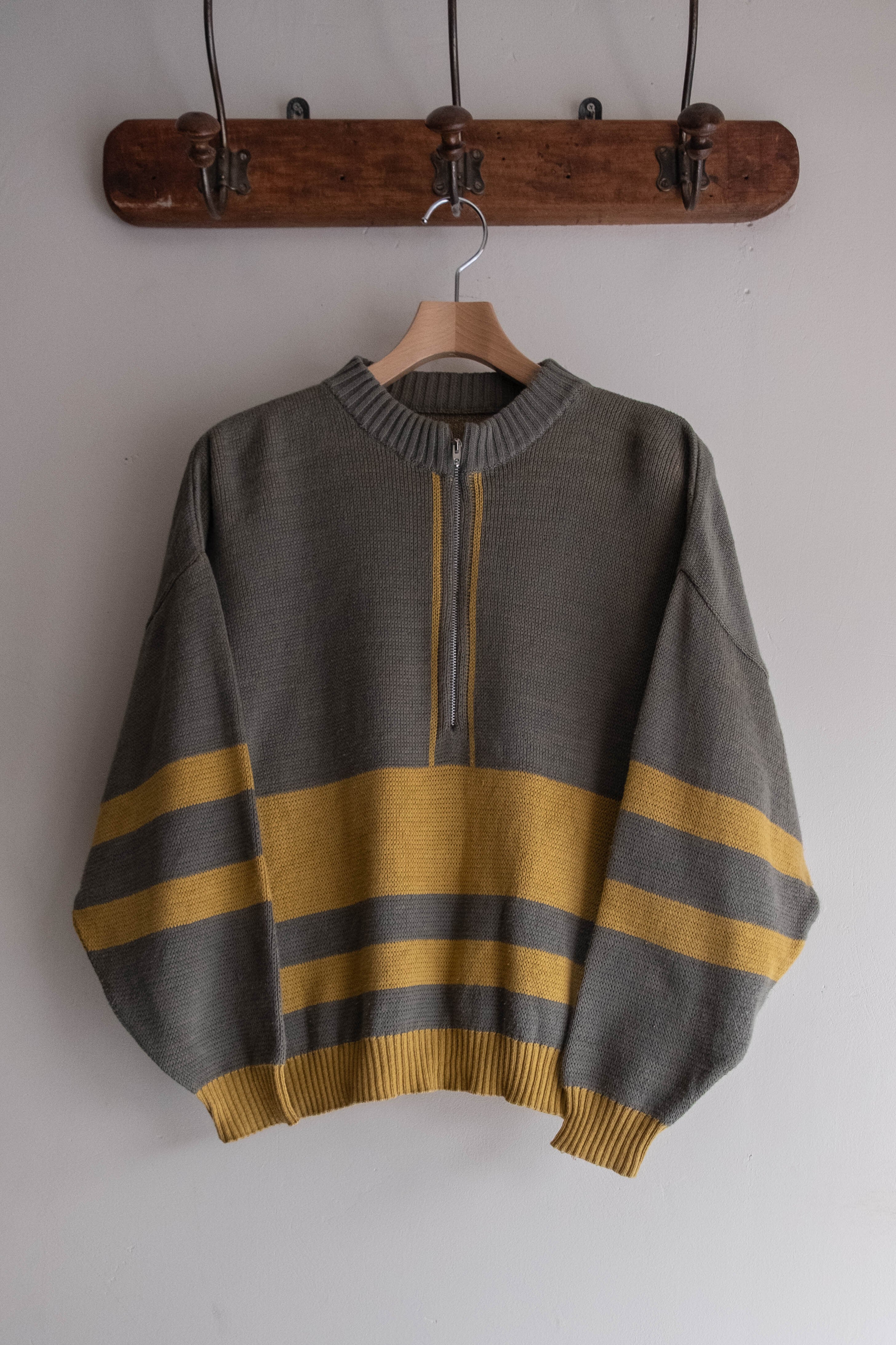 グレーベージュのようなカラーをベースに、落ち着いたトーンのイエローのボーダーが入ります。