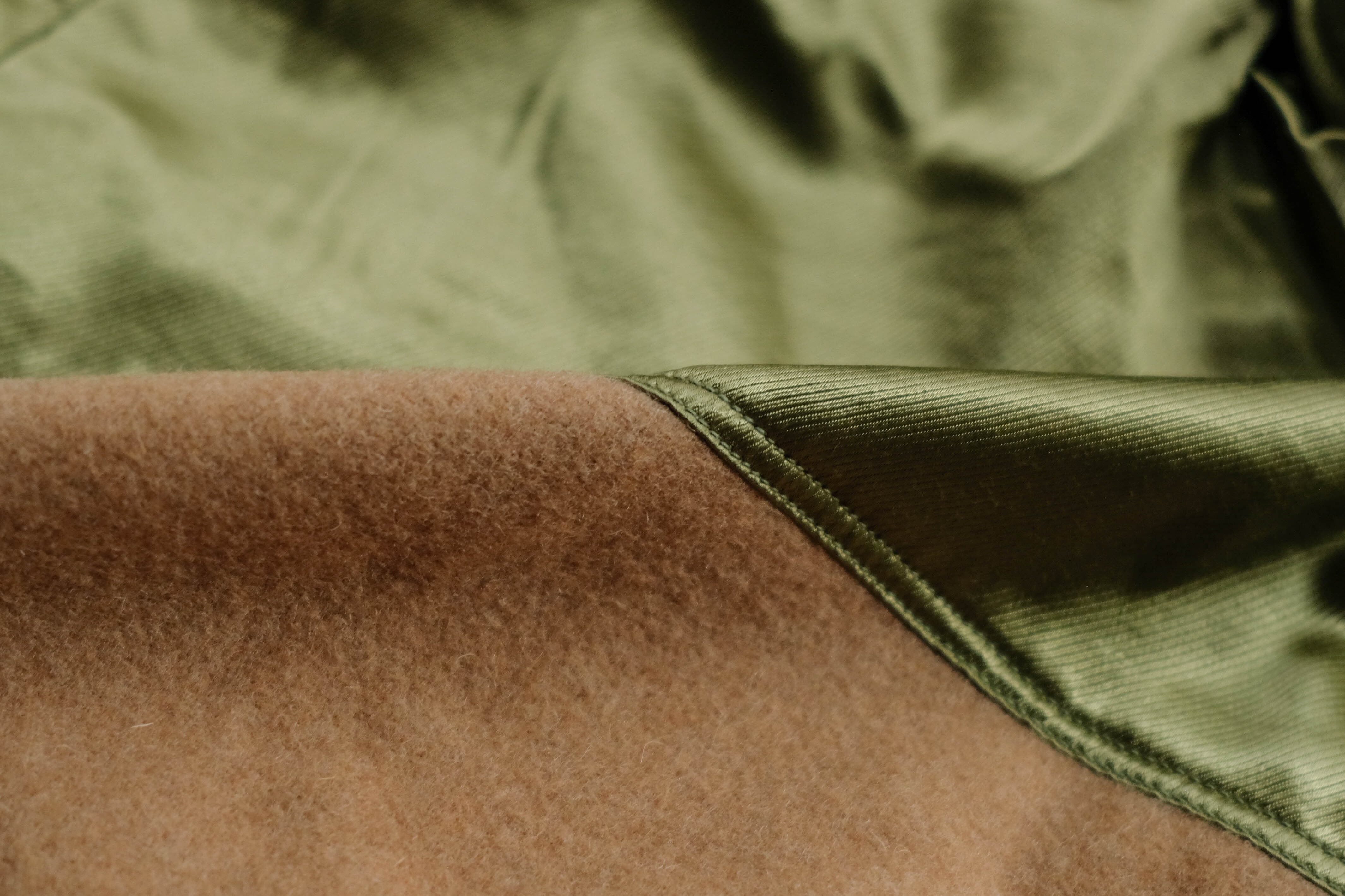 素朴でそっけない感じと、裏地やパイピングに使われたグリーンのしっかりとしたサテン生地との組み合わせが面白いです。