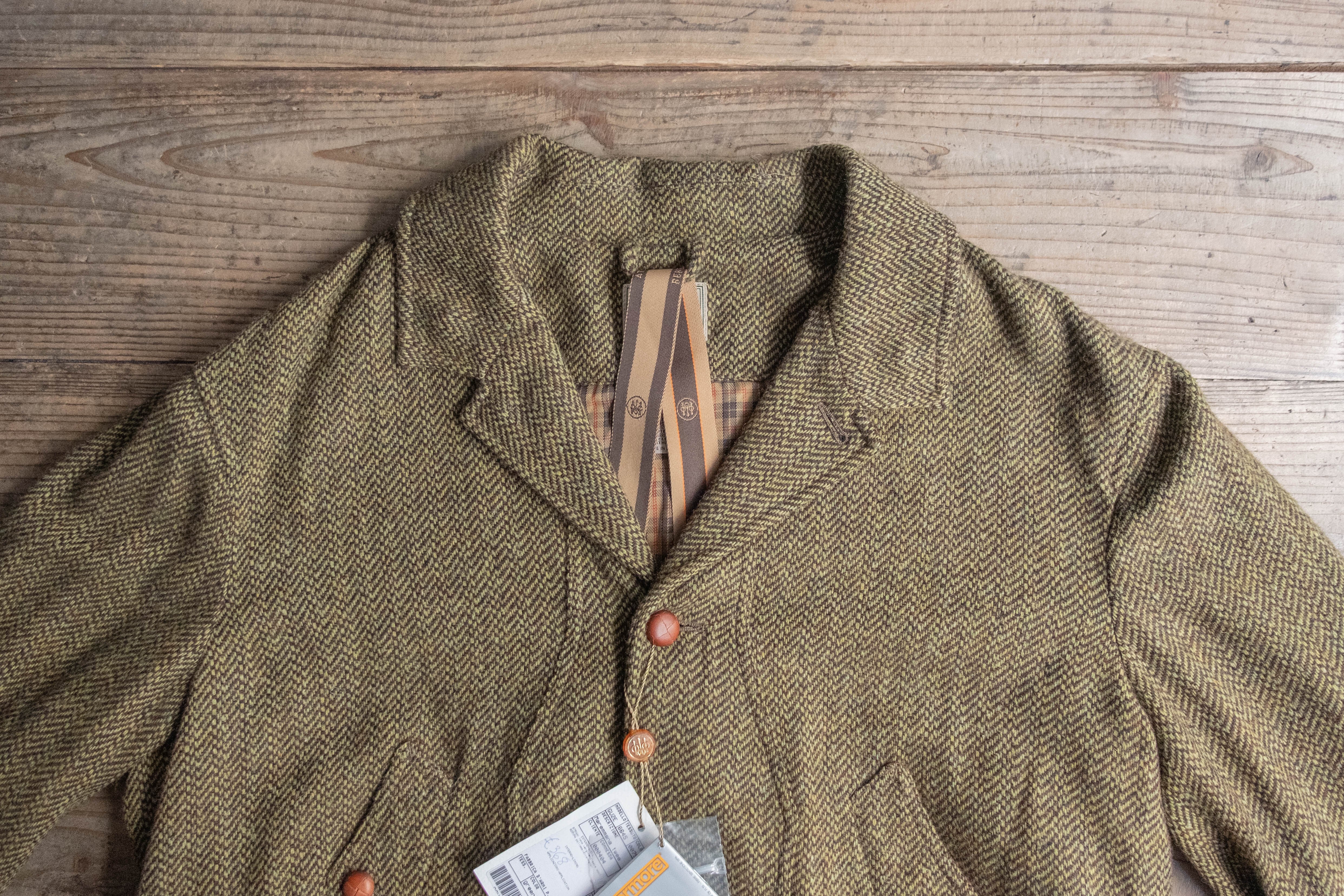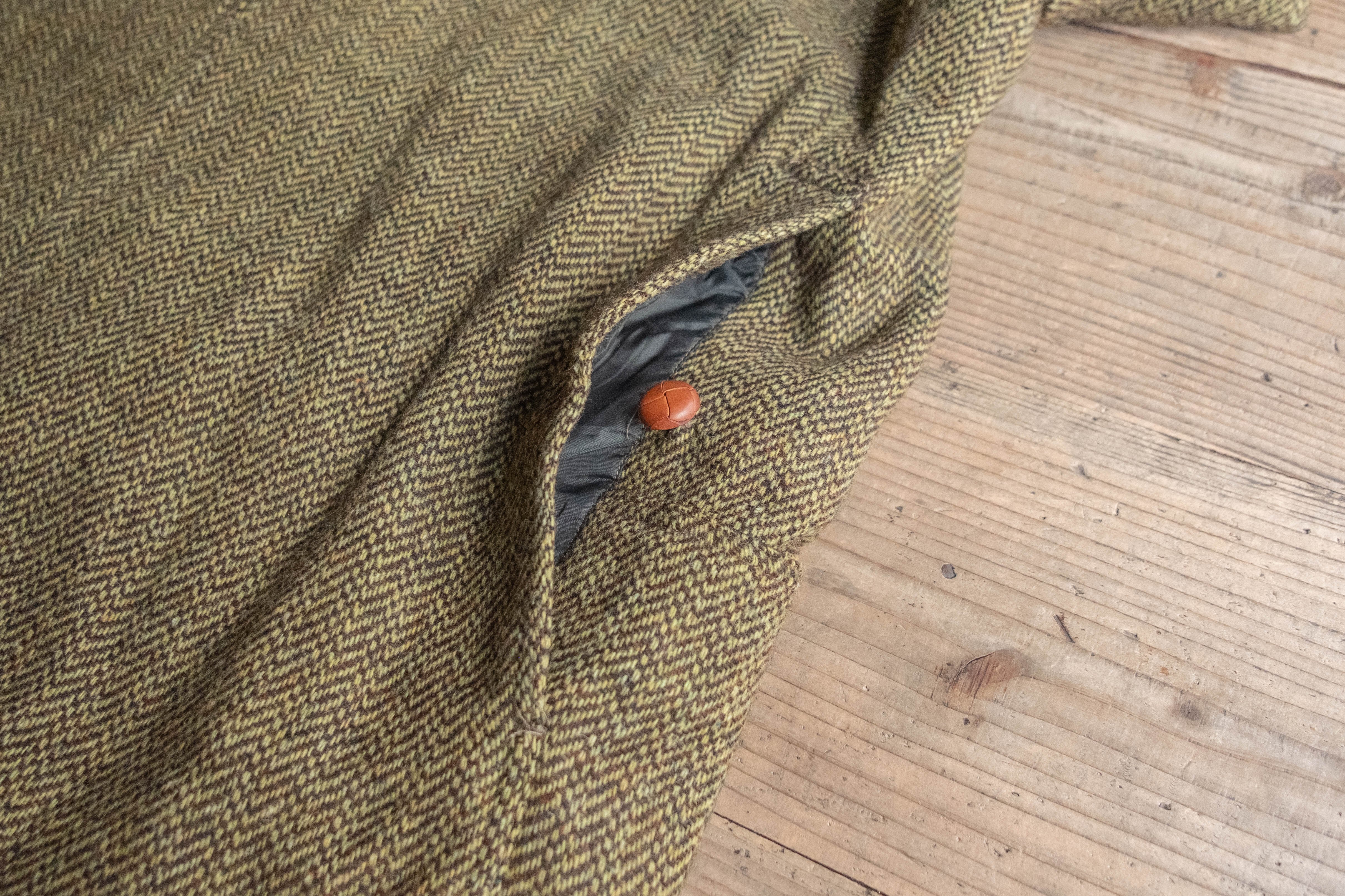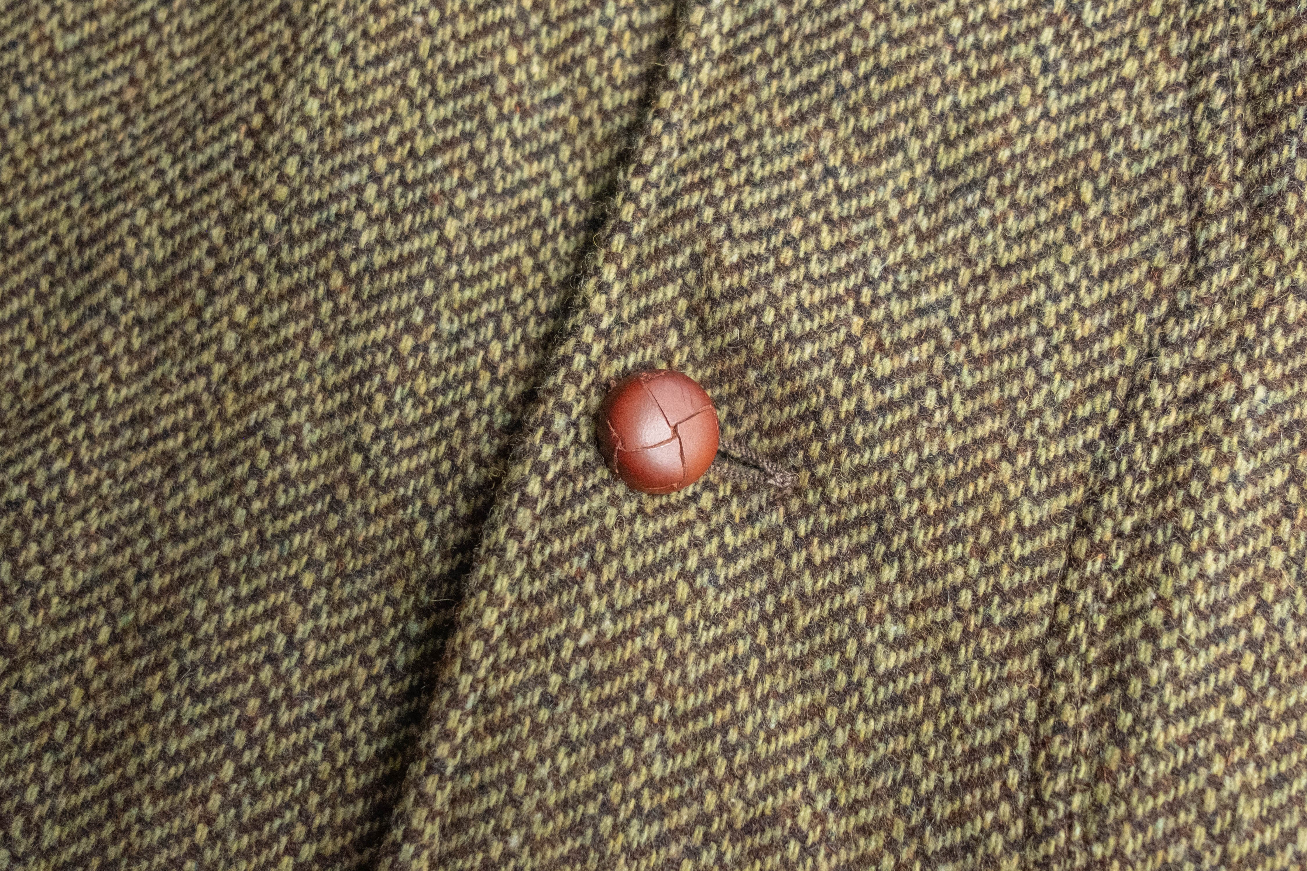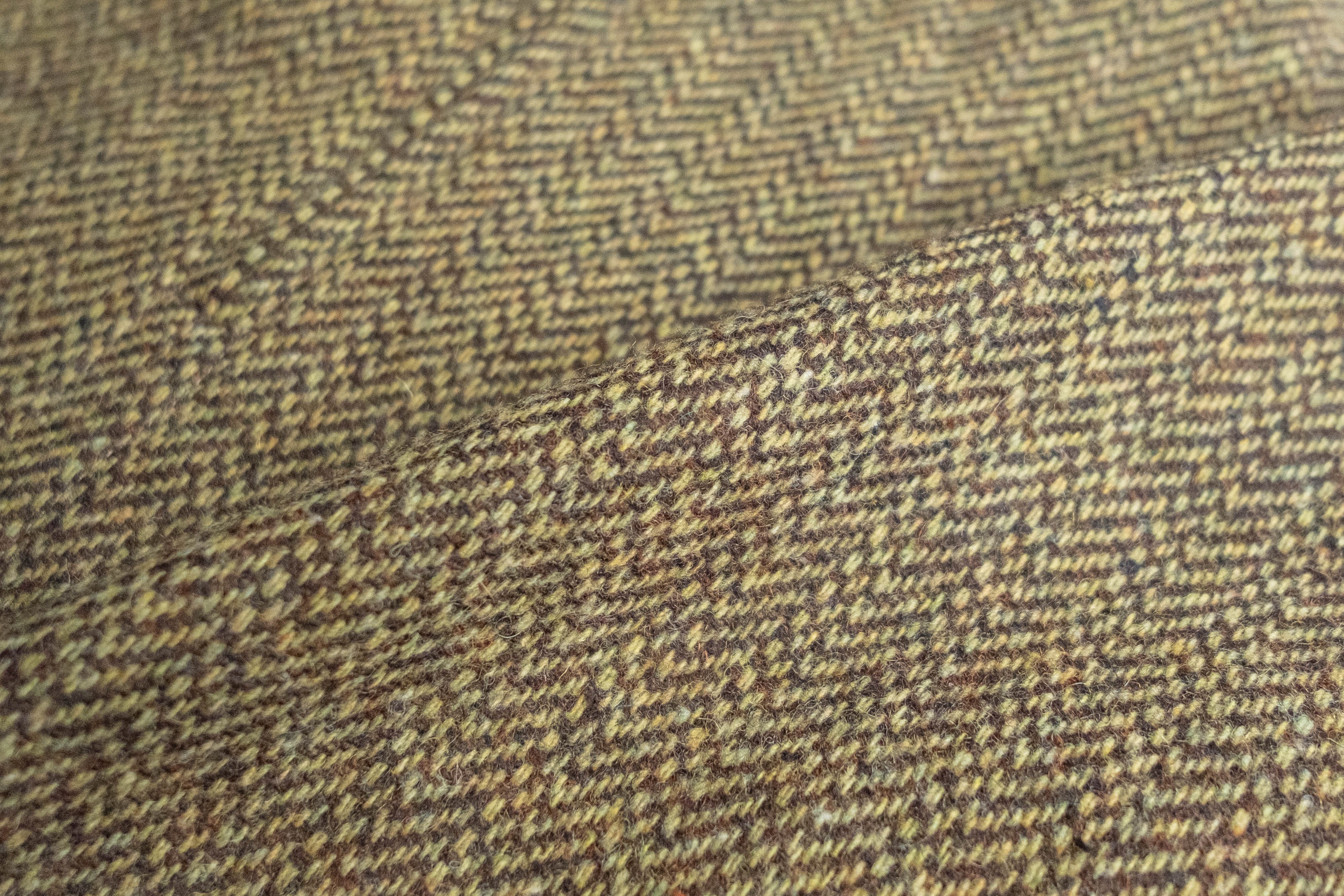 数種類のグリーン糸とブラウンの糸で織られたヘリンボーン織のウール地は迫力の中に上品さを感じます。