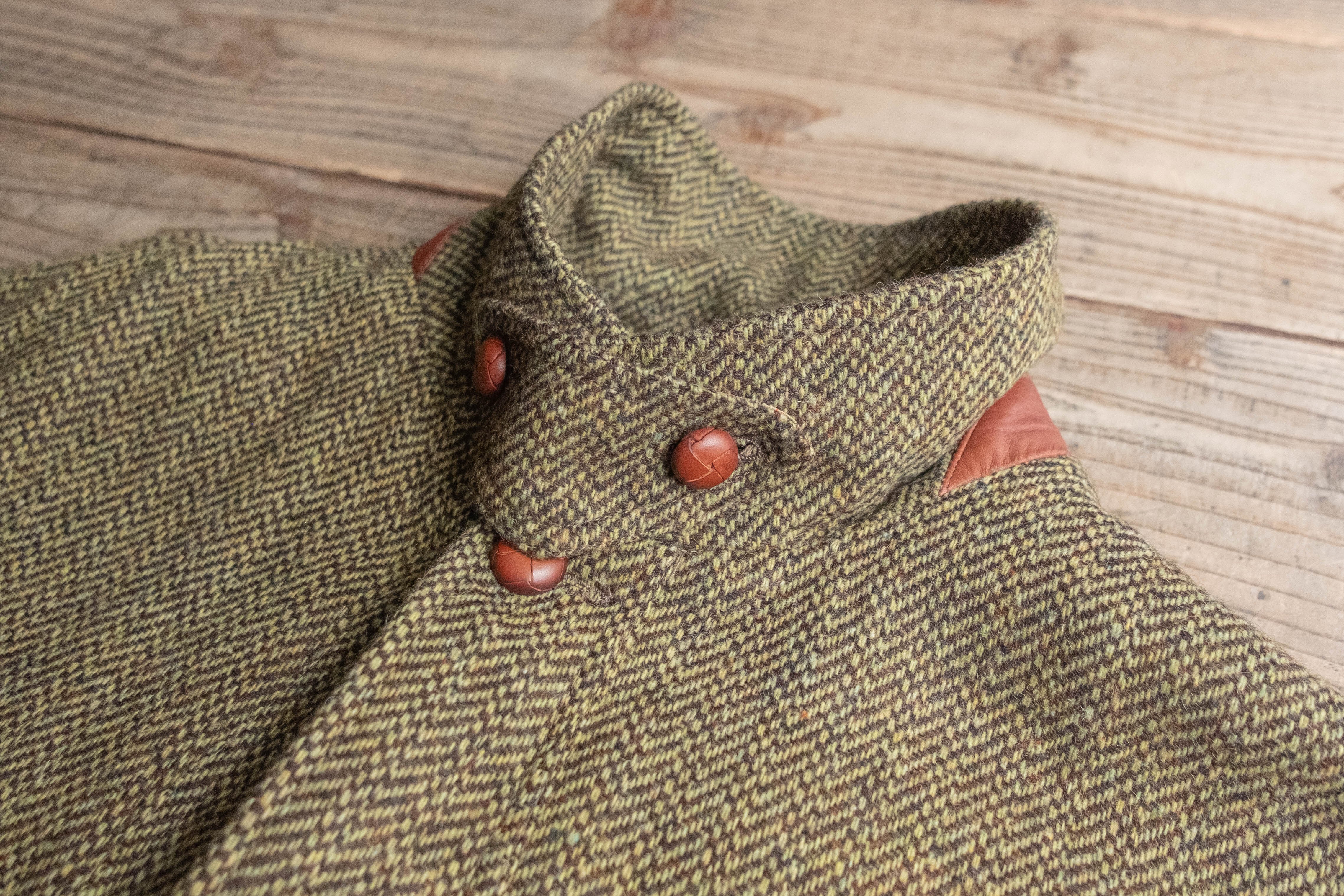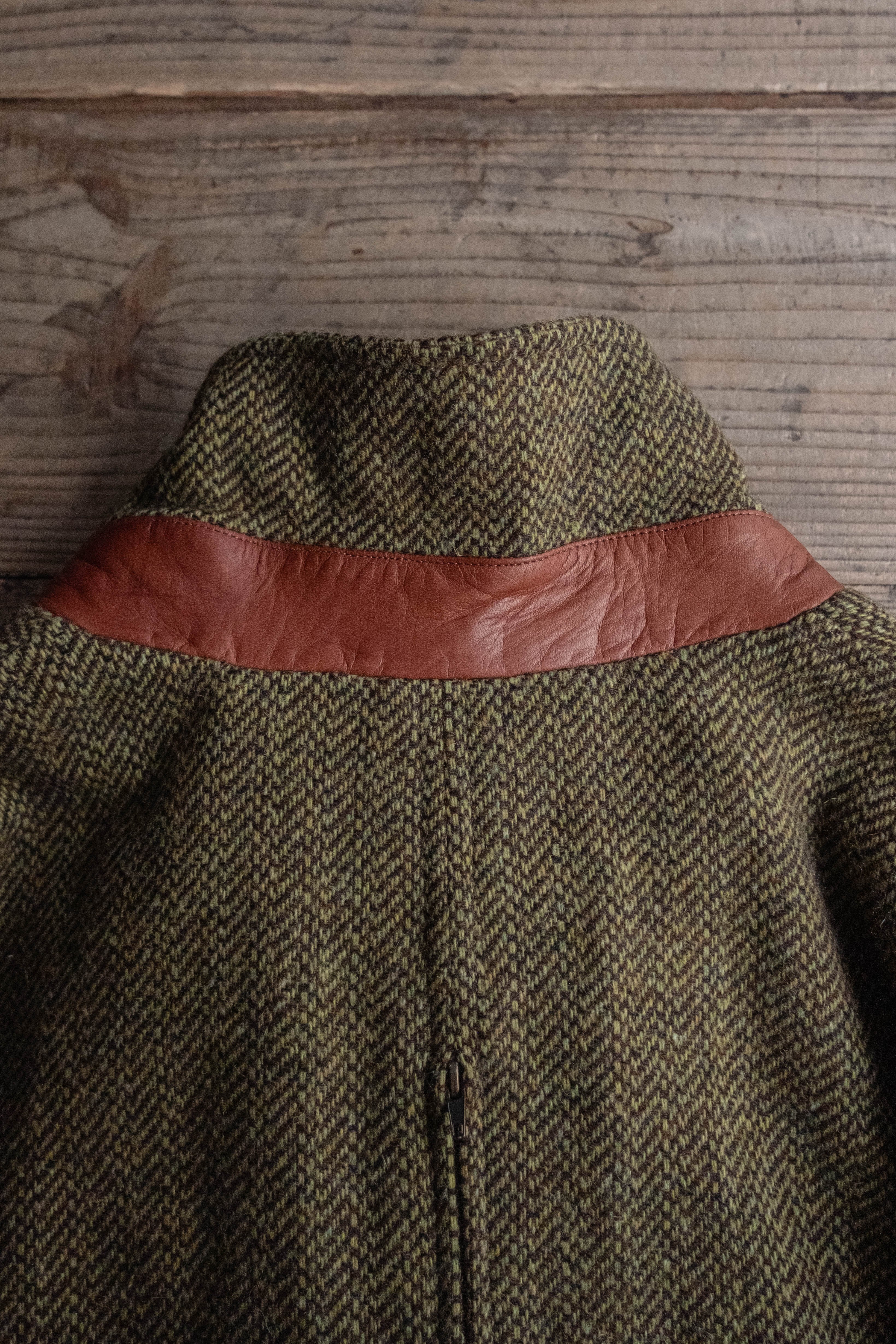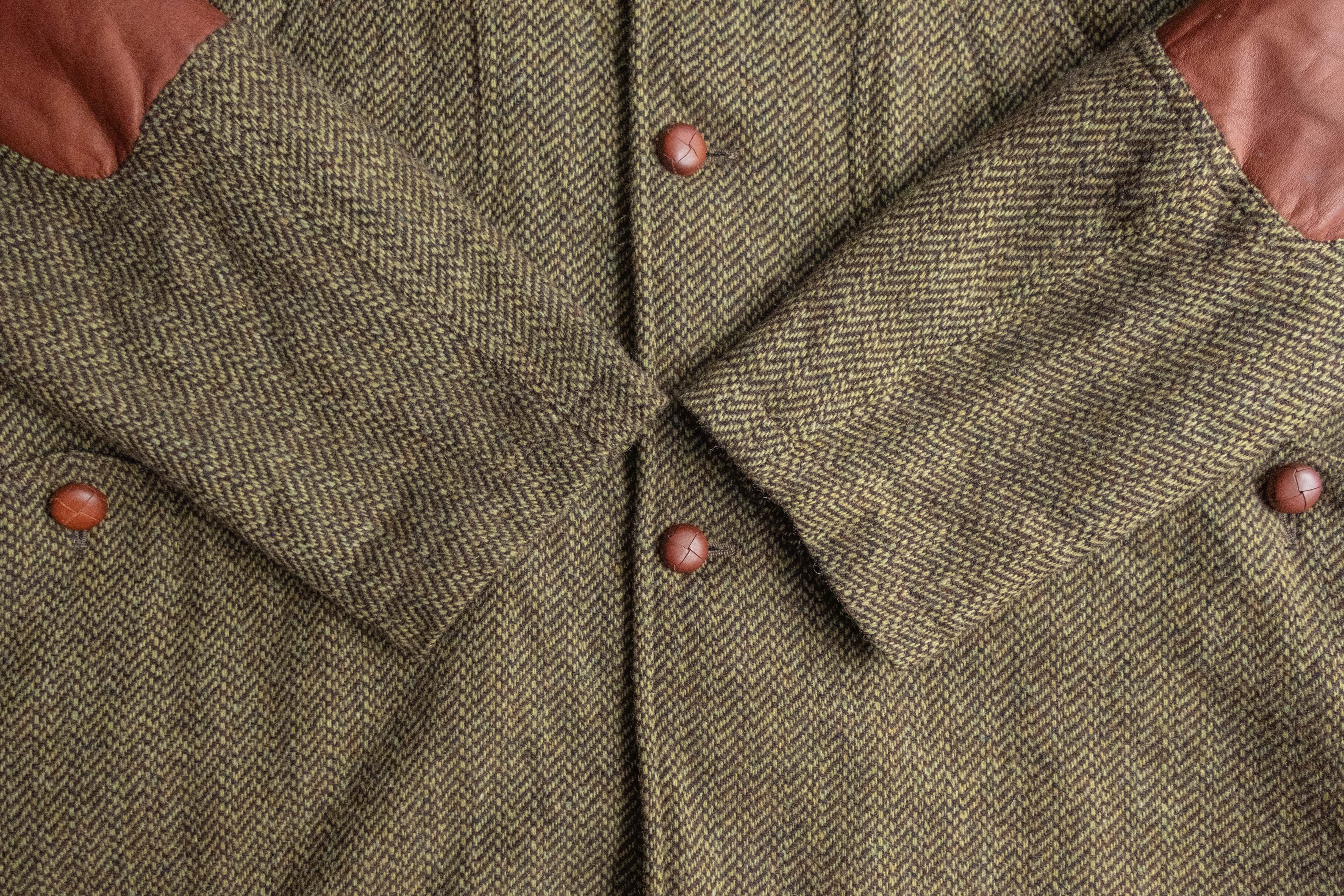 数種類のグリーン糸とブラウンの糸で織られたヘリンボーン織のウール地は迫力の中に上品さを感じます。