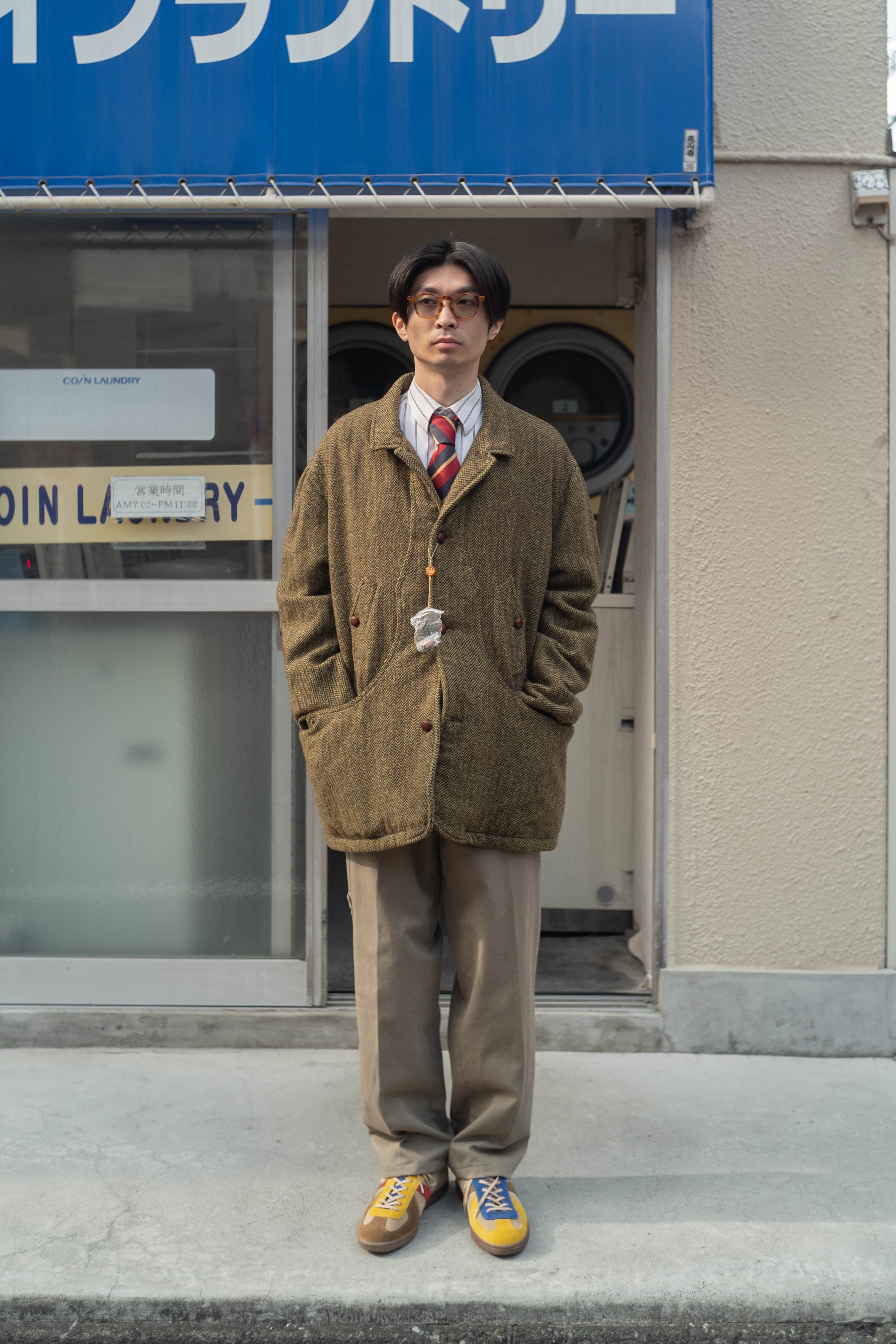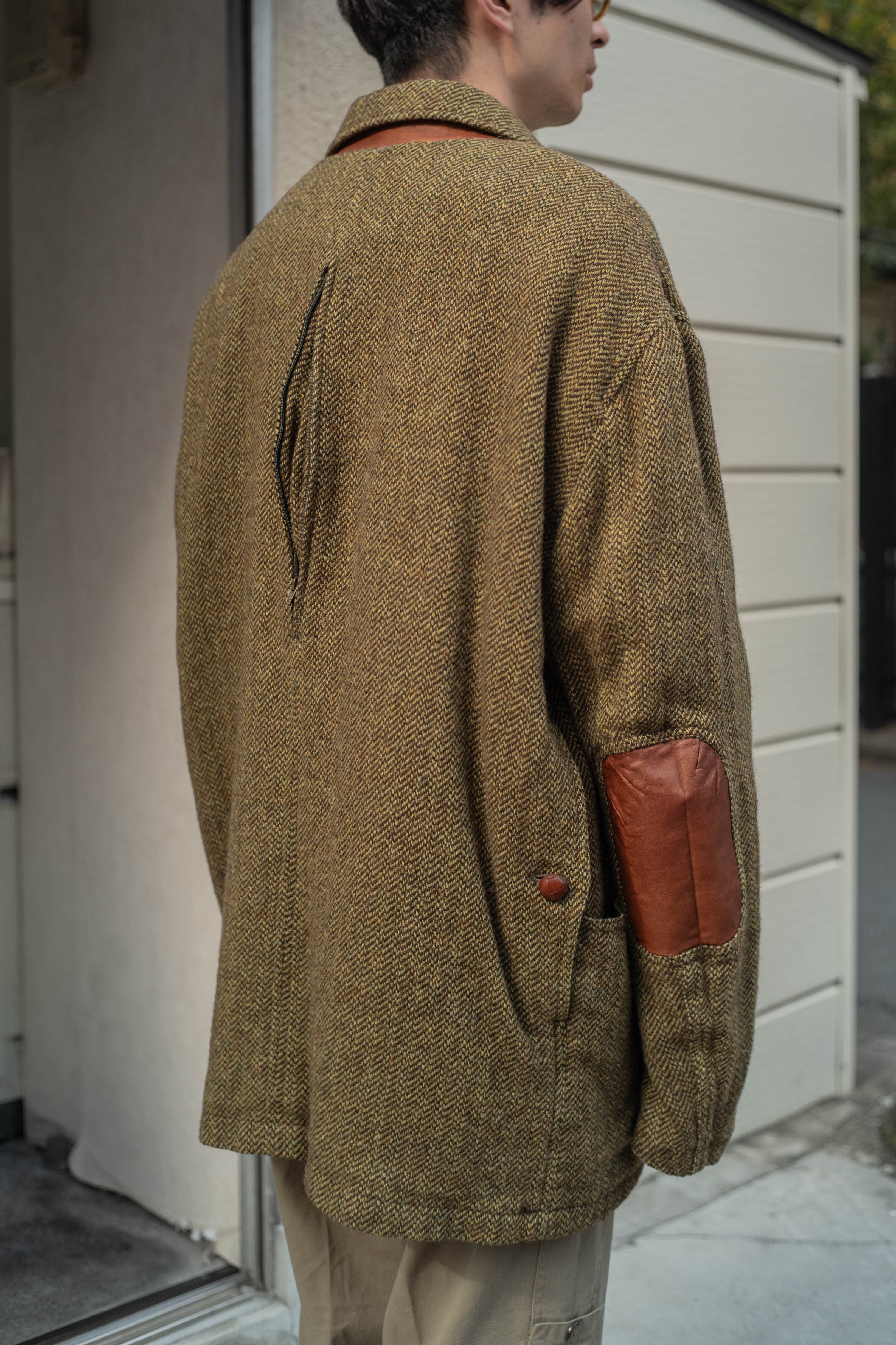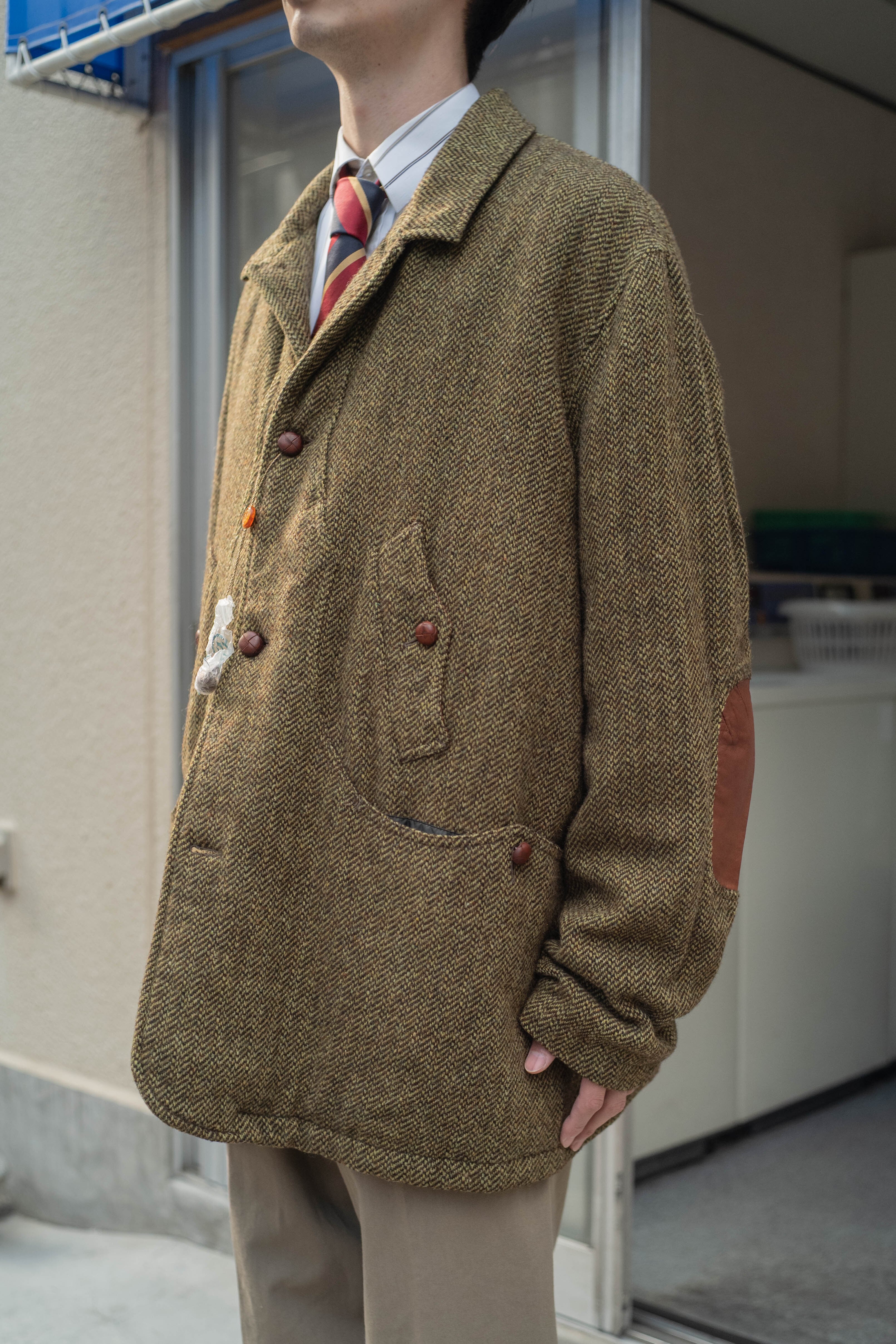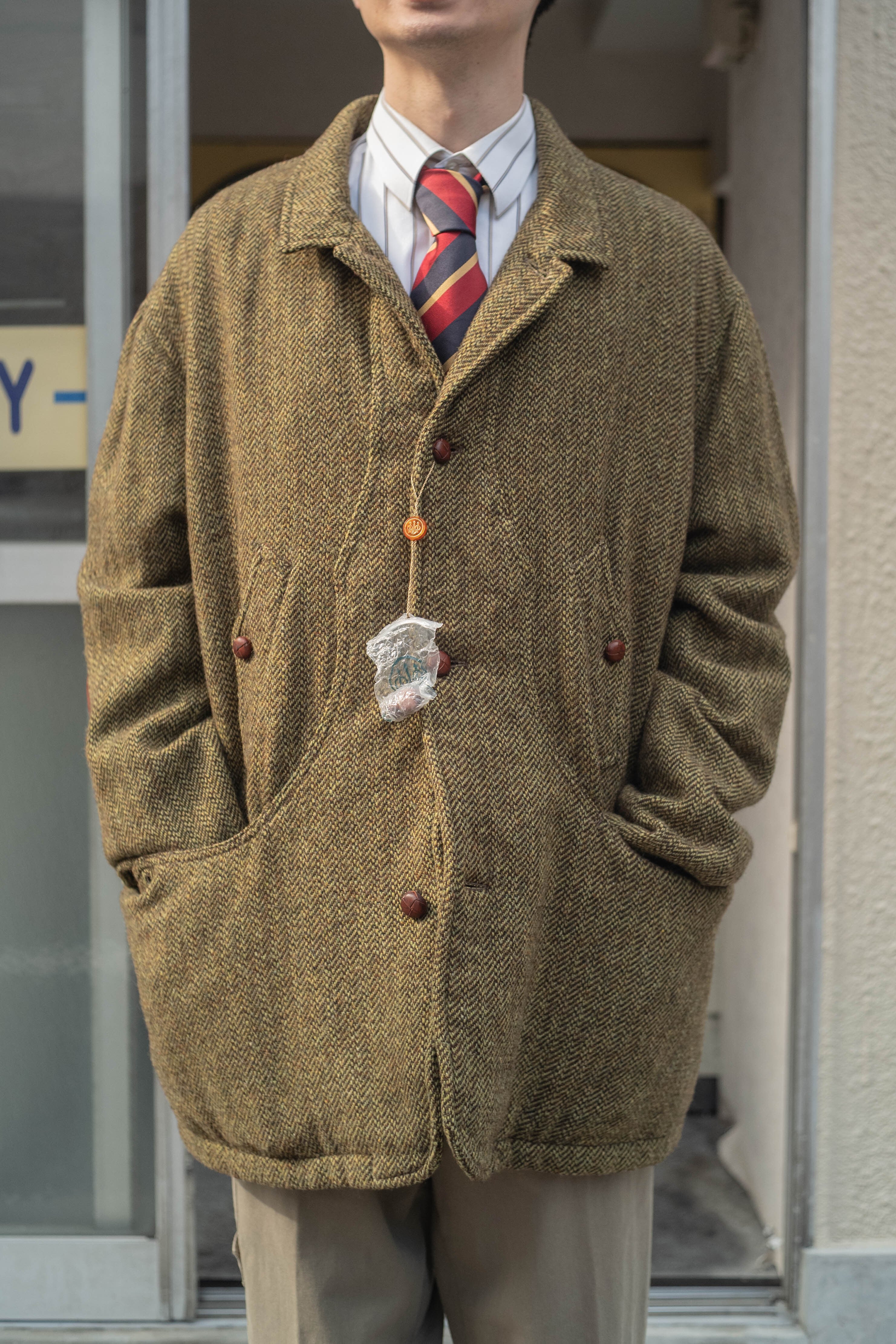 数種類のグリーン糸とブラウンの糸で織られたヘリンボーン織のウール地は迫力の中に上品さを感じます。