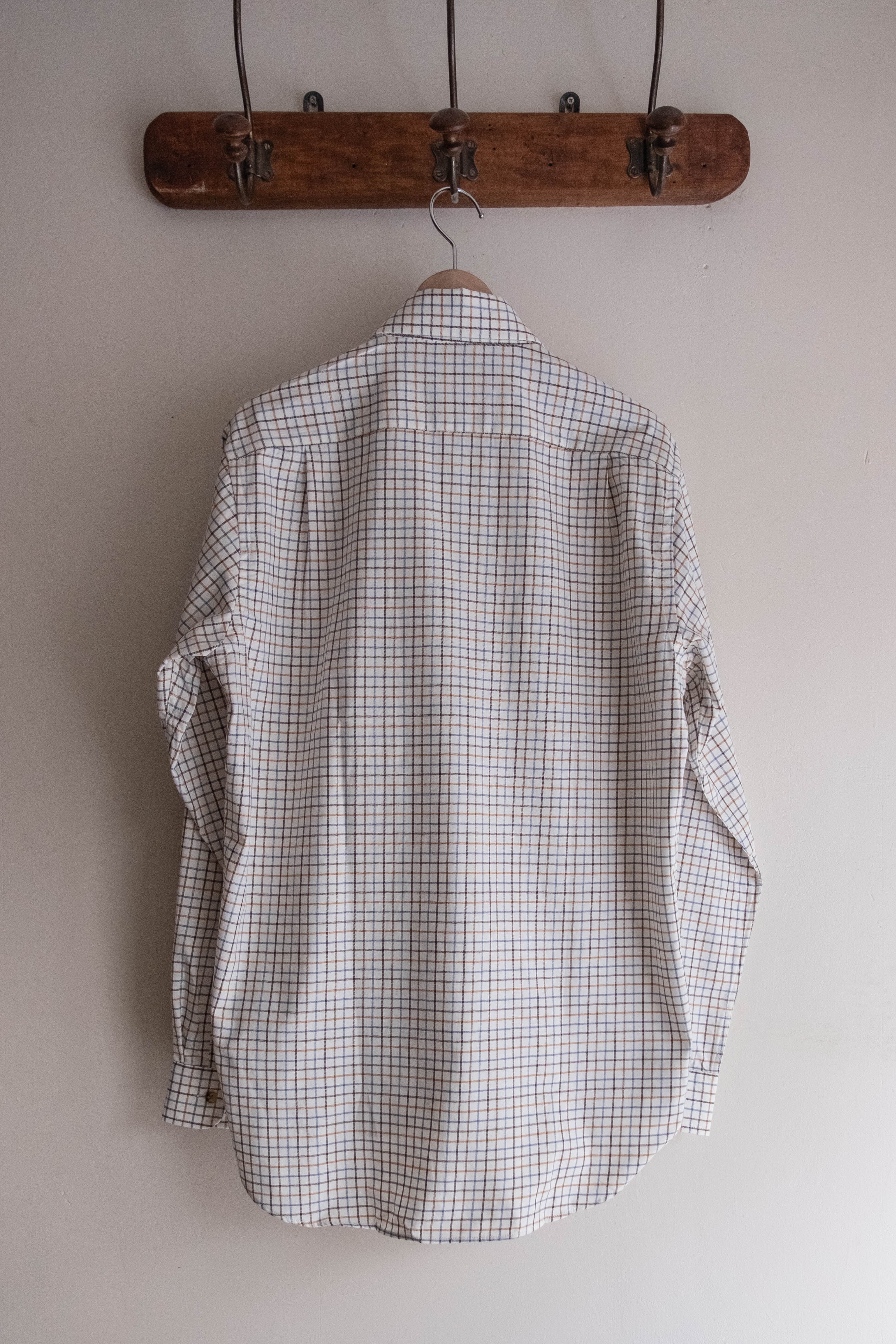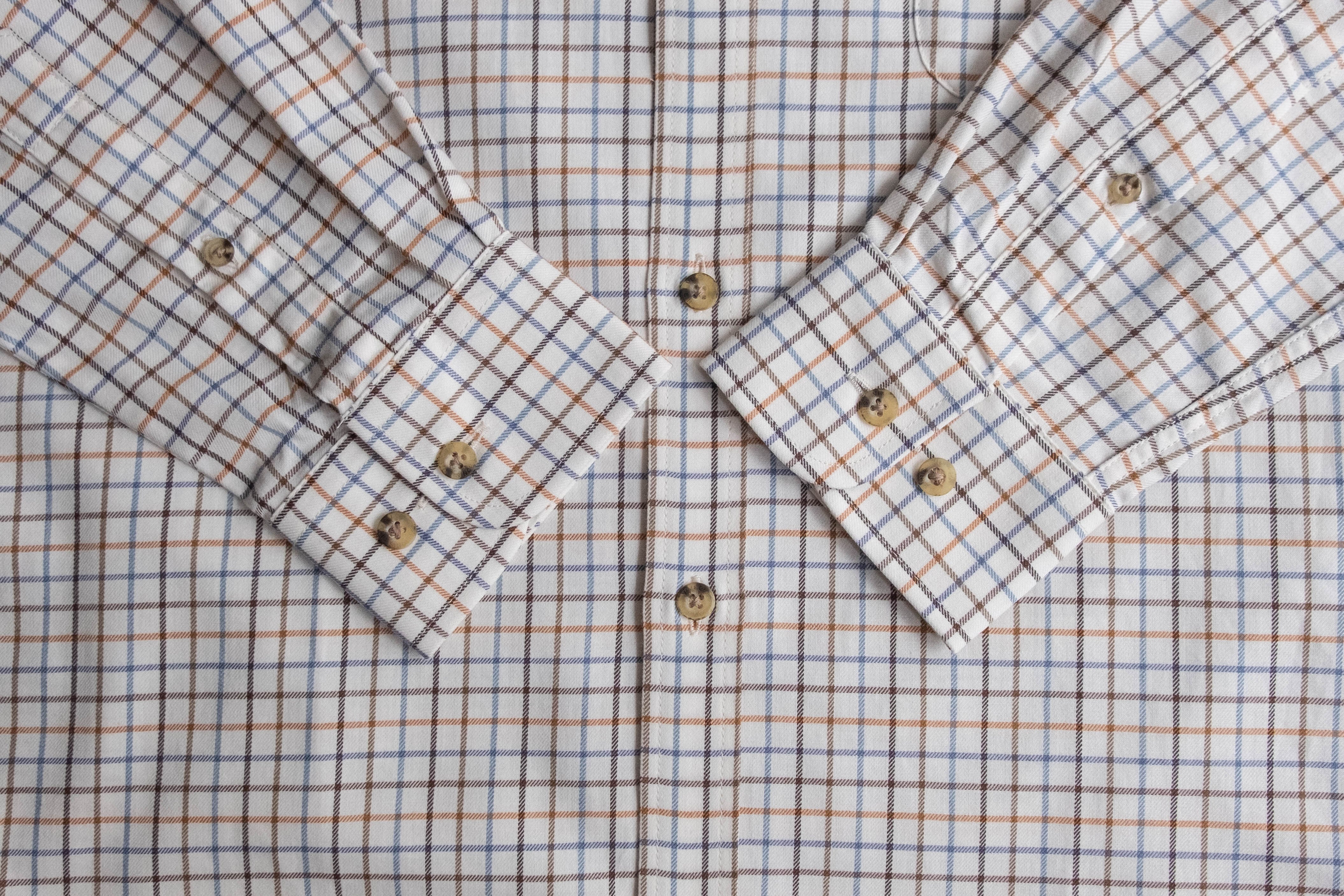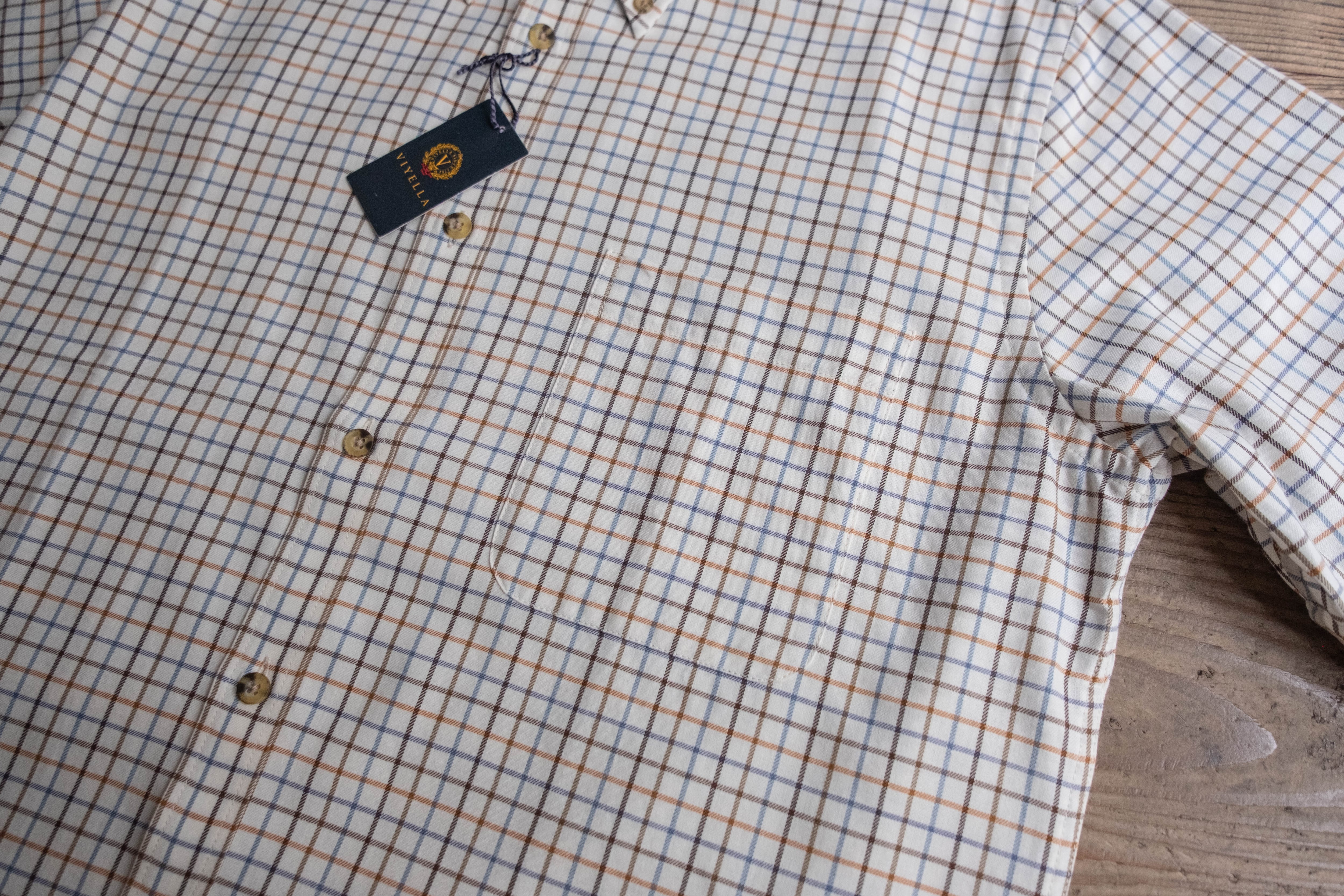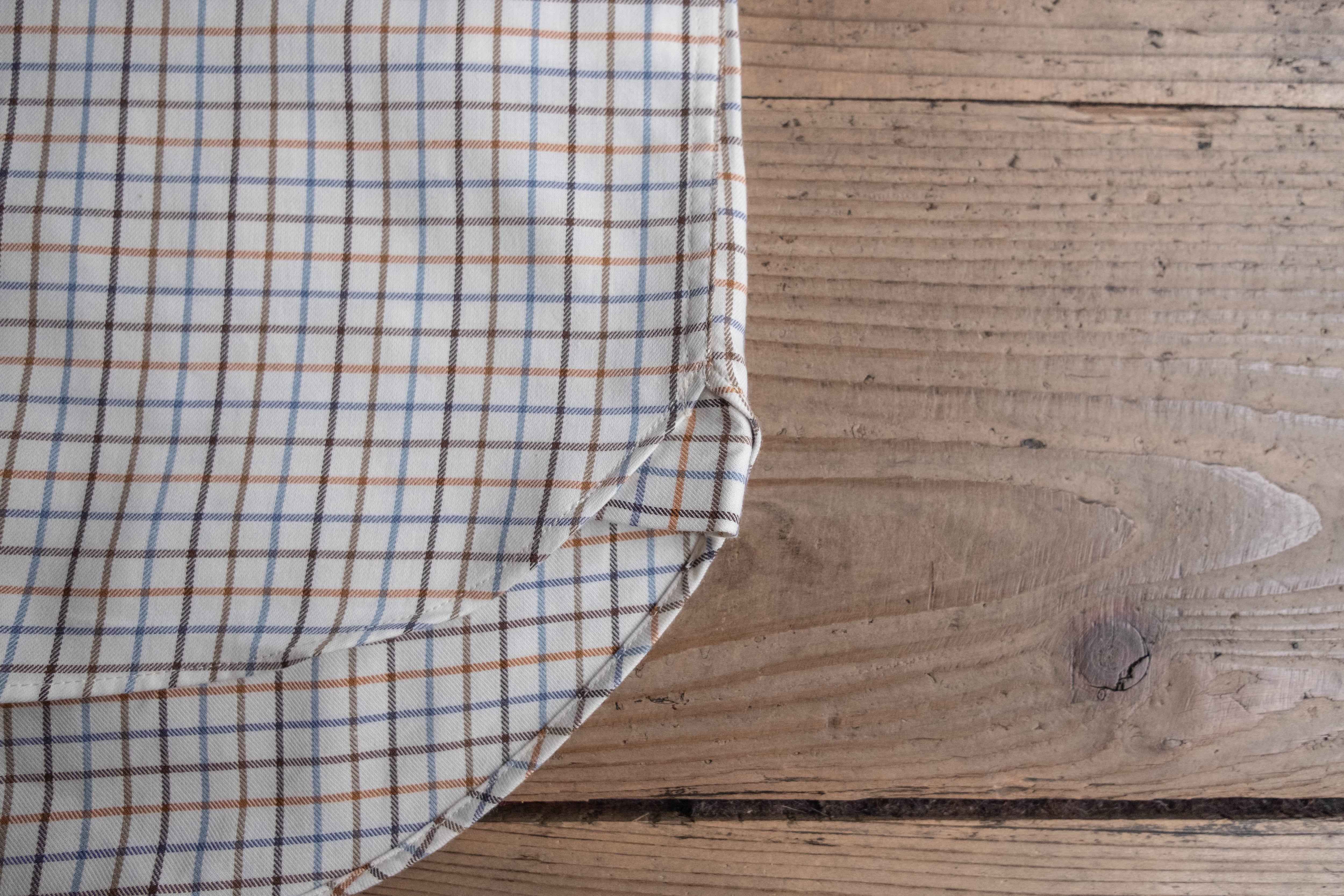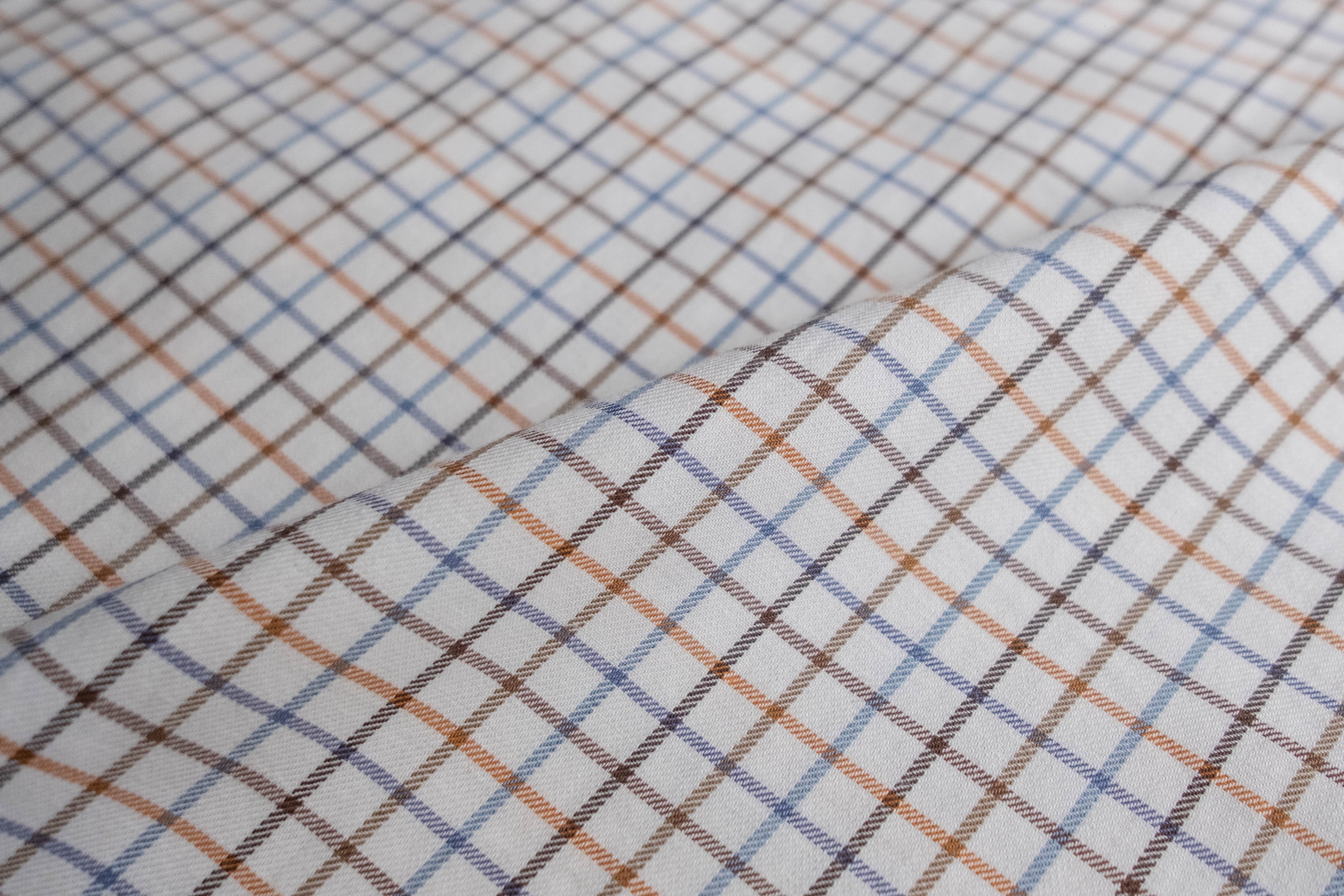 カラーはアイボリーベースにオレンジ、ブラウン、ブルーのチェック柄が入ります。