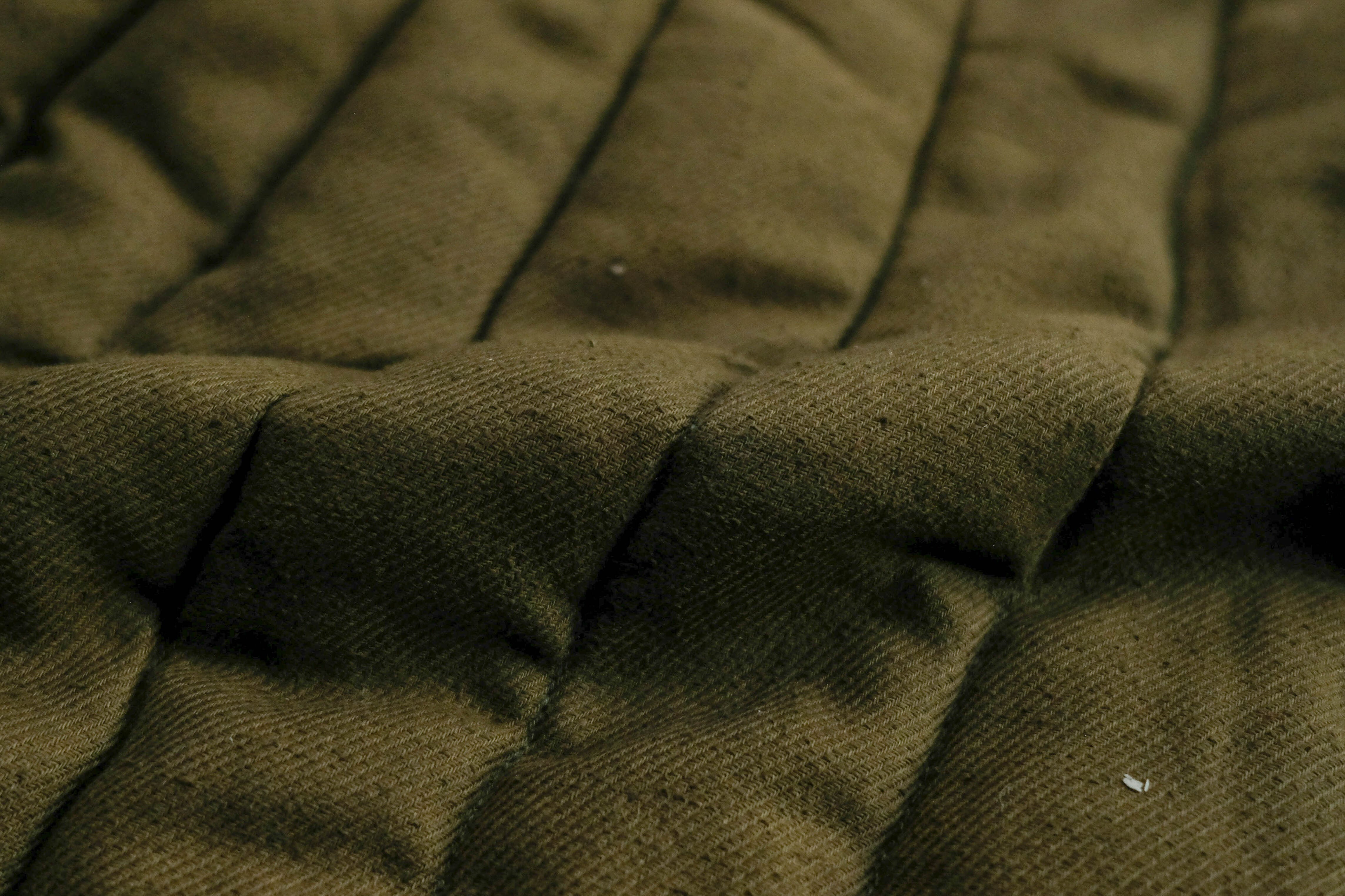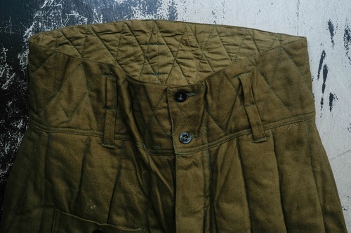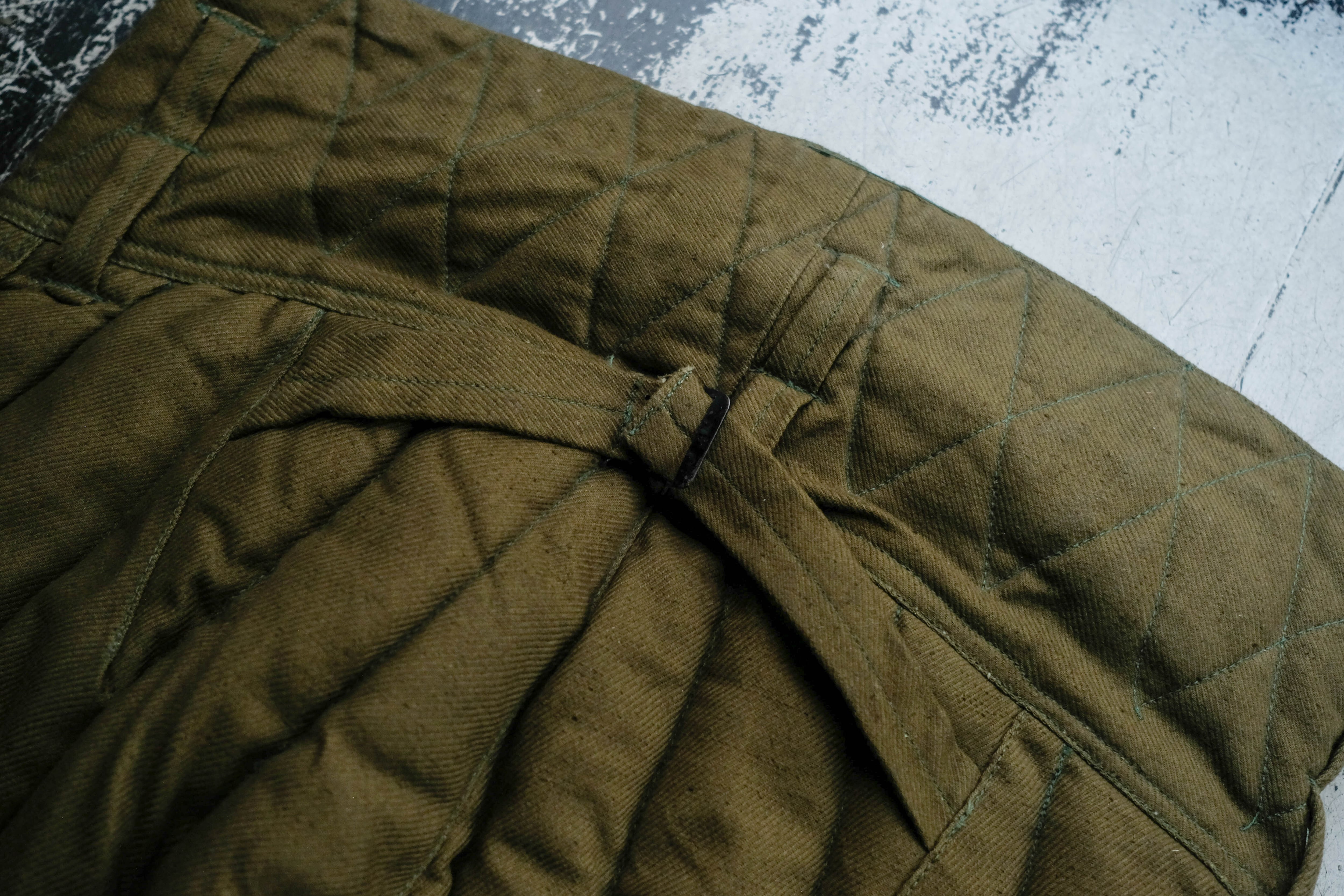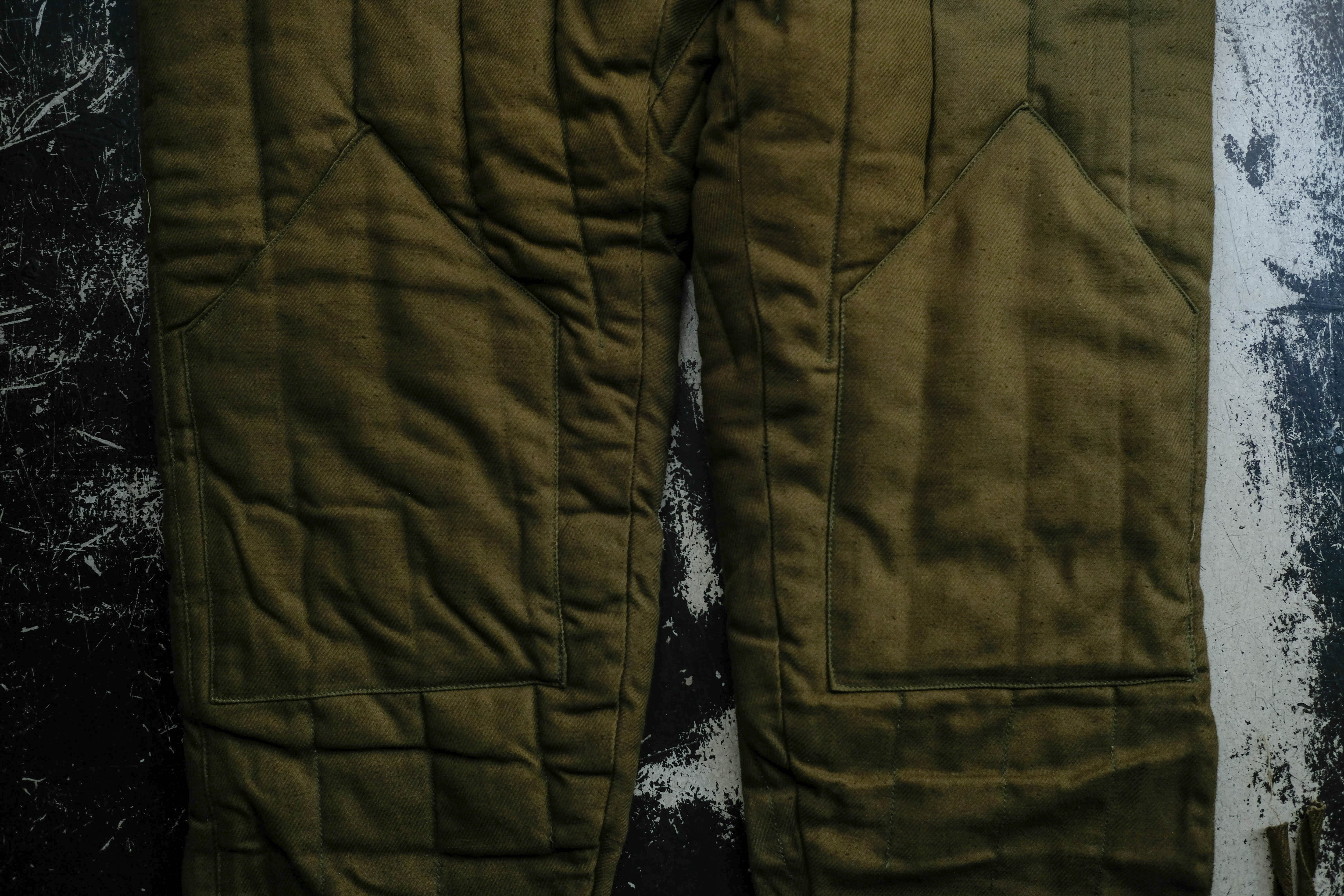 縦に入るキルティング、右腿につくポケット、膝の当て布など、一目見た時のインパクトが強い一着。