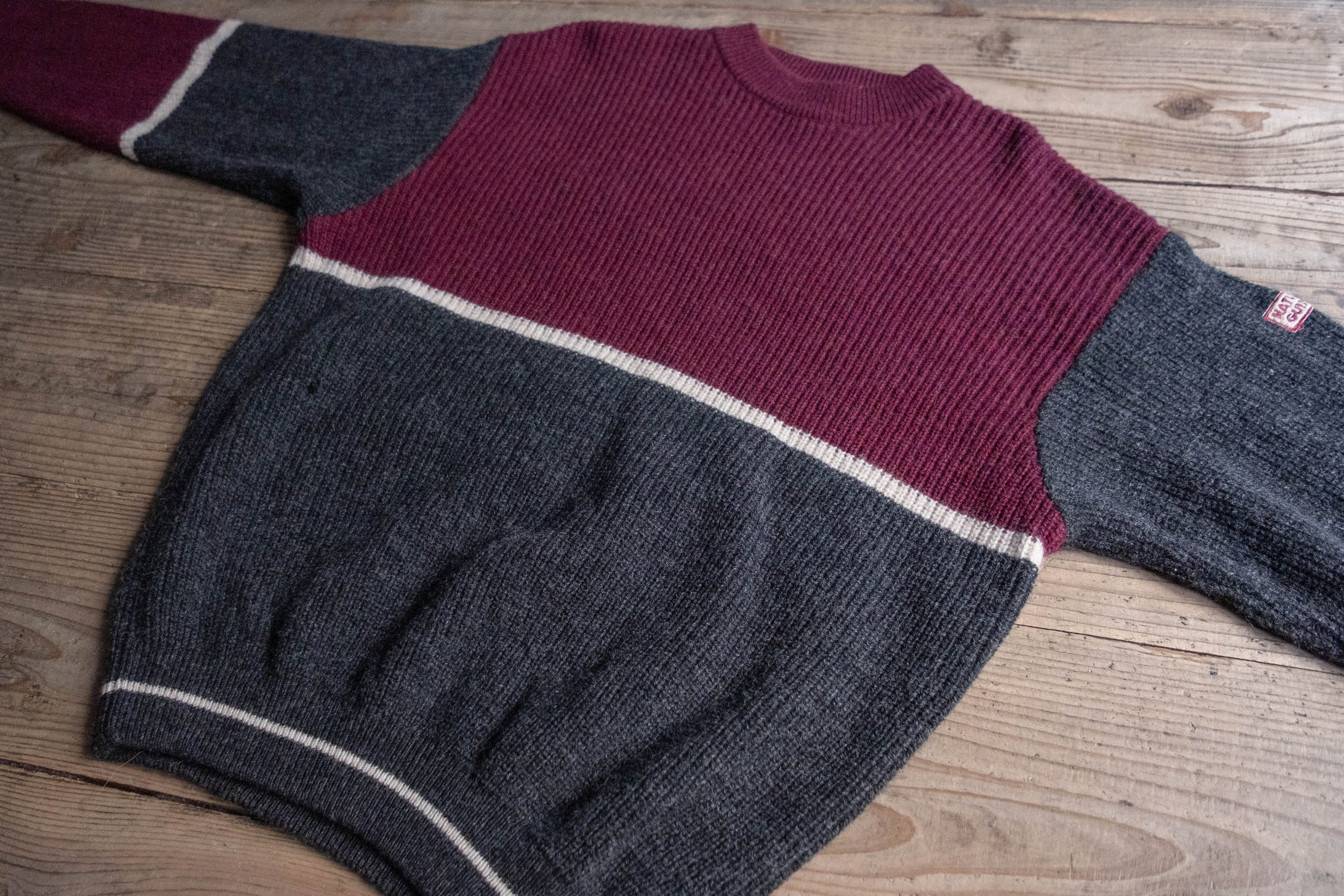 落ち着いたトーンのエンジ色とダークグレーのツートーンに、ホワイトのラインがアクセントになった一着。