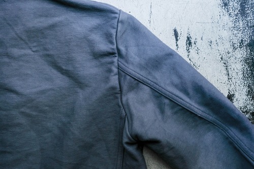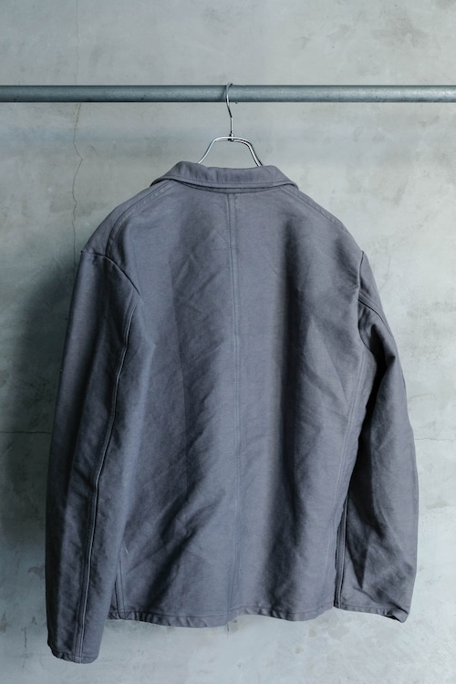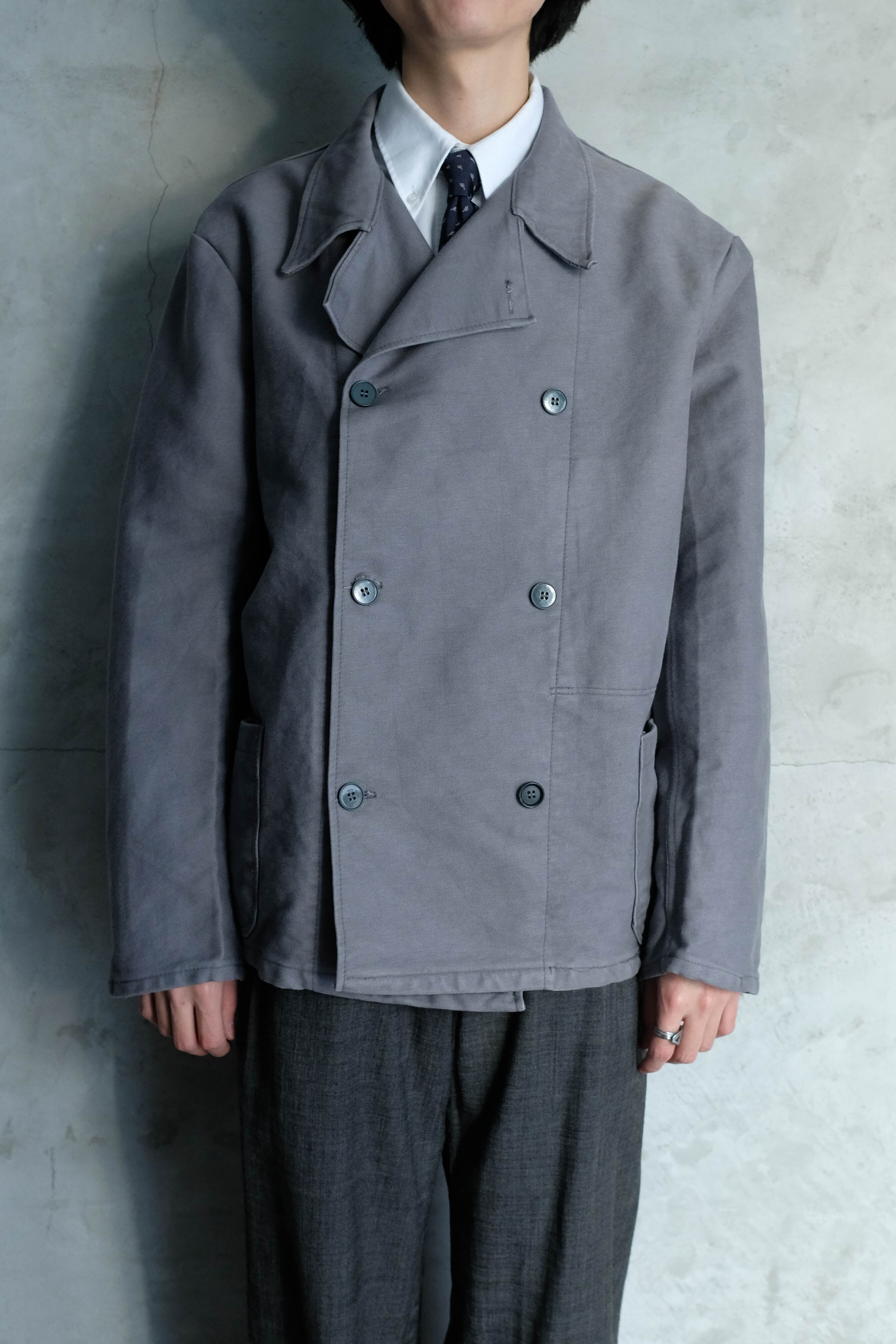 少し褪せたブルーグレーのようなカラーと、ダブルの前立てが魅力的なジャケットです。