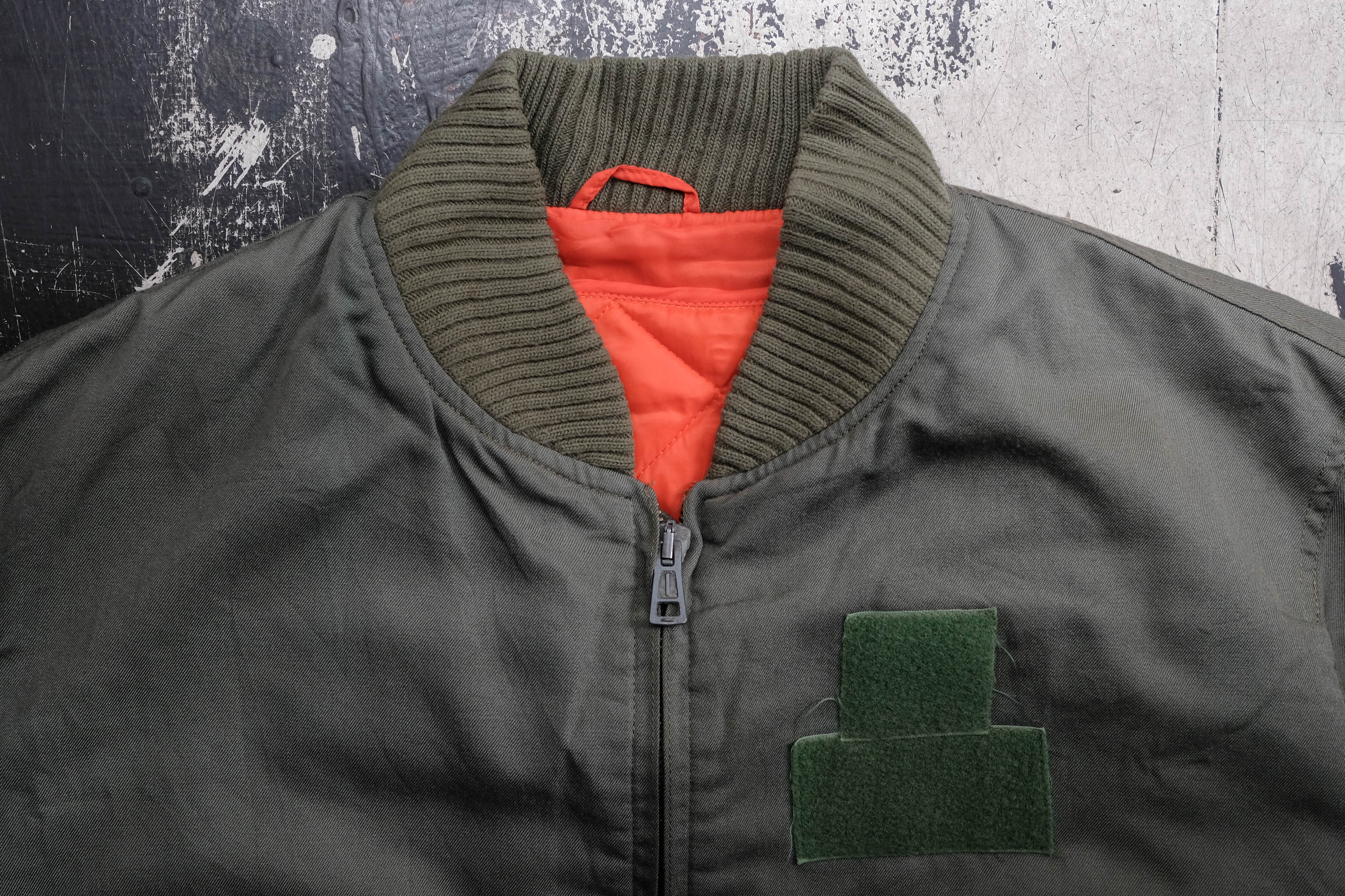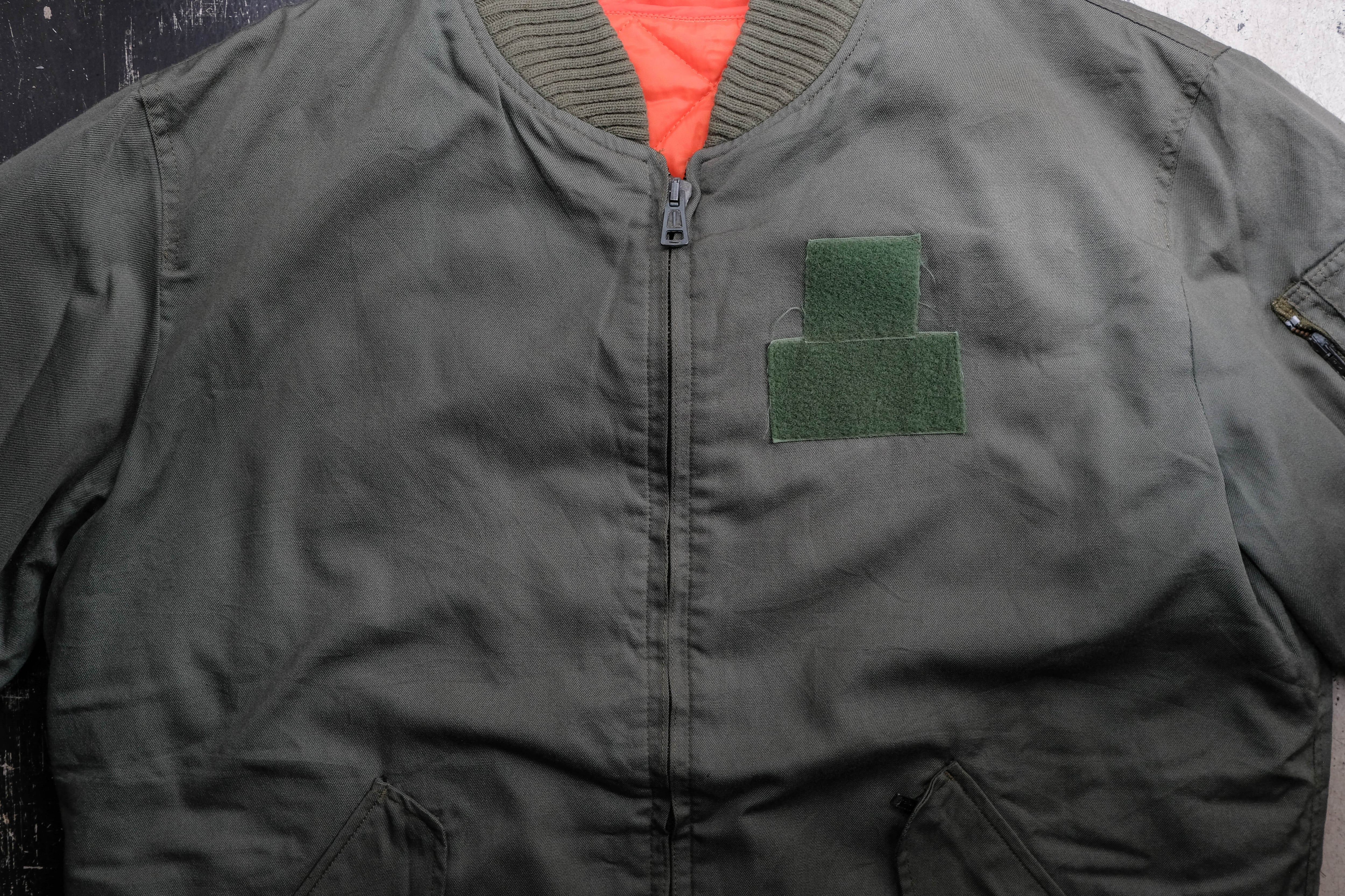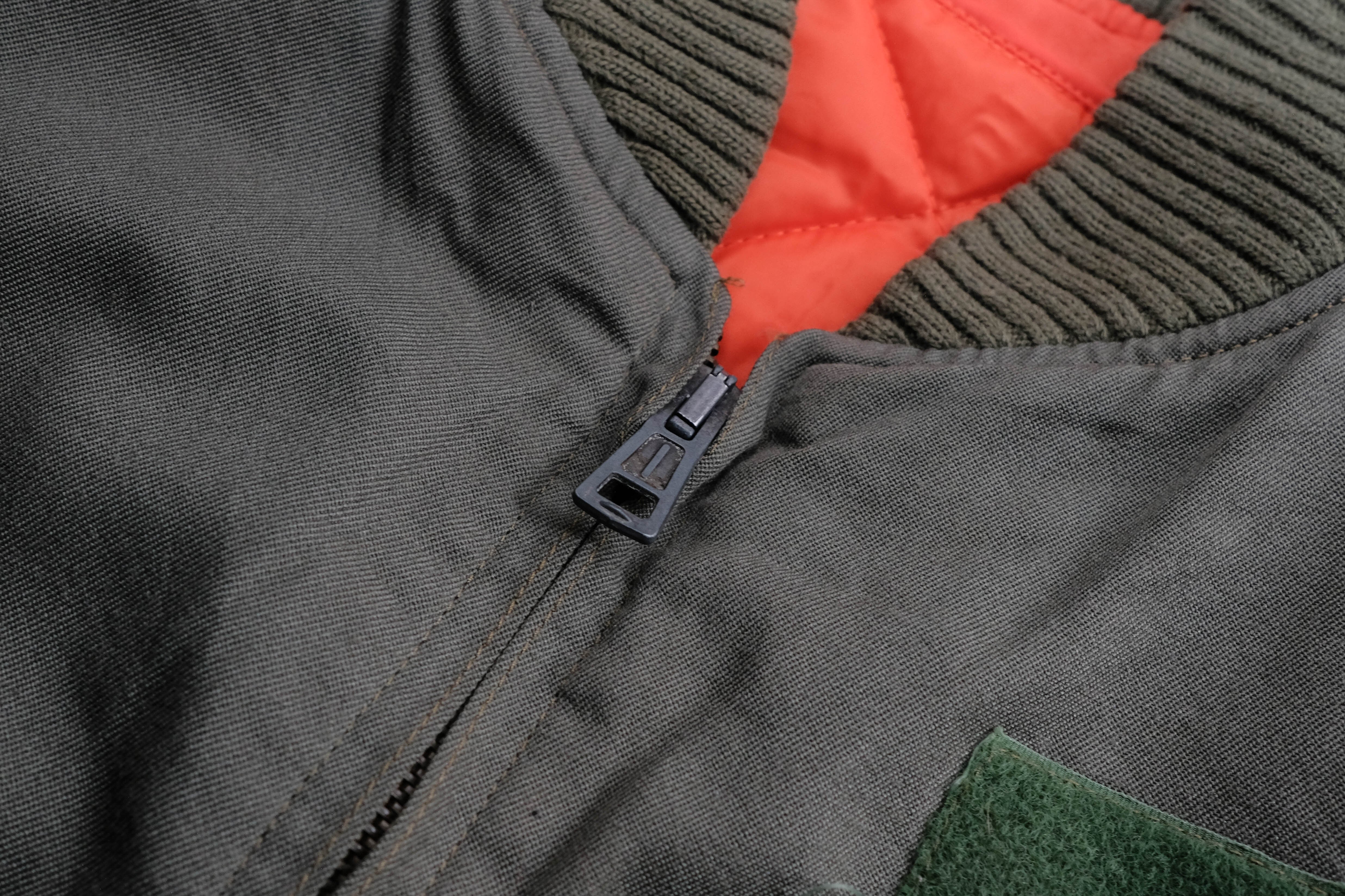 襟や袖、裾に施された肉厚なリブ、裏地のレスキューオレンジなど、アメリカ軍のMA1のような作りをしています。