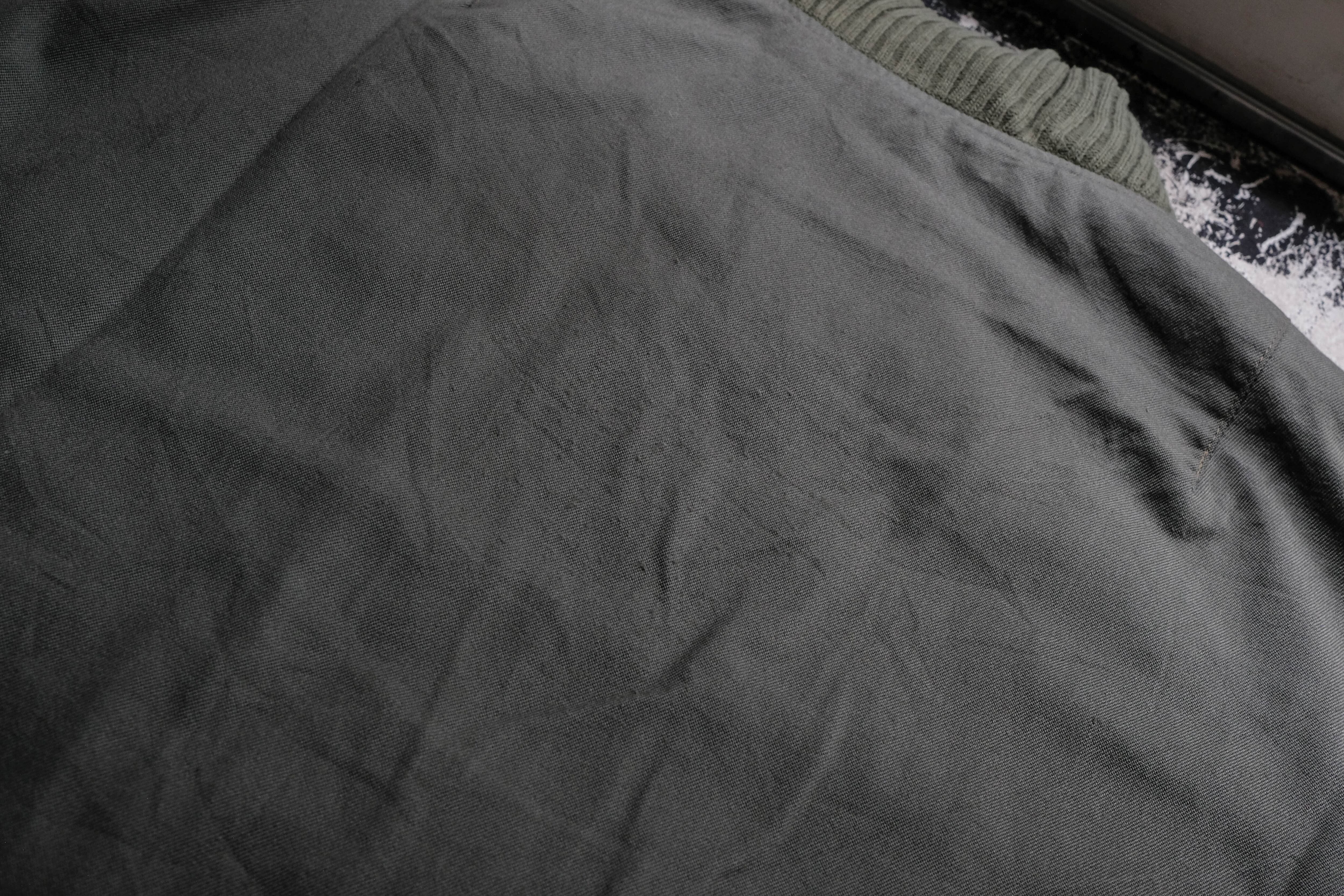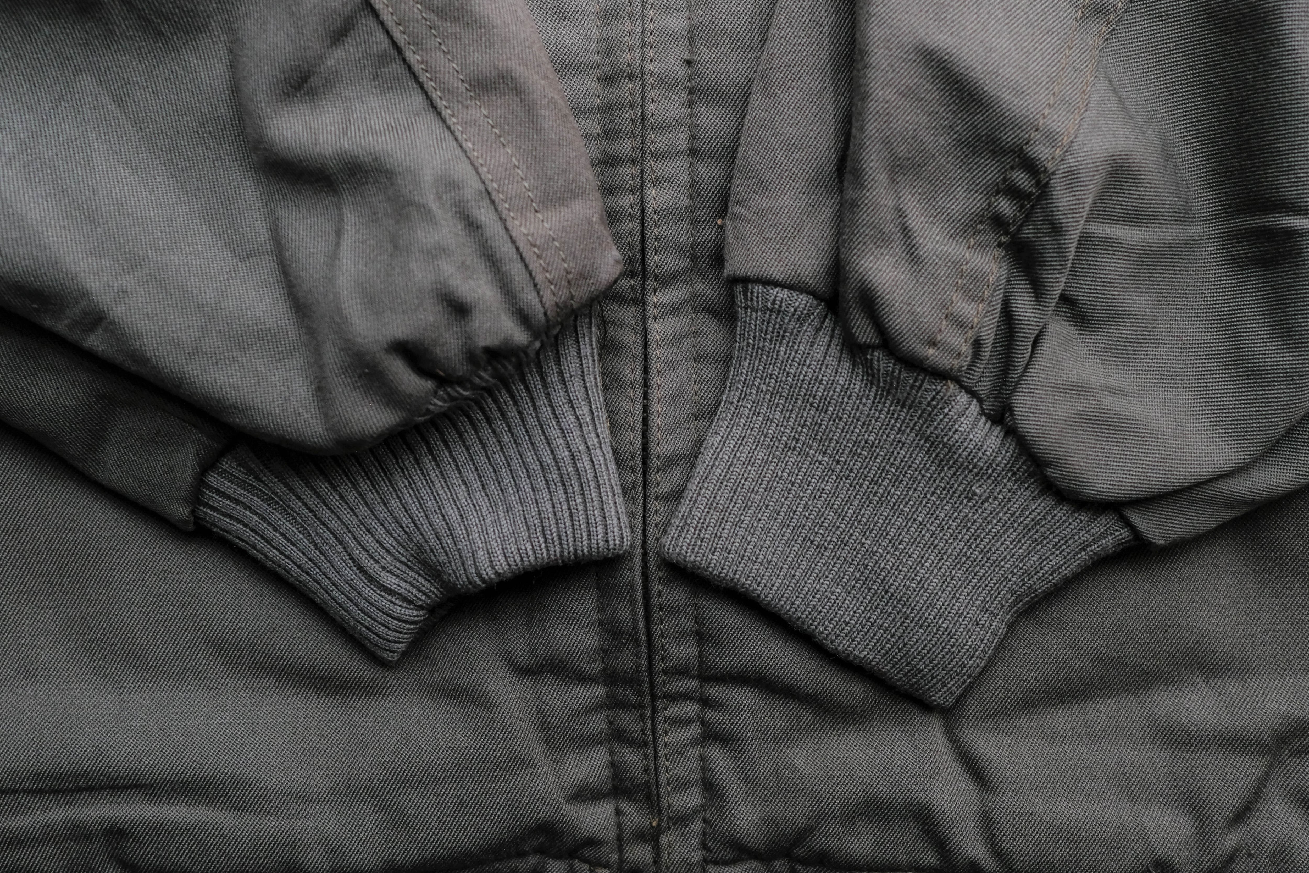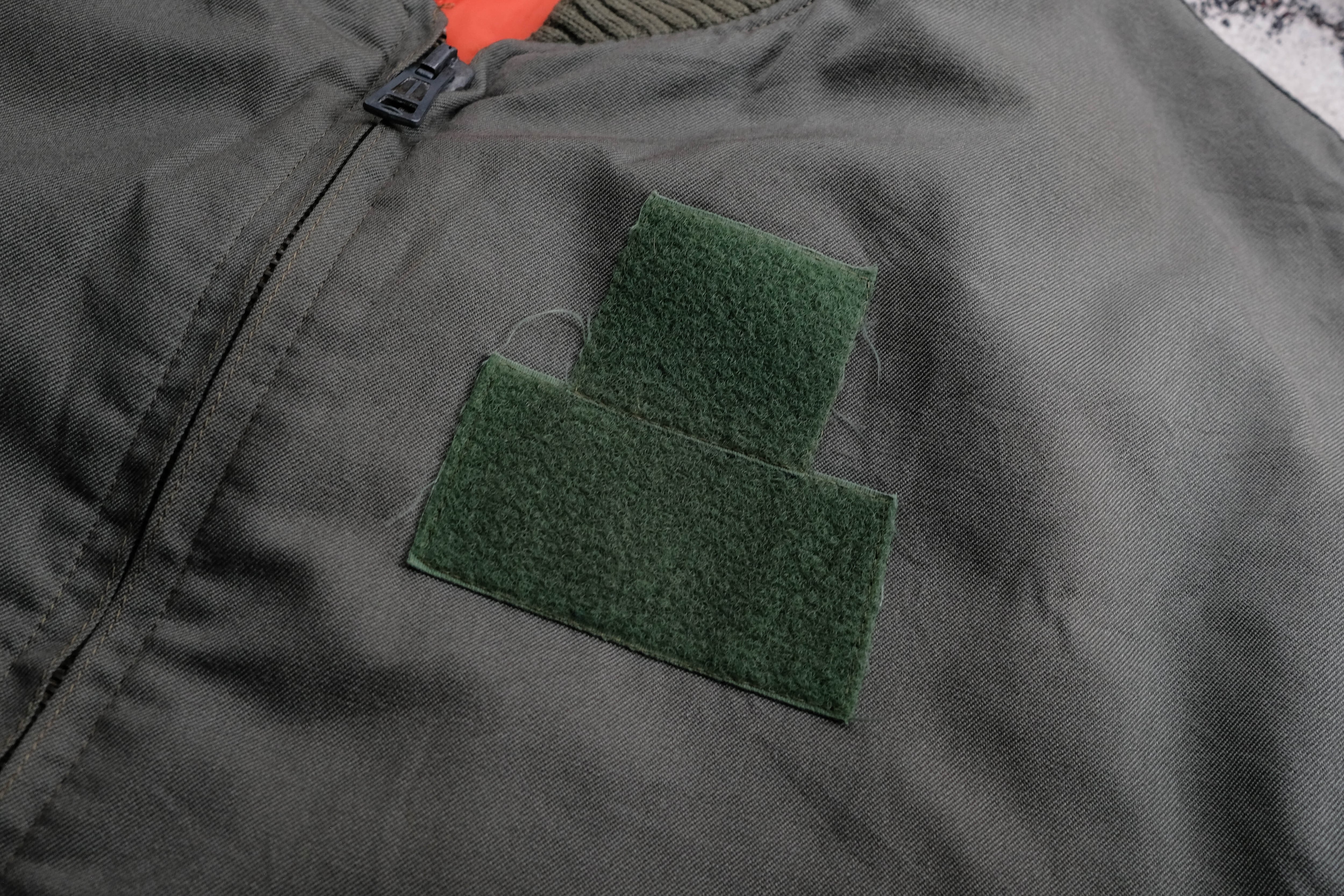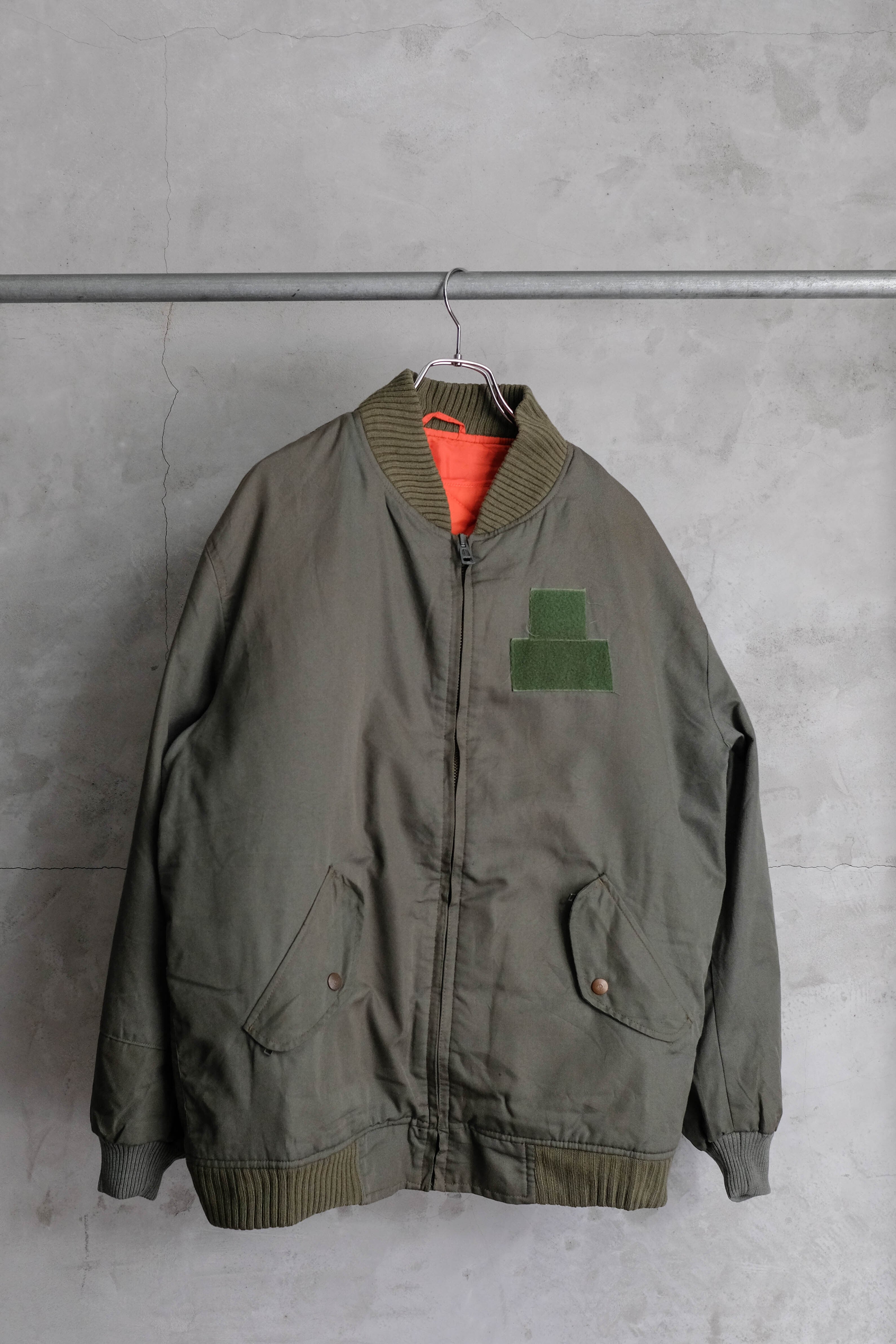 襟や袖、裾に施された肉厚なリブ、裏地のレスキューオレンジなど、アメリカ軍のMA1のような作りをしています。