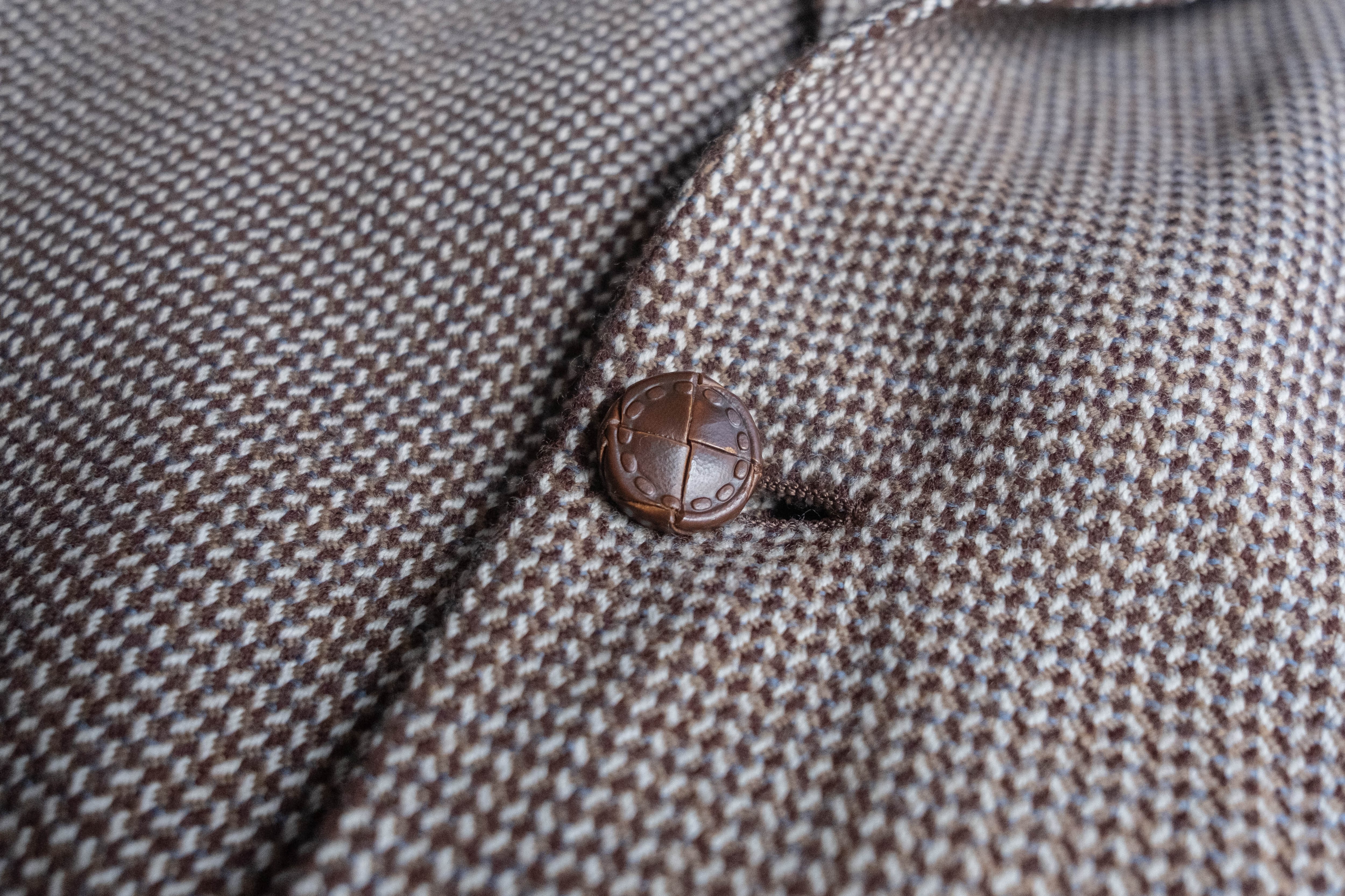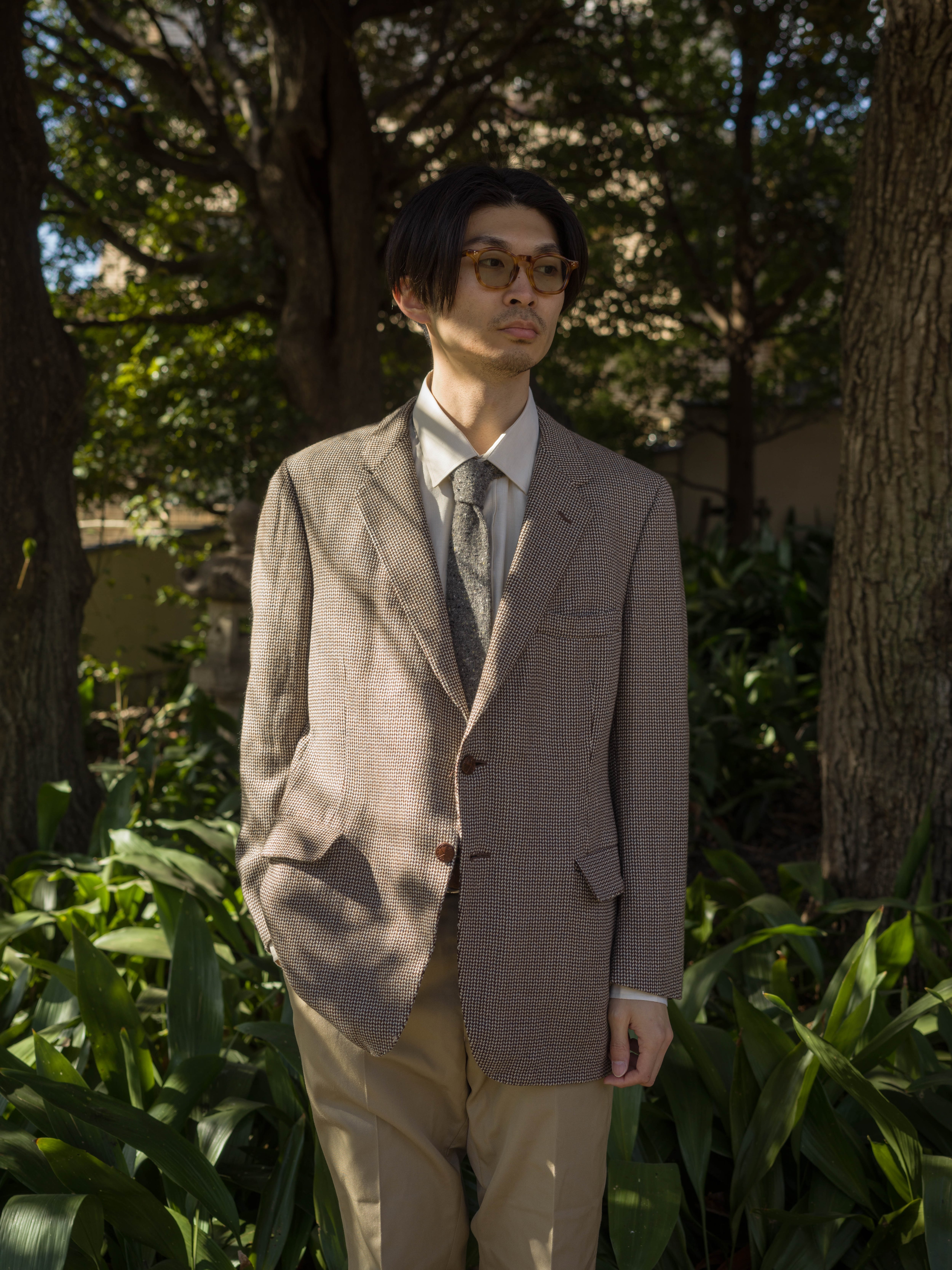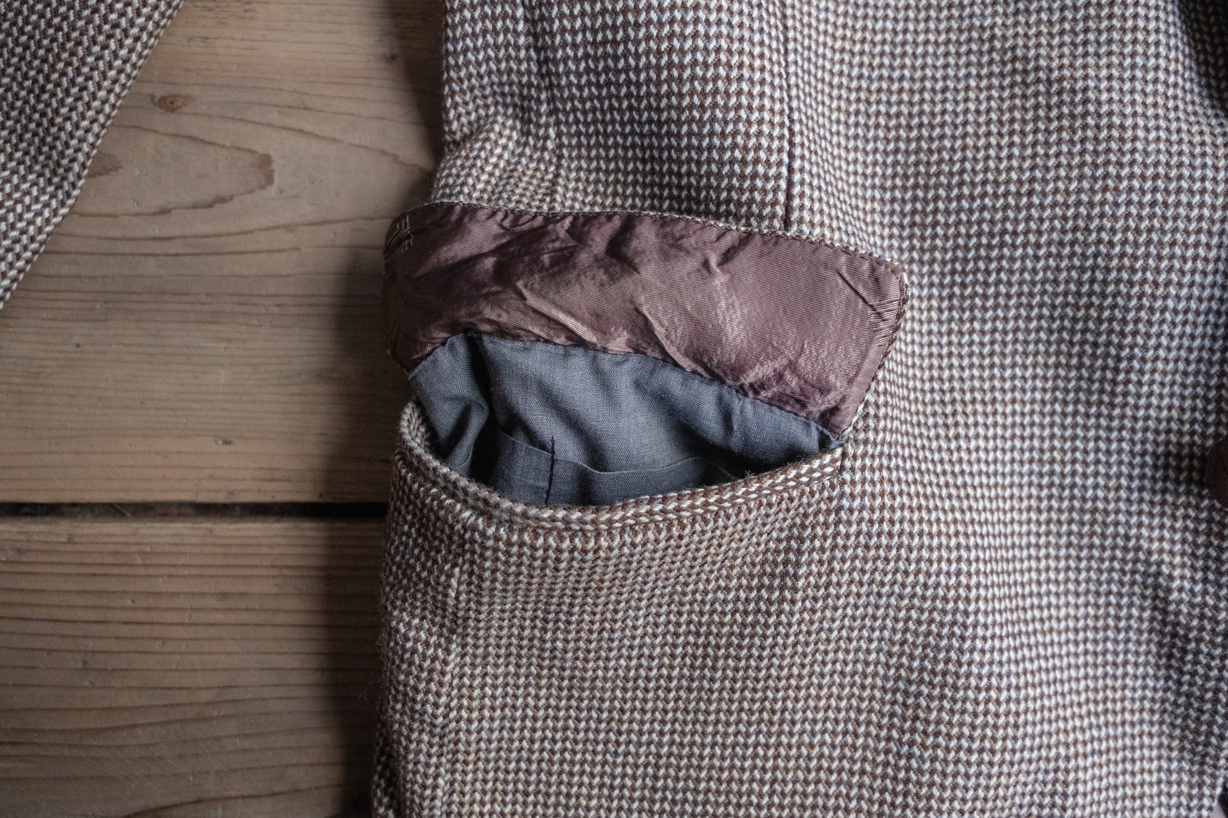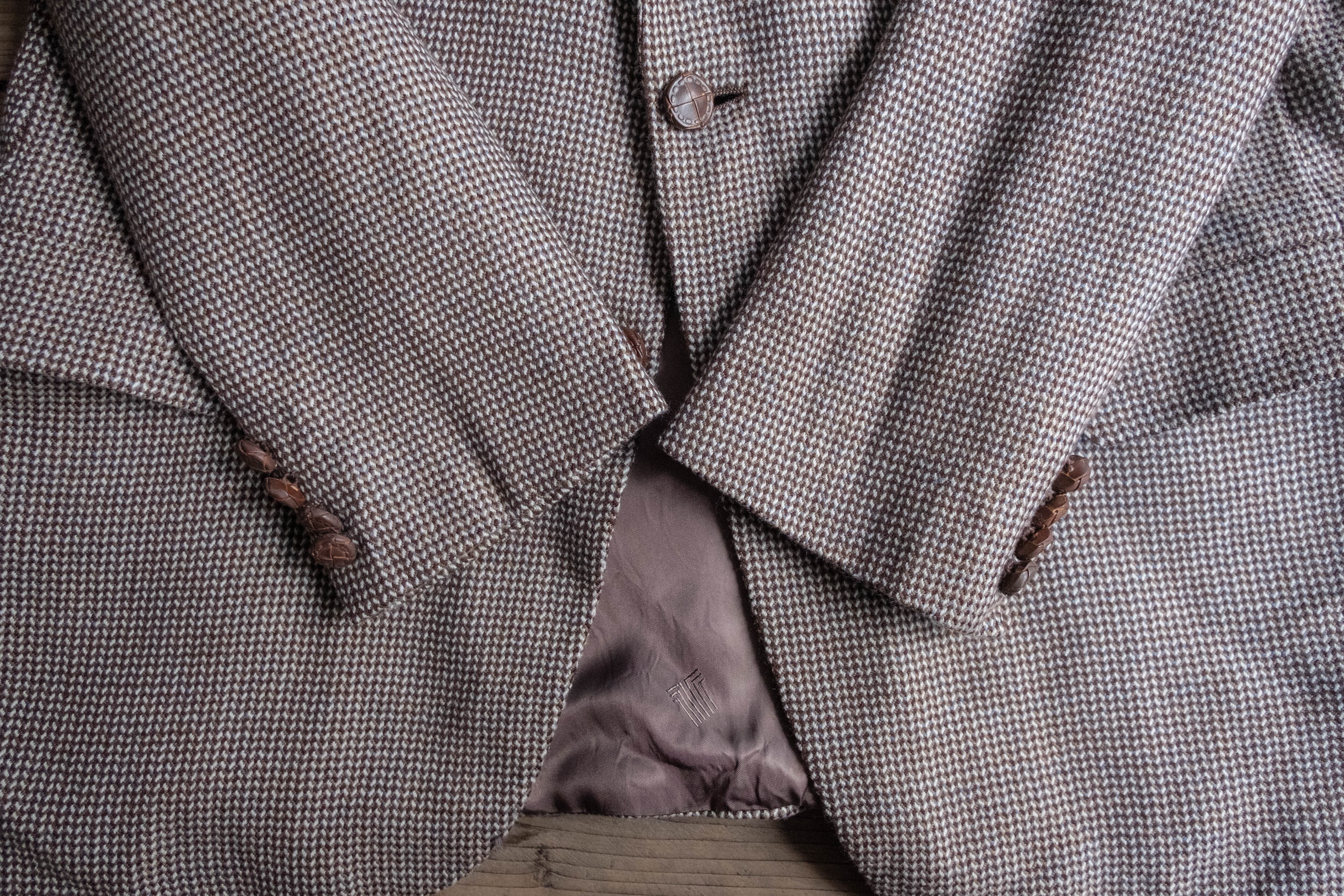 生地はブラウンベースの細かな千鳥格子で、英国ツイードを思わせるクラシックな表情ながら仕立てと素材感にはフランスらしい軽さと品の良さが感じられます。