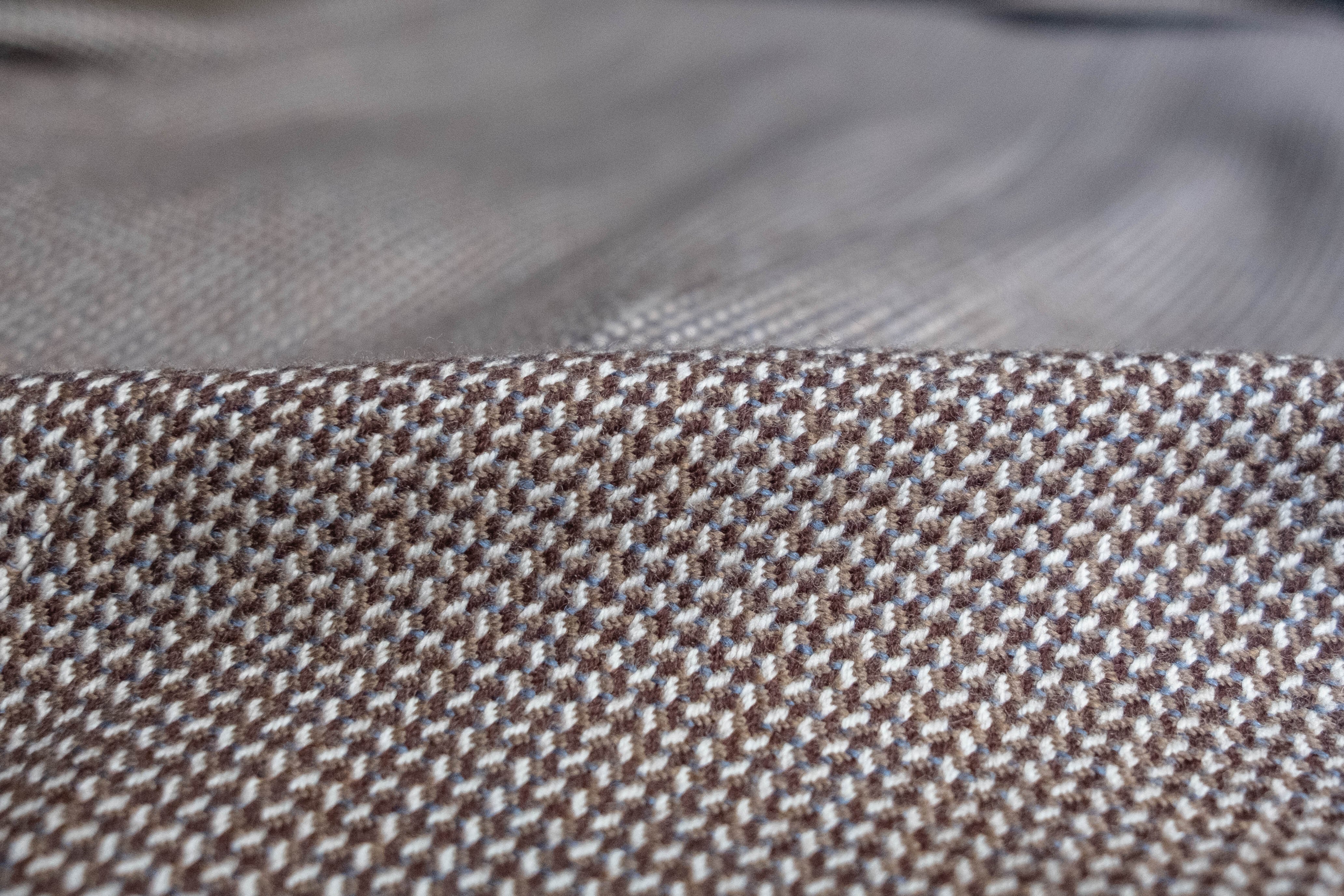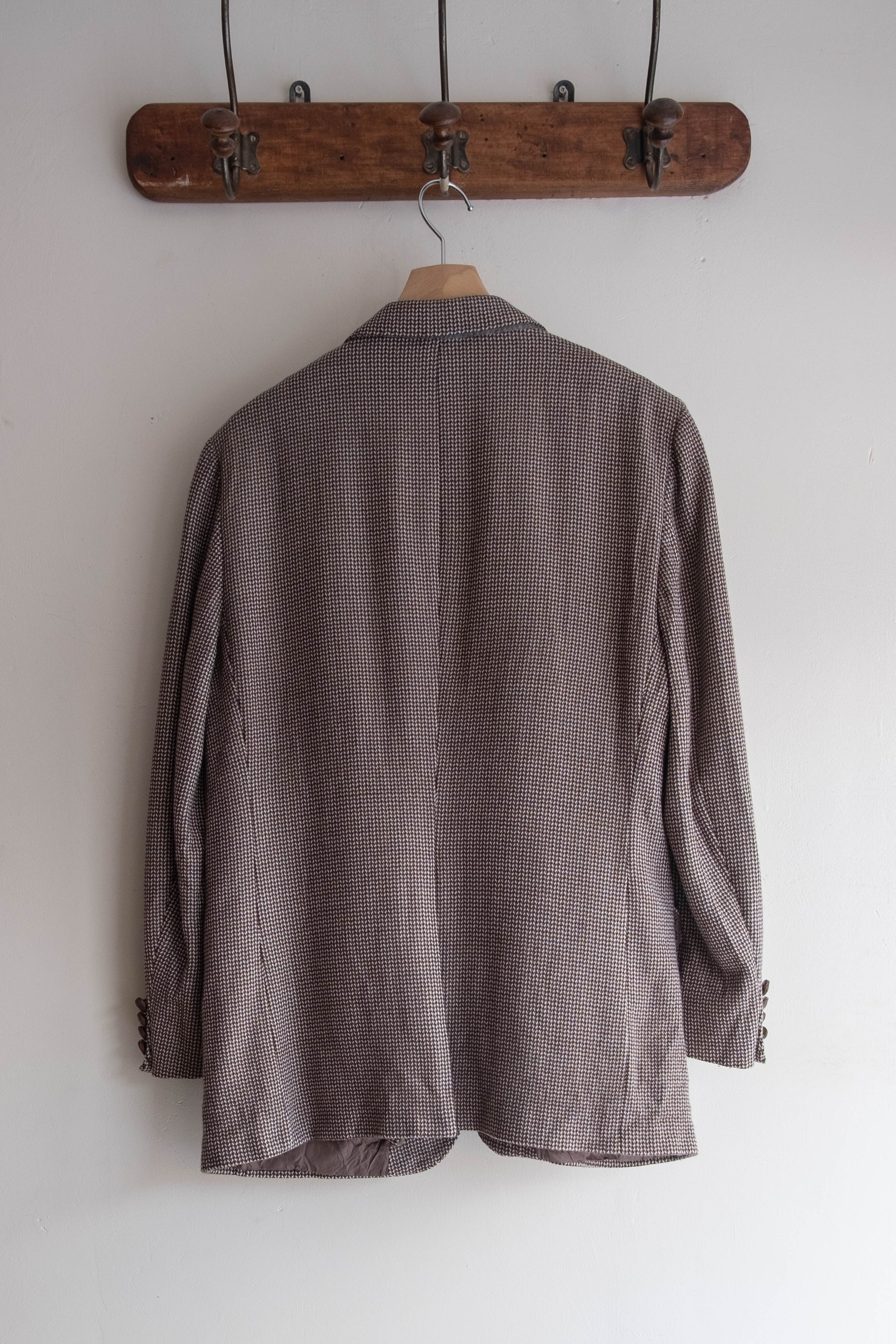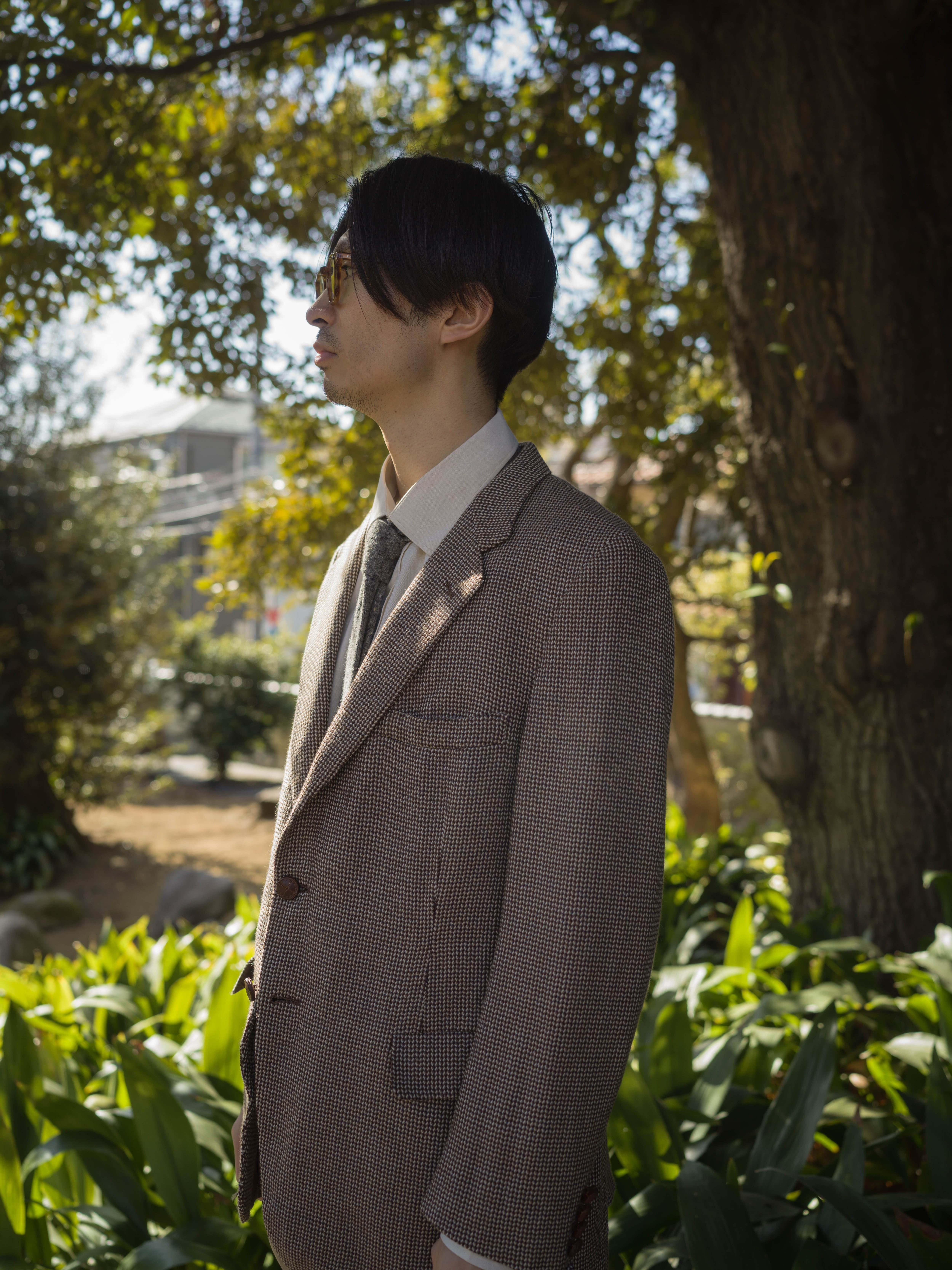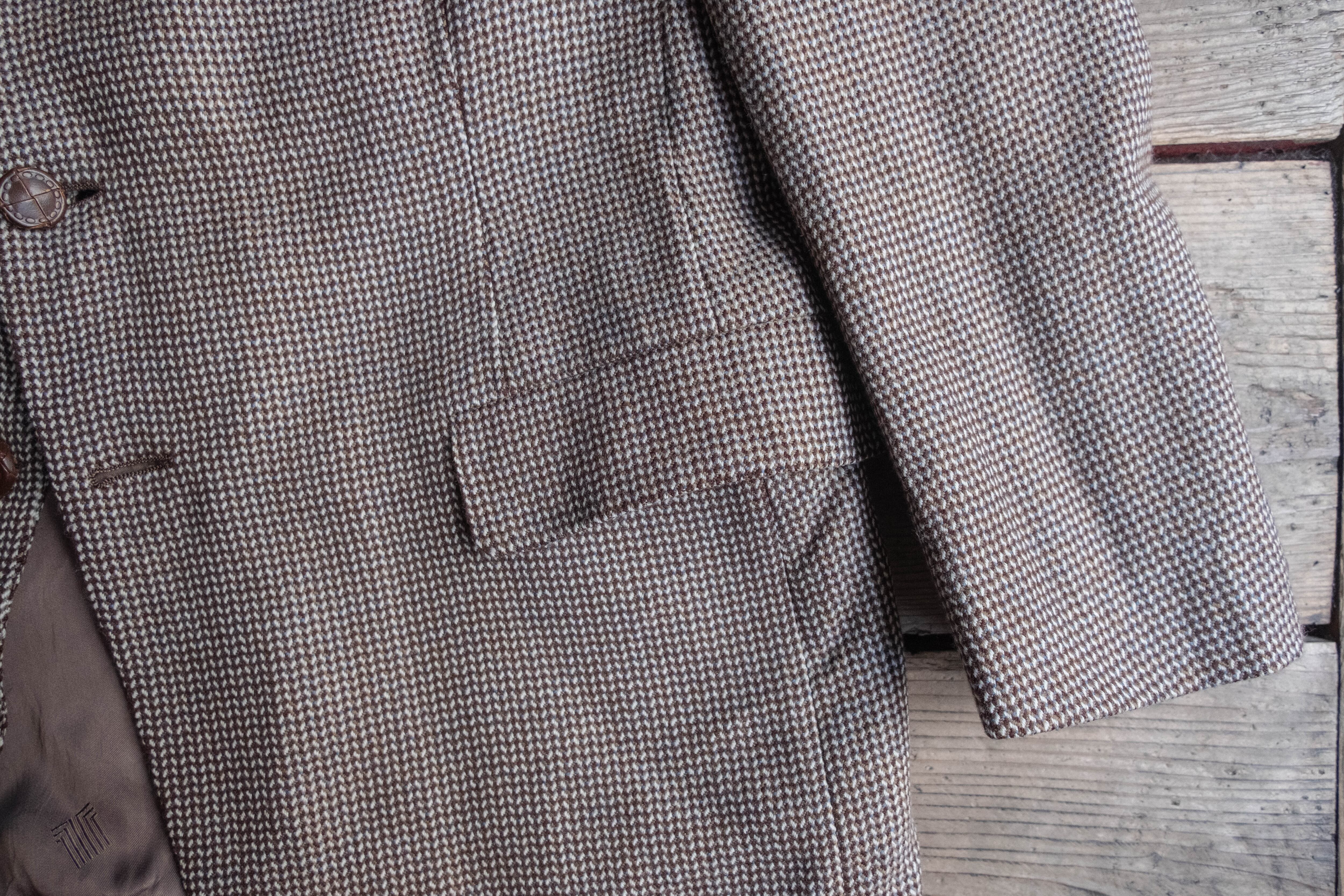 生地はブラウンベースの細かな千鳥格子で、英国ツイードを思わせるクラシックな表情ながら仕立てと素材感にはフランスらしい軽さと品の良さが感じられます。
