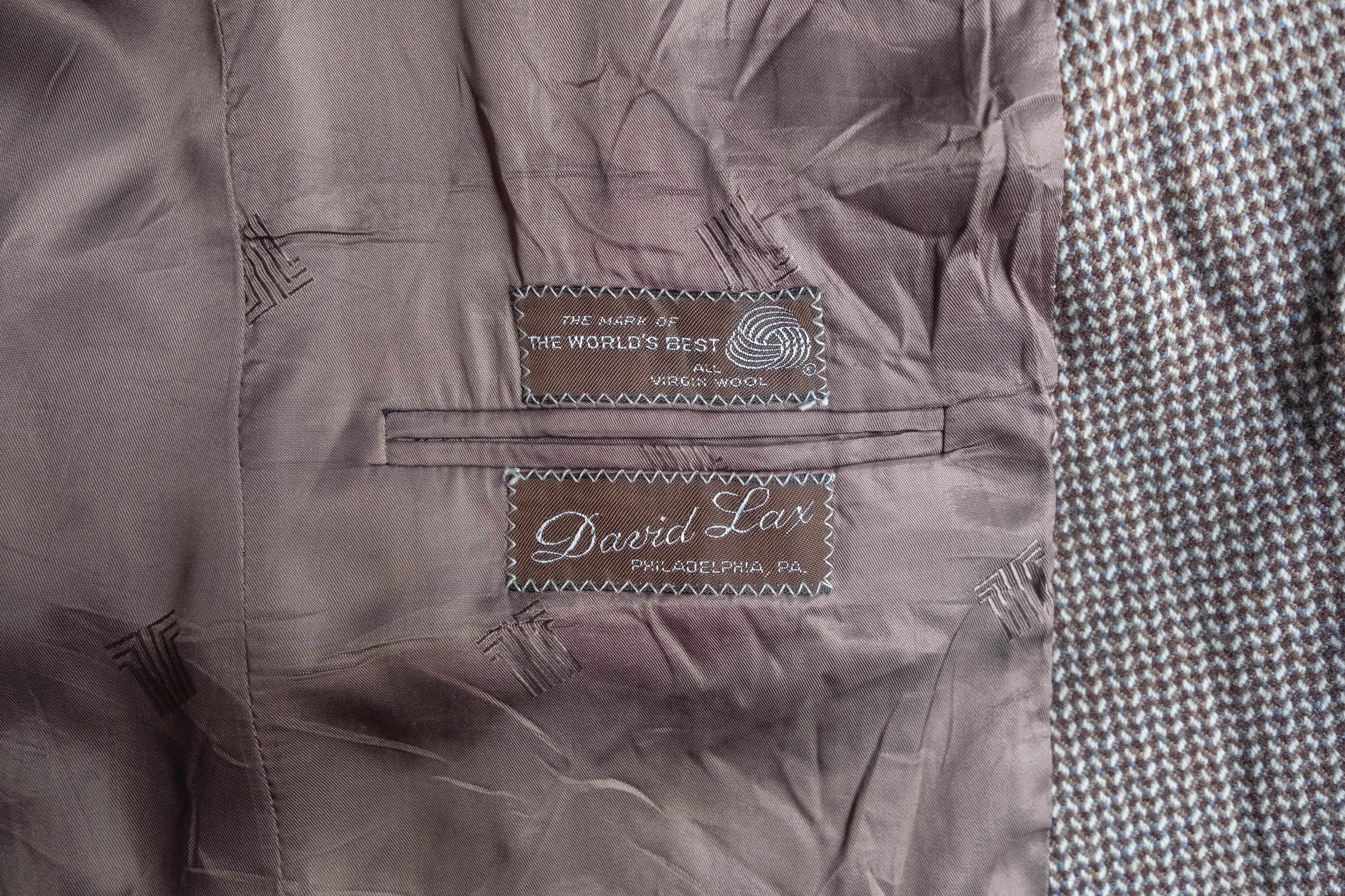 アメリカ・フィラデルフィアのテーラー「David Lau」向けに仕立てられた個体で、当時の上質な既製服らしい落ち着いた佇まいが魅力です。