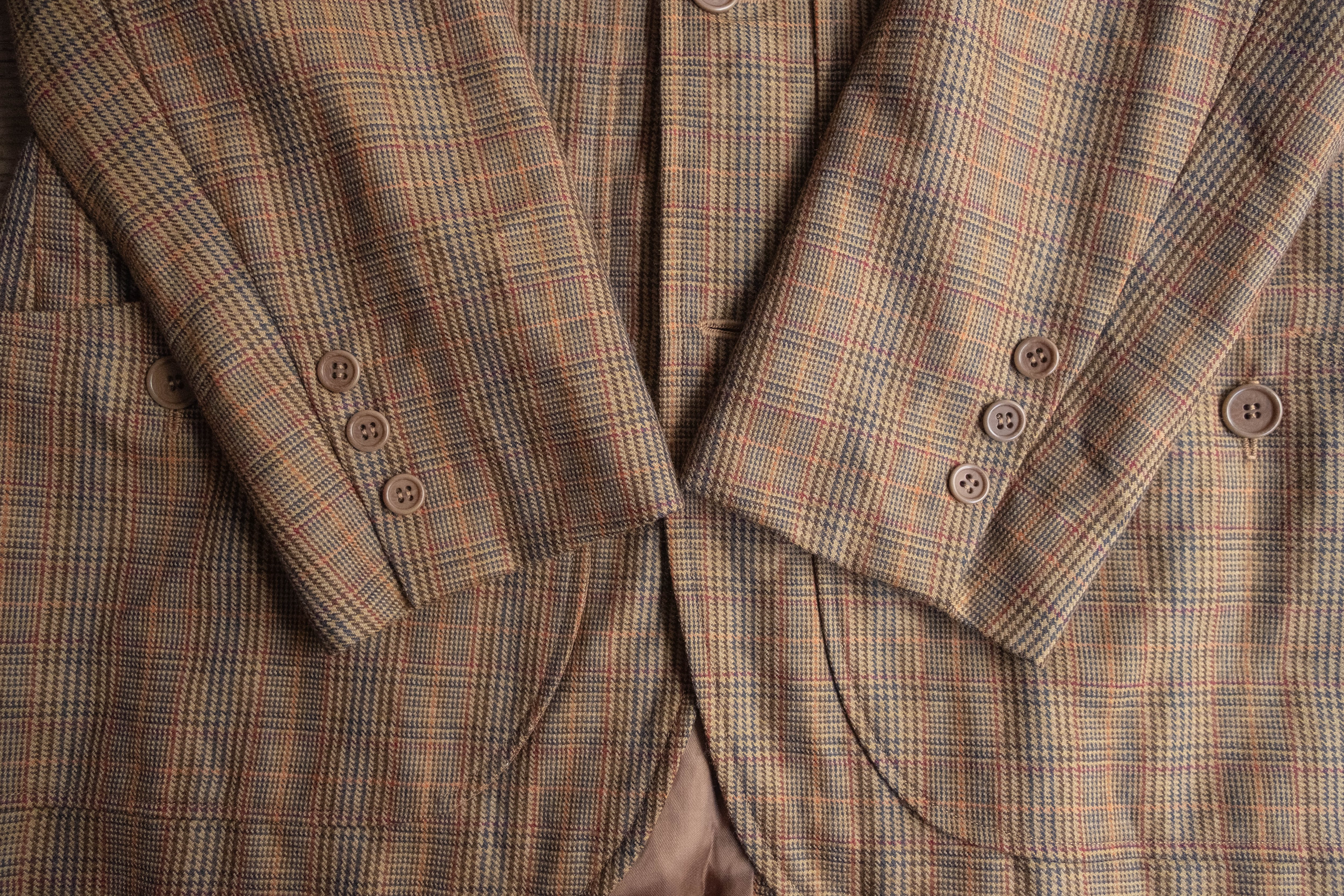 ブラウンベースの細かなチェックは、ベージュやオリーブの糸に加え、赤やブルーのラインが走る奥行きのある配色です。