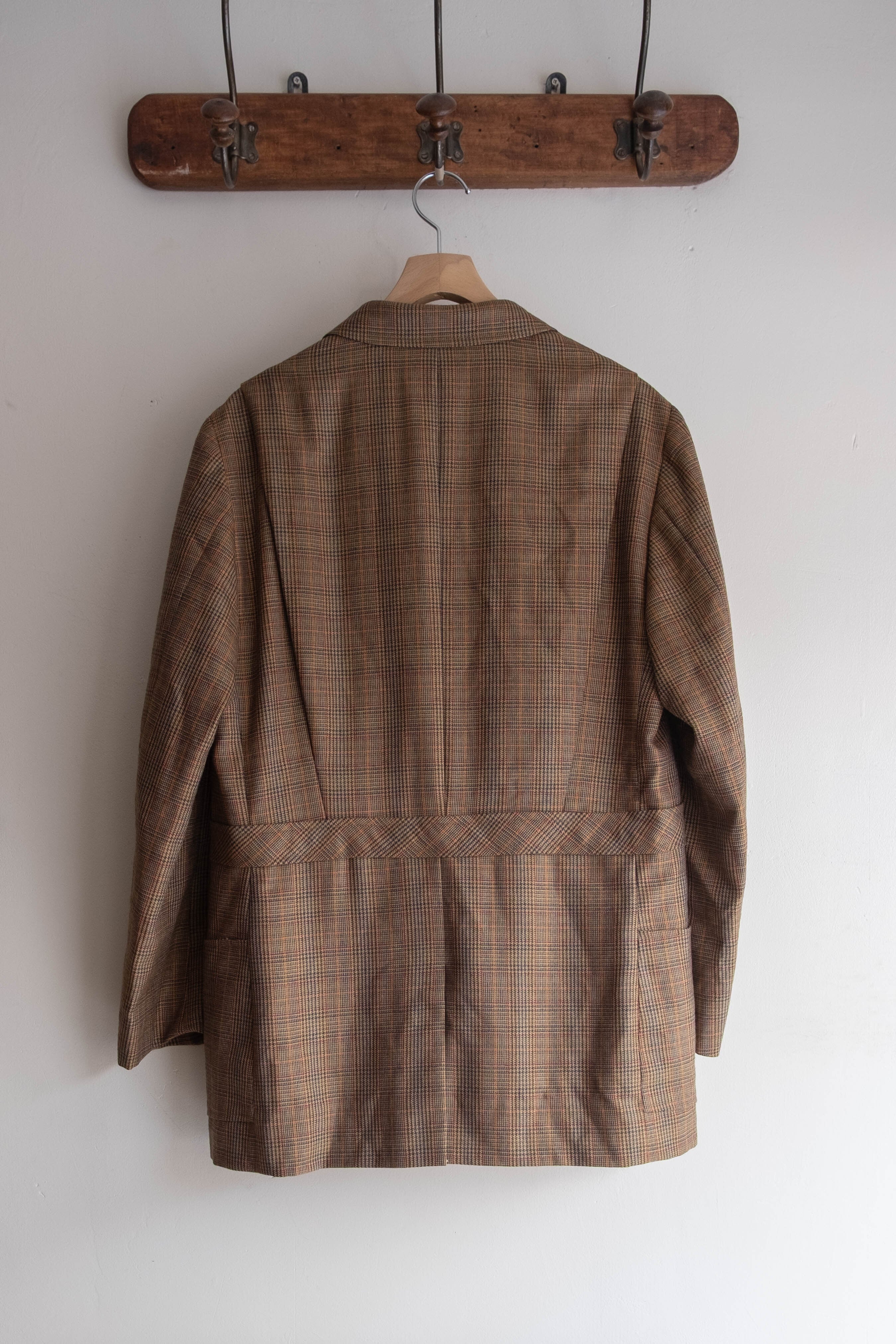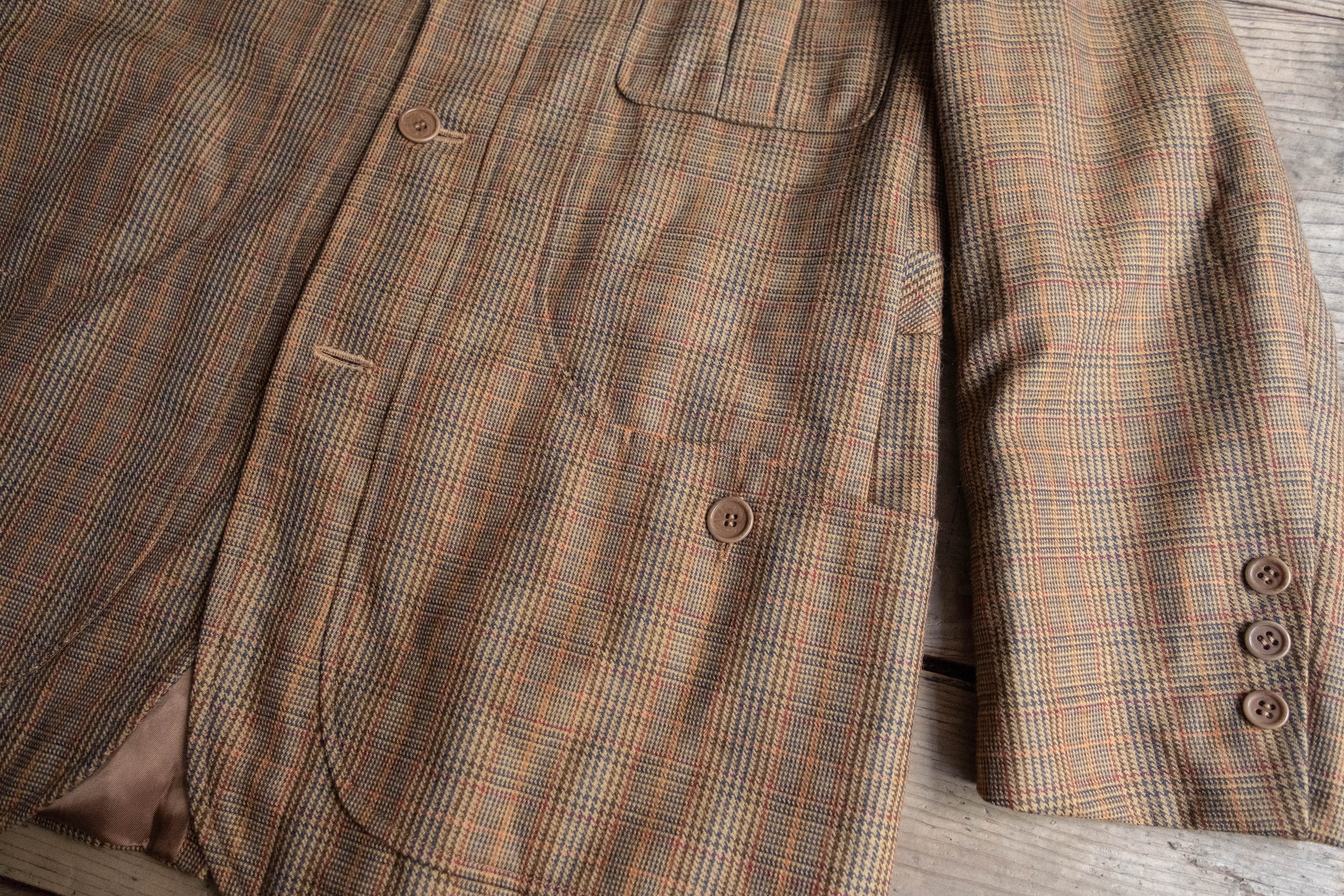 テーラードのラペルに、ハンティングジャケット的な収納力を持たせた構成で、いわゆるドレスとカジュアルの中間を狙った当時らしい提案が感じられます。