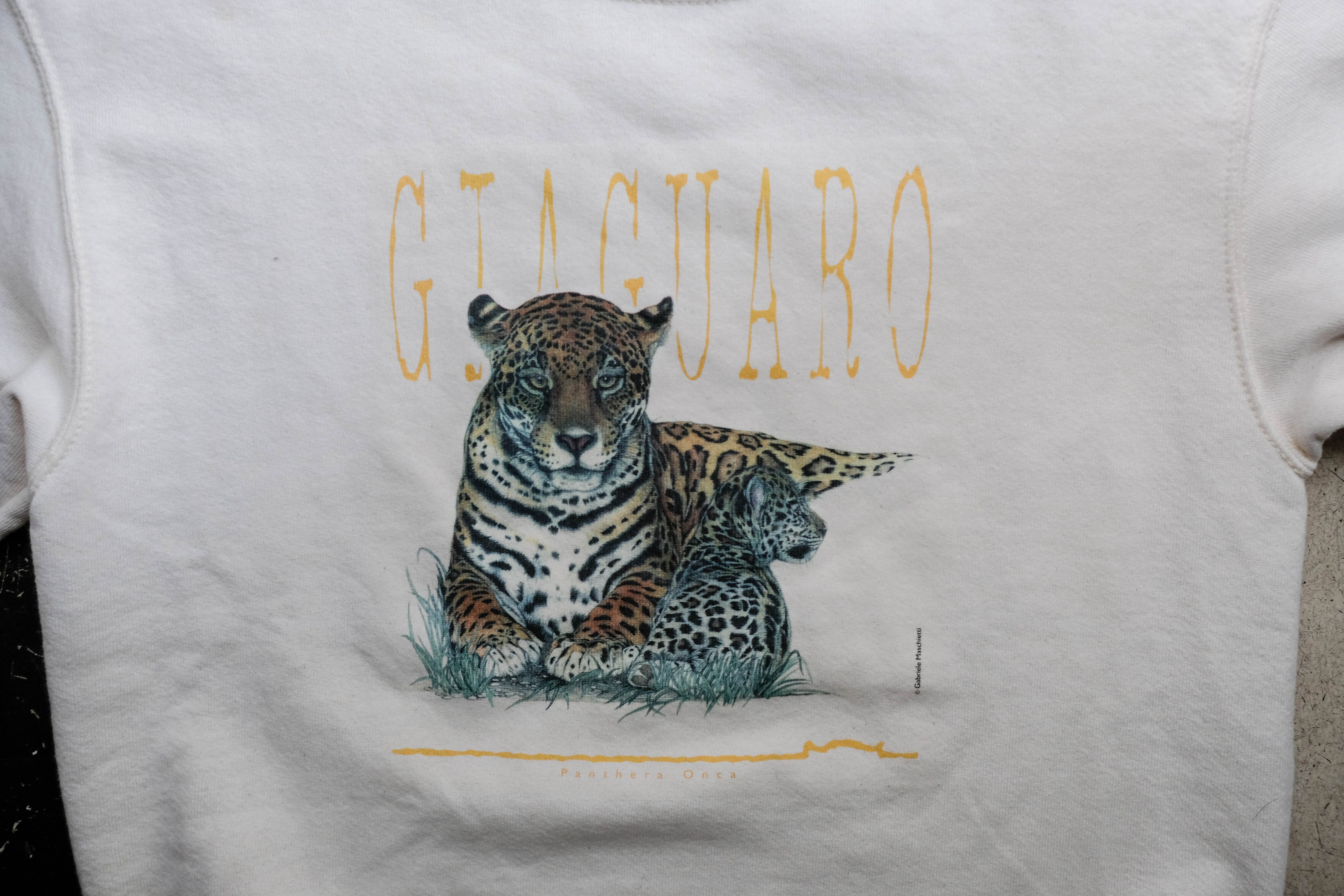生成りカラーのボディに、ジャガーの親子がプリントされています。