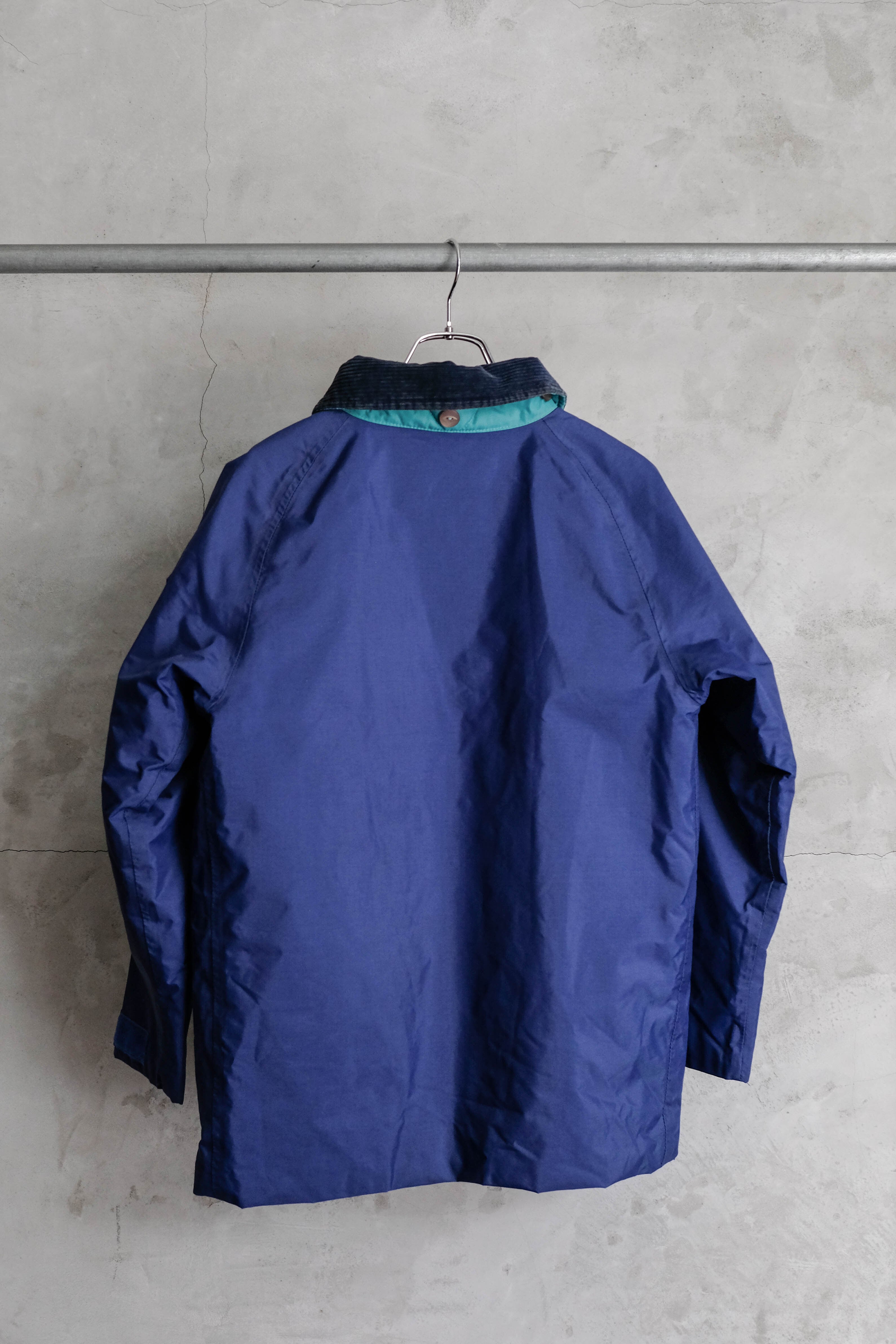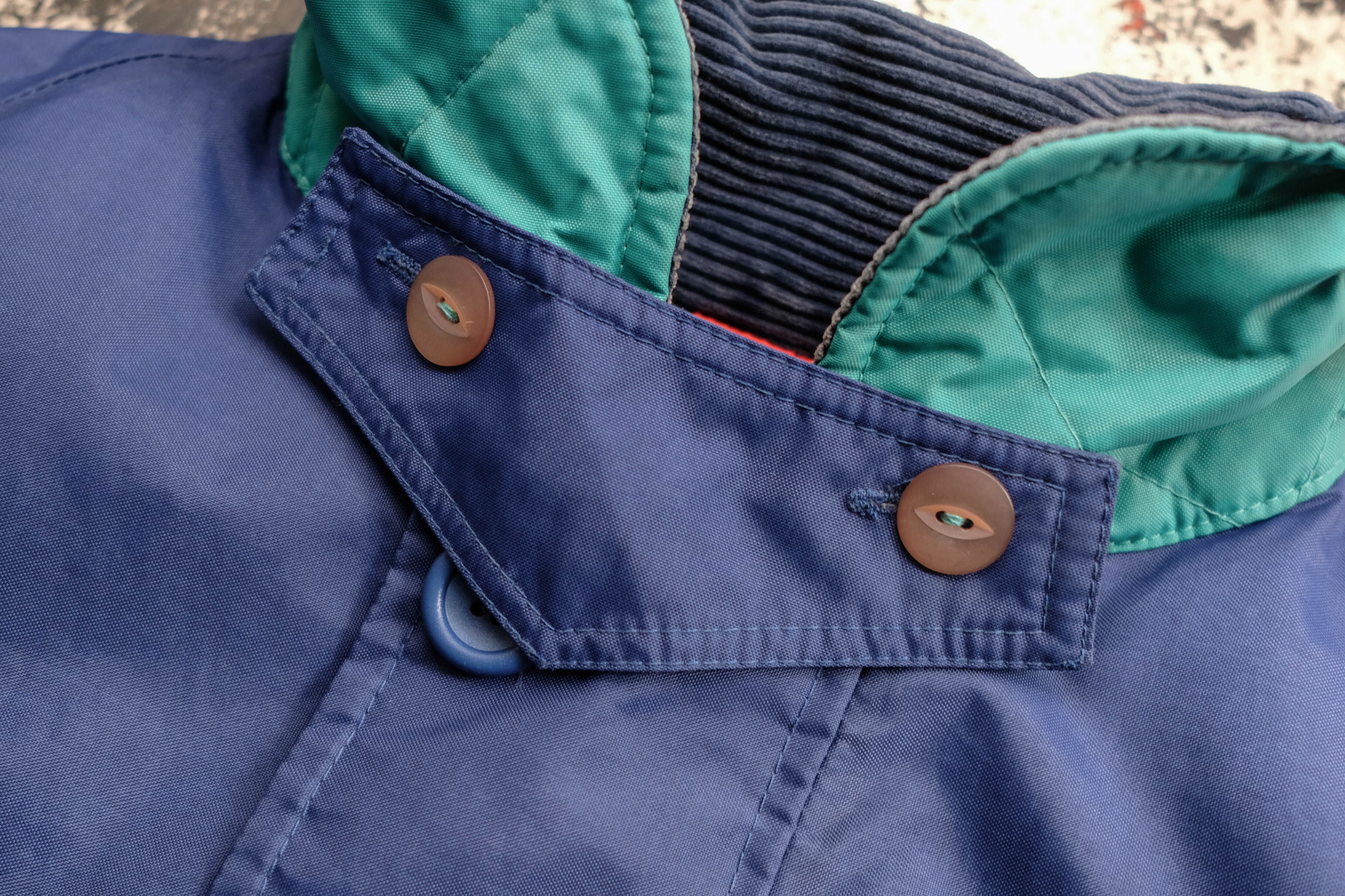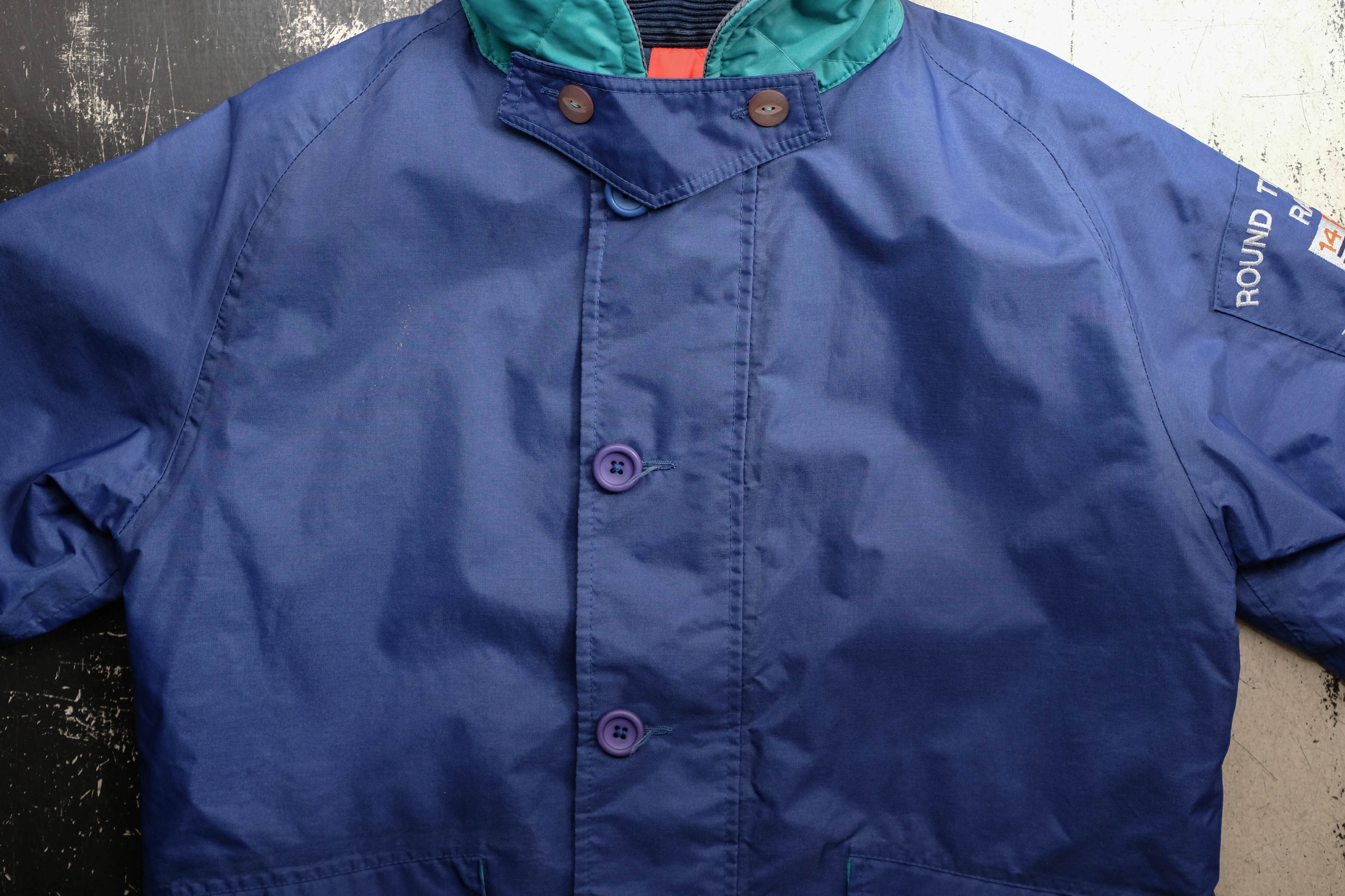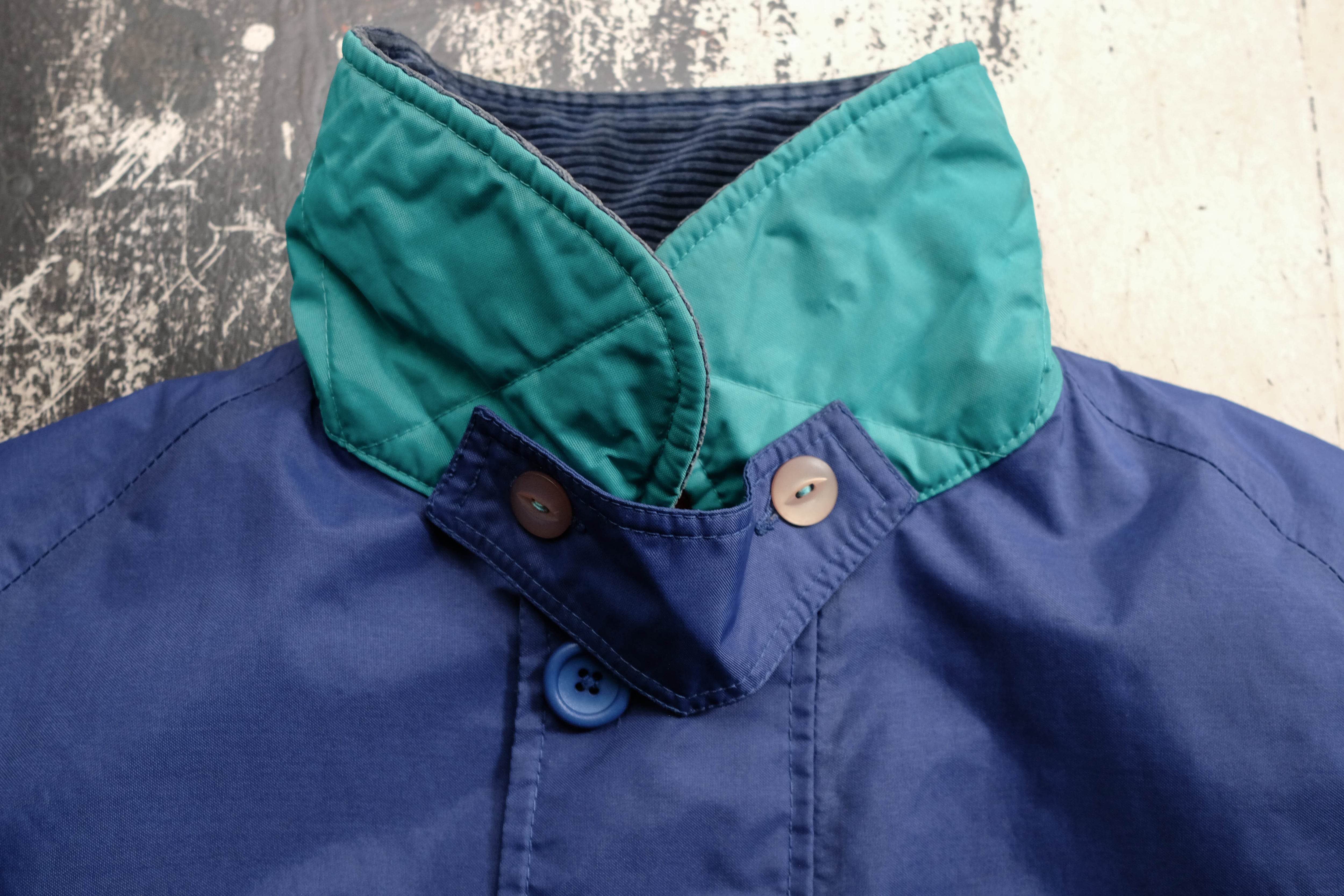 発色の良いブルーのシェルにコーデュロイの襟、そして鮮やかなレッドのキルティングライニングを備えたセーリングジャケット。