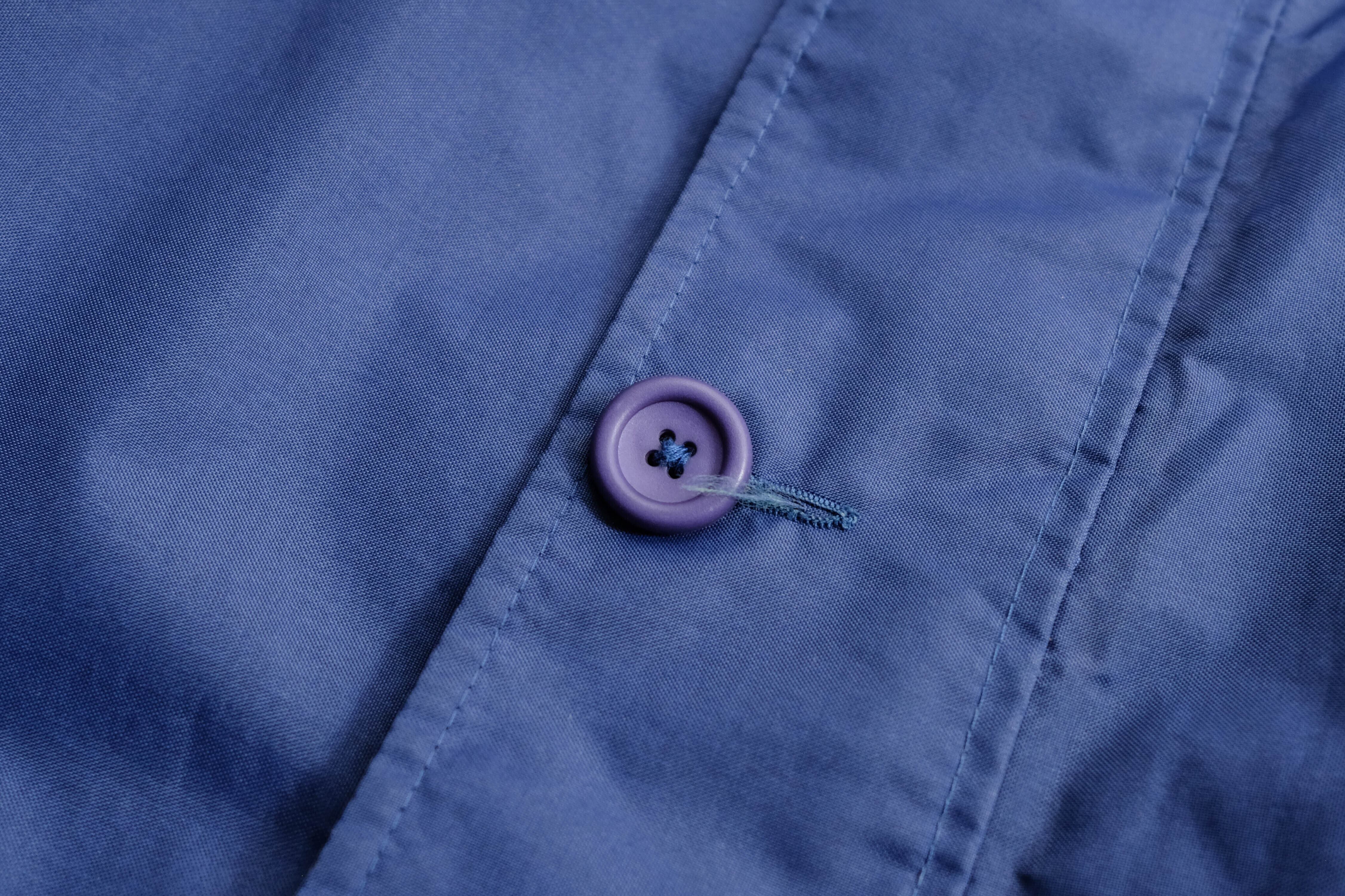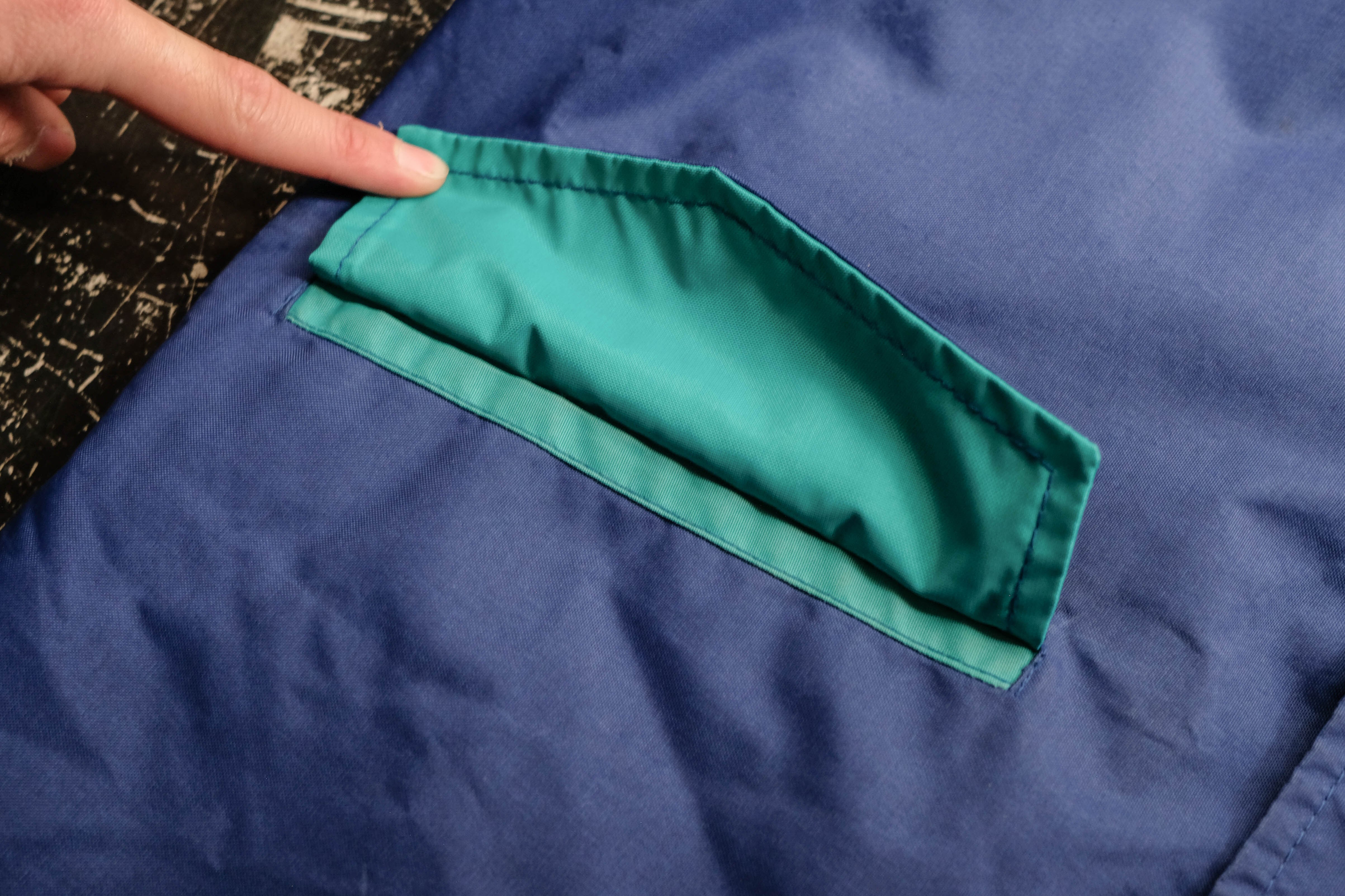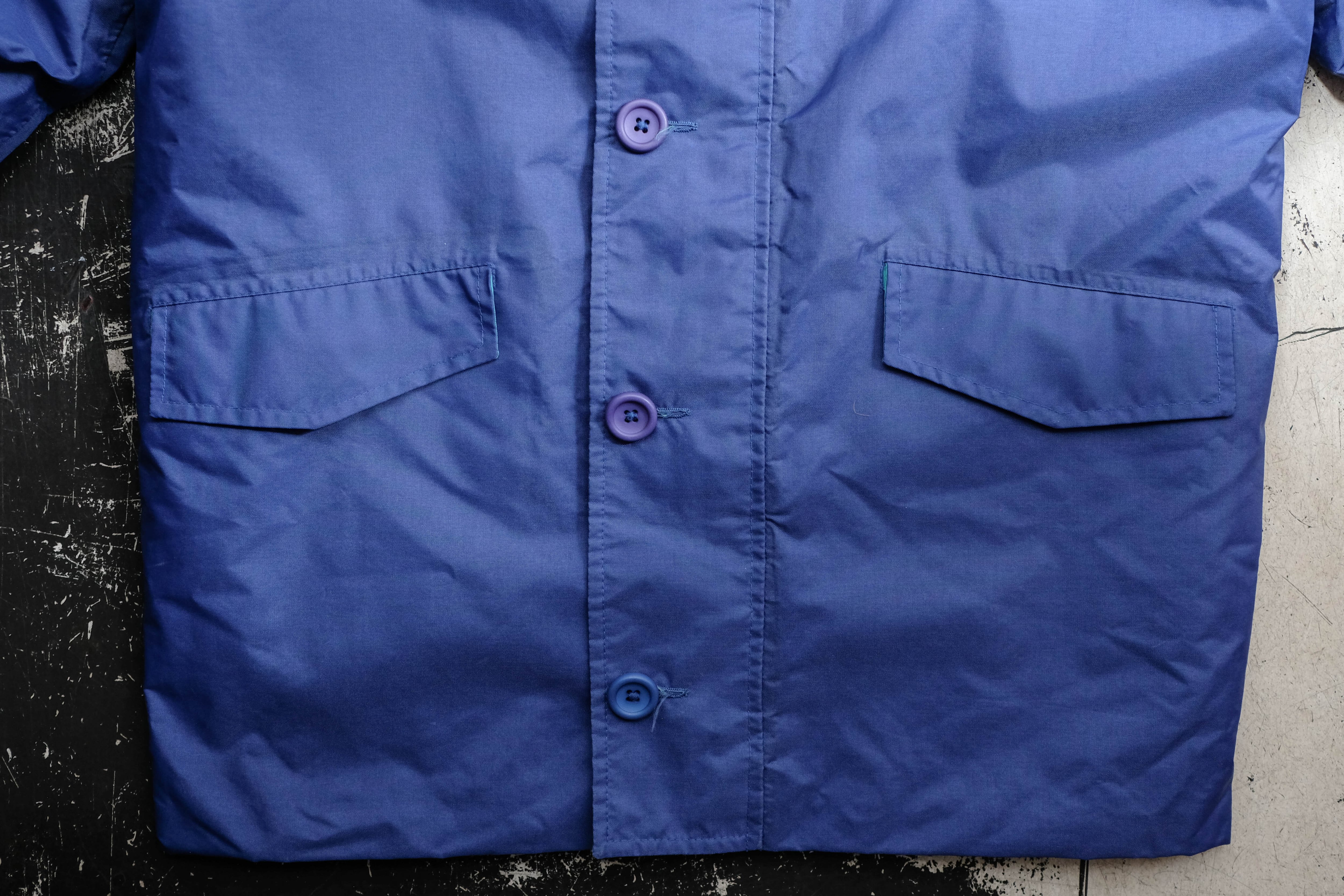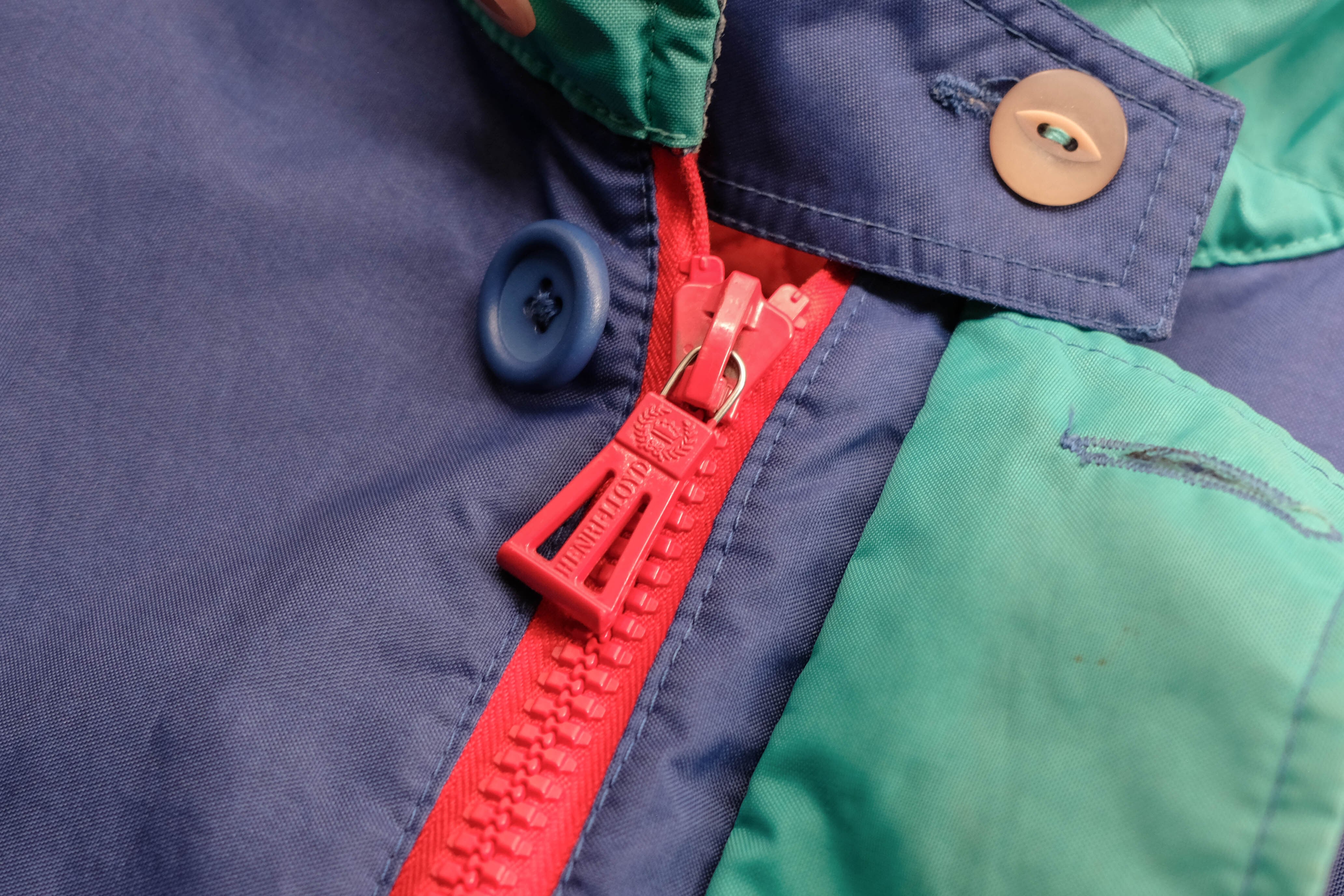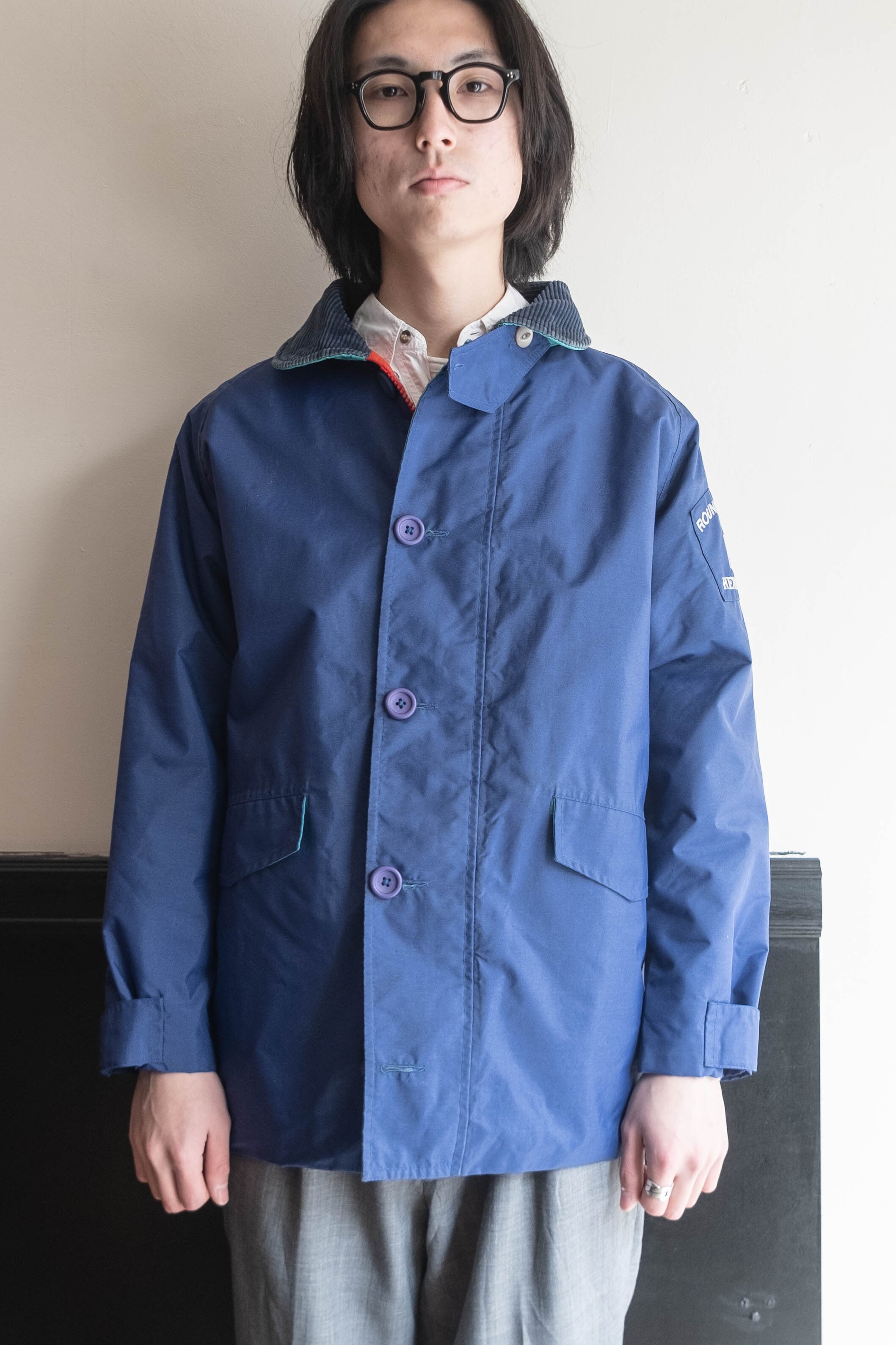 発色の良いブルーのシェルにコーデュロイの襟、そして鮮やかなレッドのキルティングライニングを備えたセーリングジャケット。