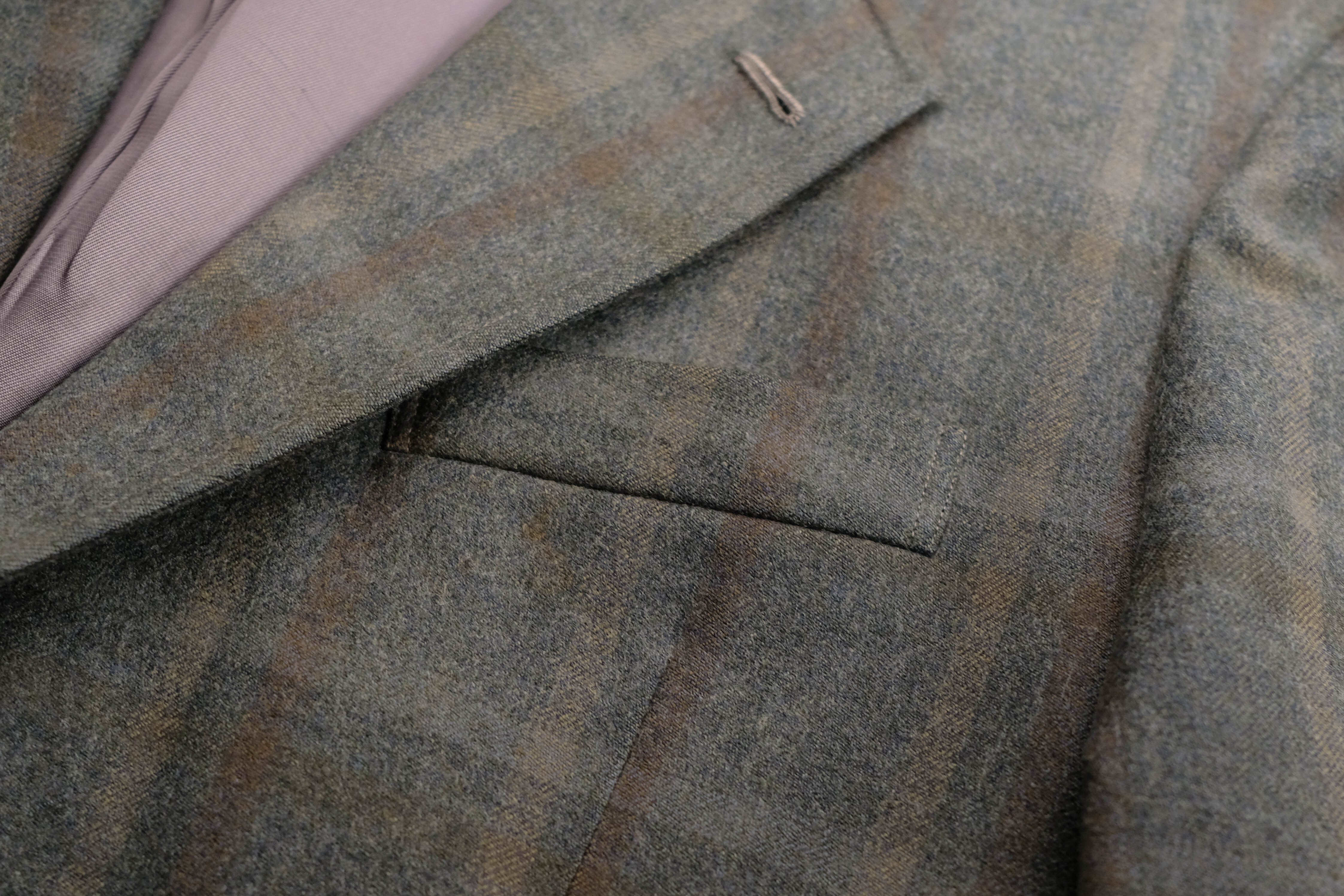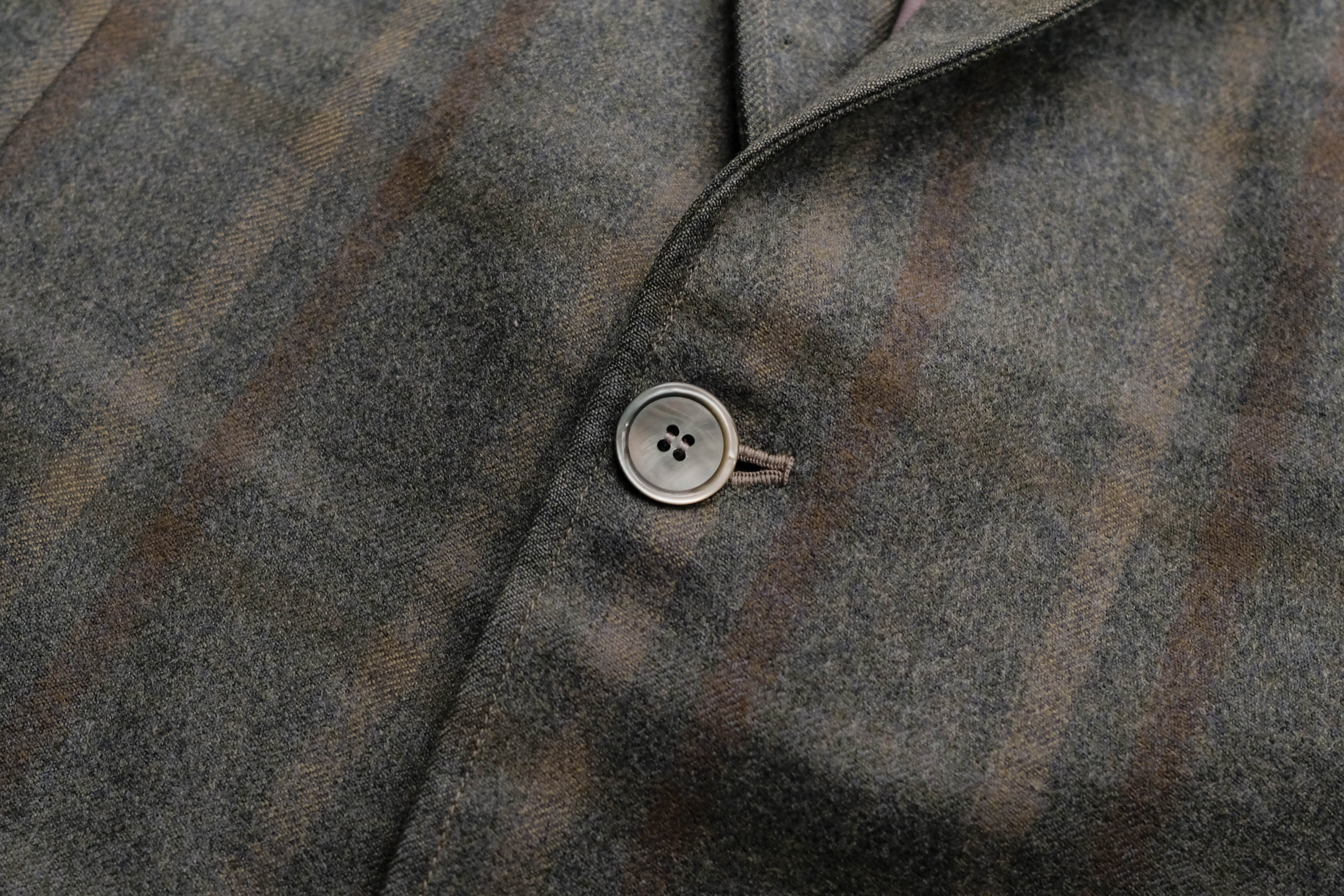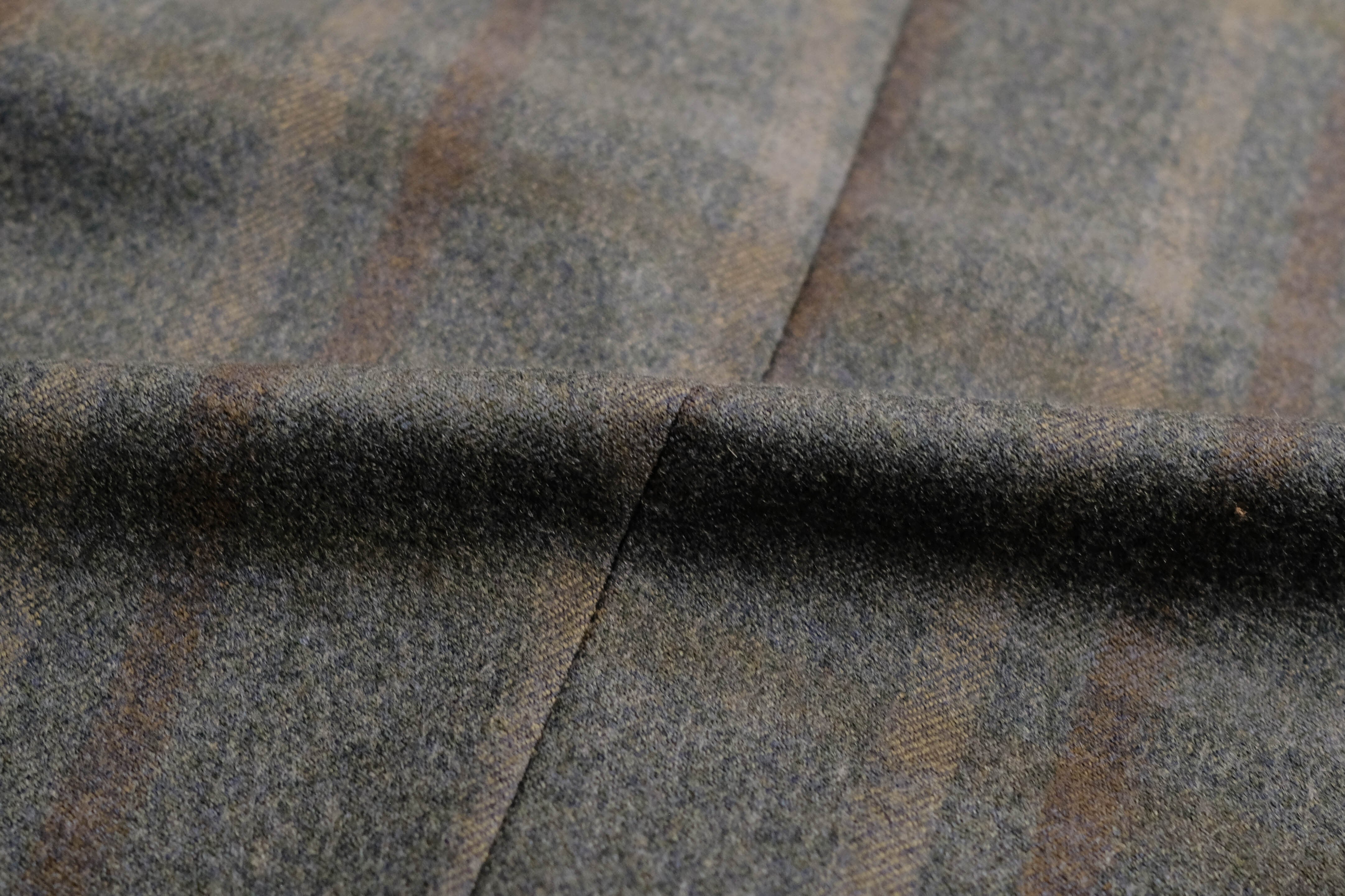 グレーグリーンのような曖昧なカラーをベースに、うっすらとブラウンやカーキのラインが走る控えめなチェック柄。