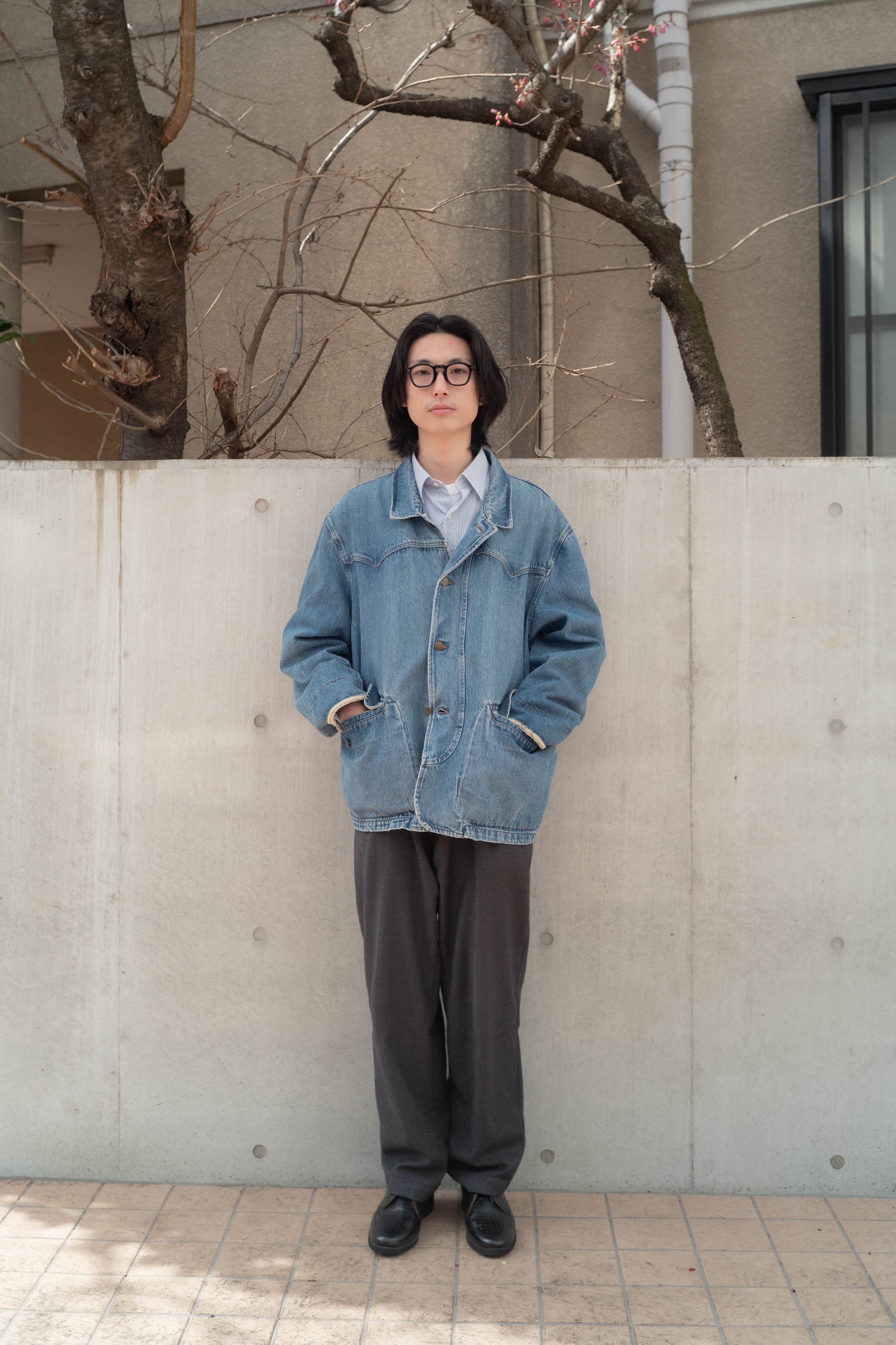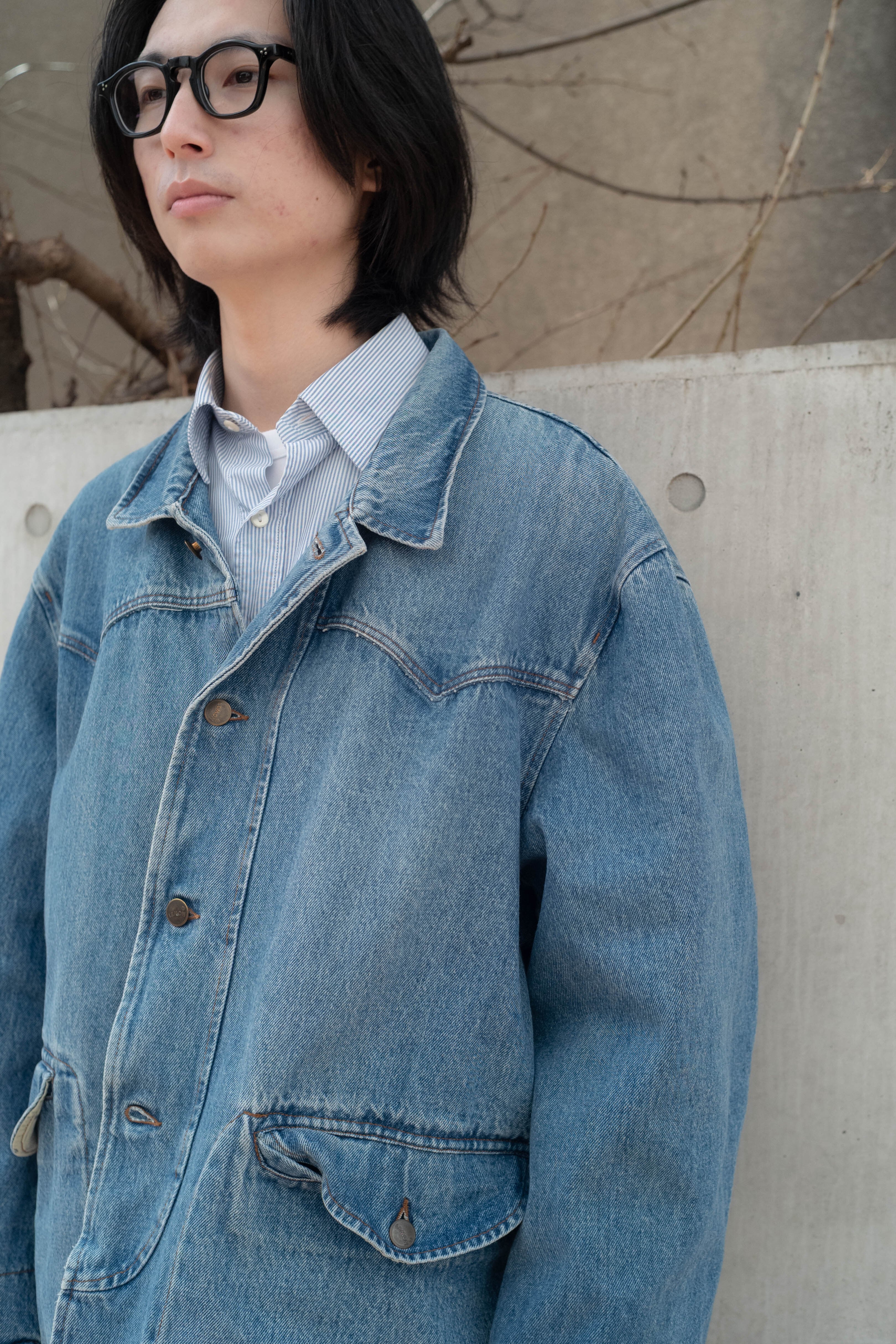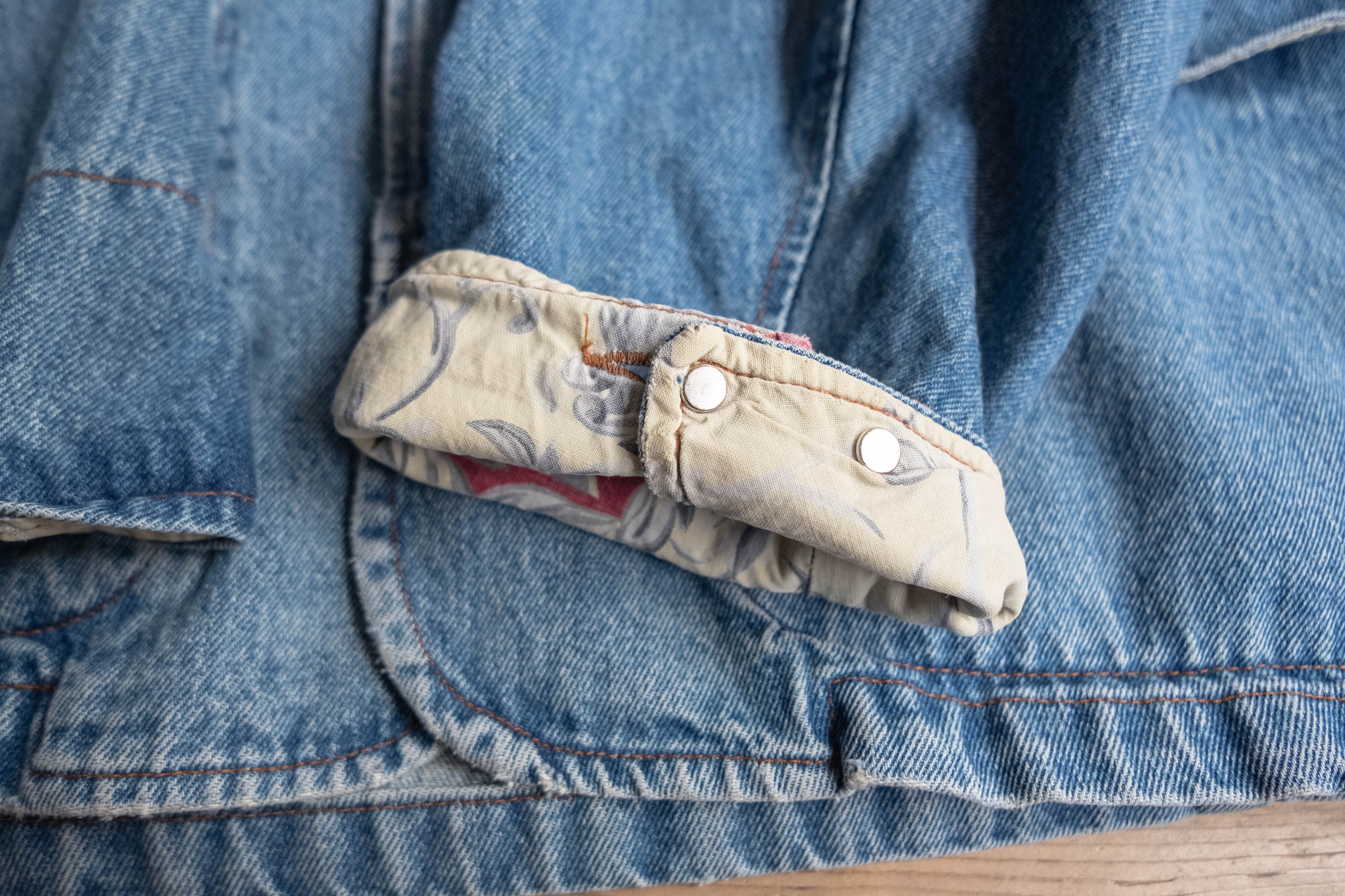 ベースはシンプルなデニムジャケットですが、襟裏やポケット裏の切り替えがさりげないアクセントになっています。