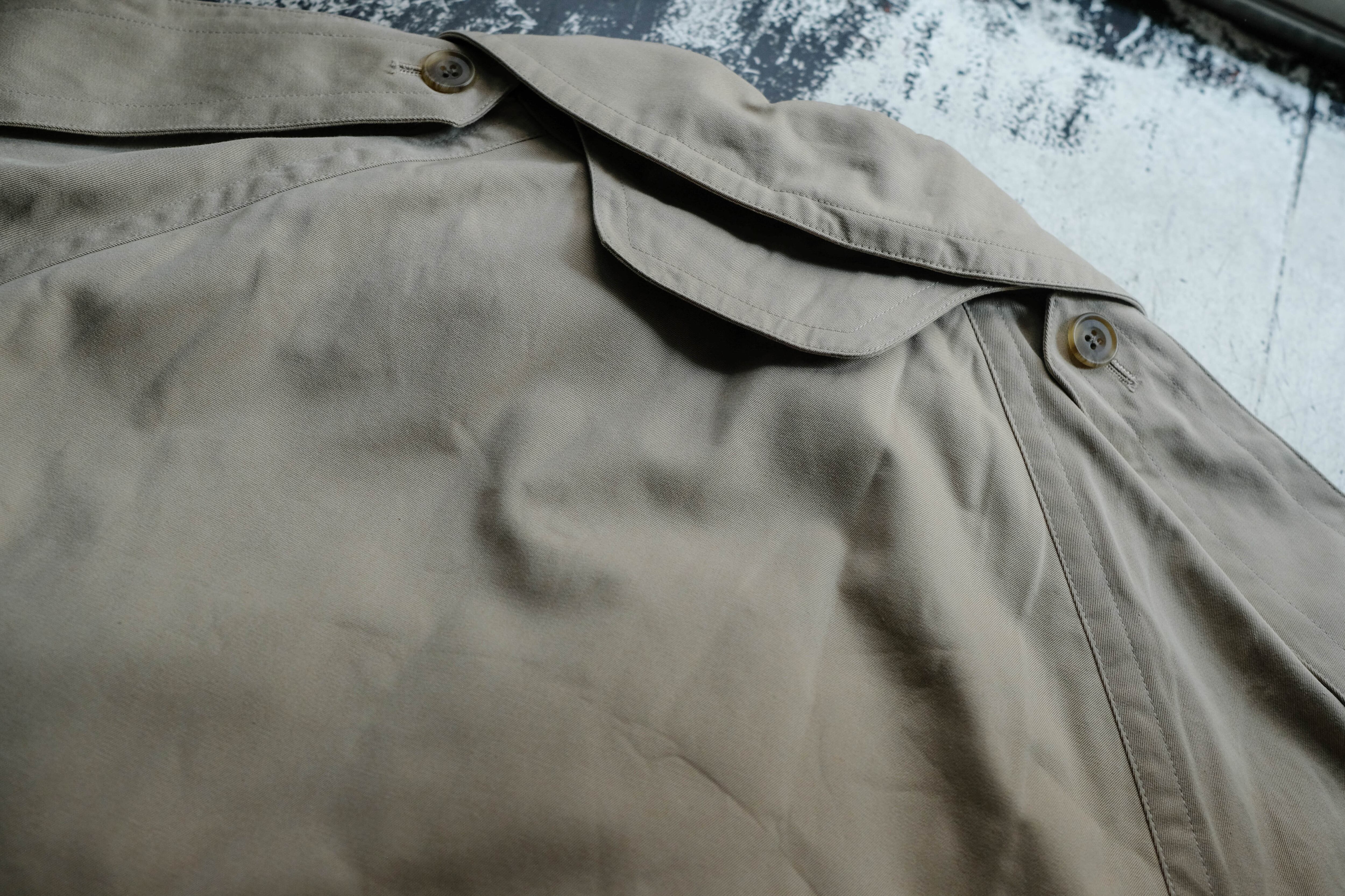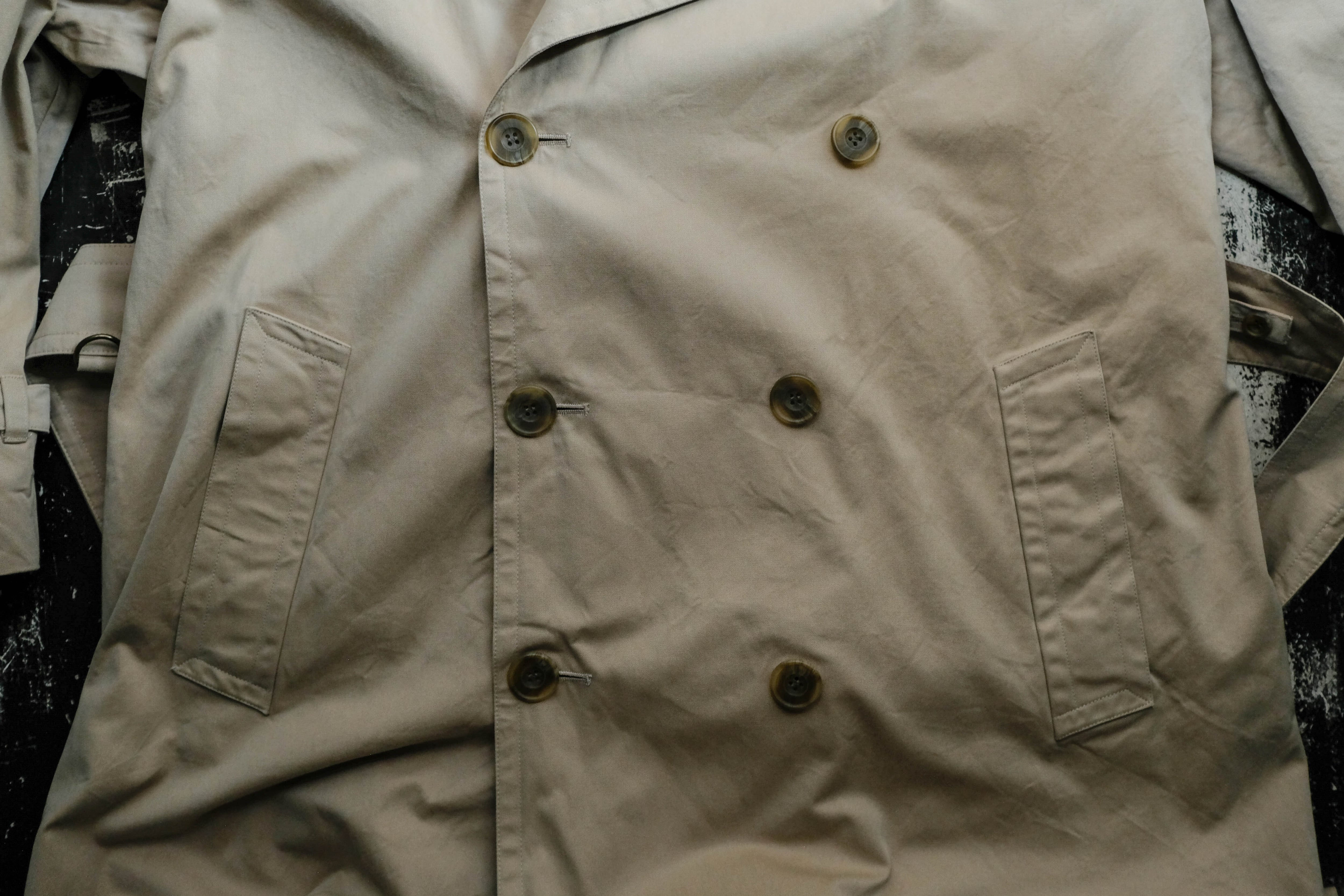 クラシックなダブルブレスト、エポレットやストームフラップといったディテールも一通り揃ったトレンチコートです。