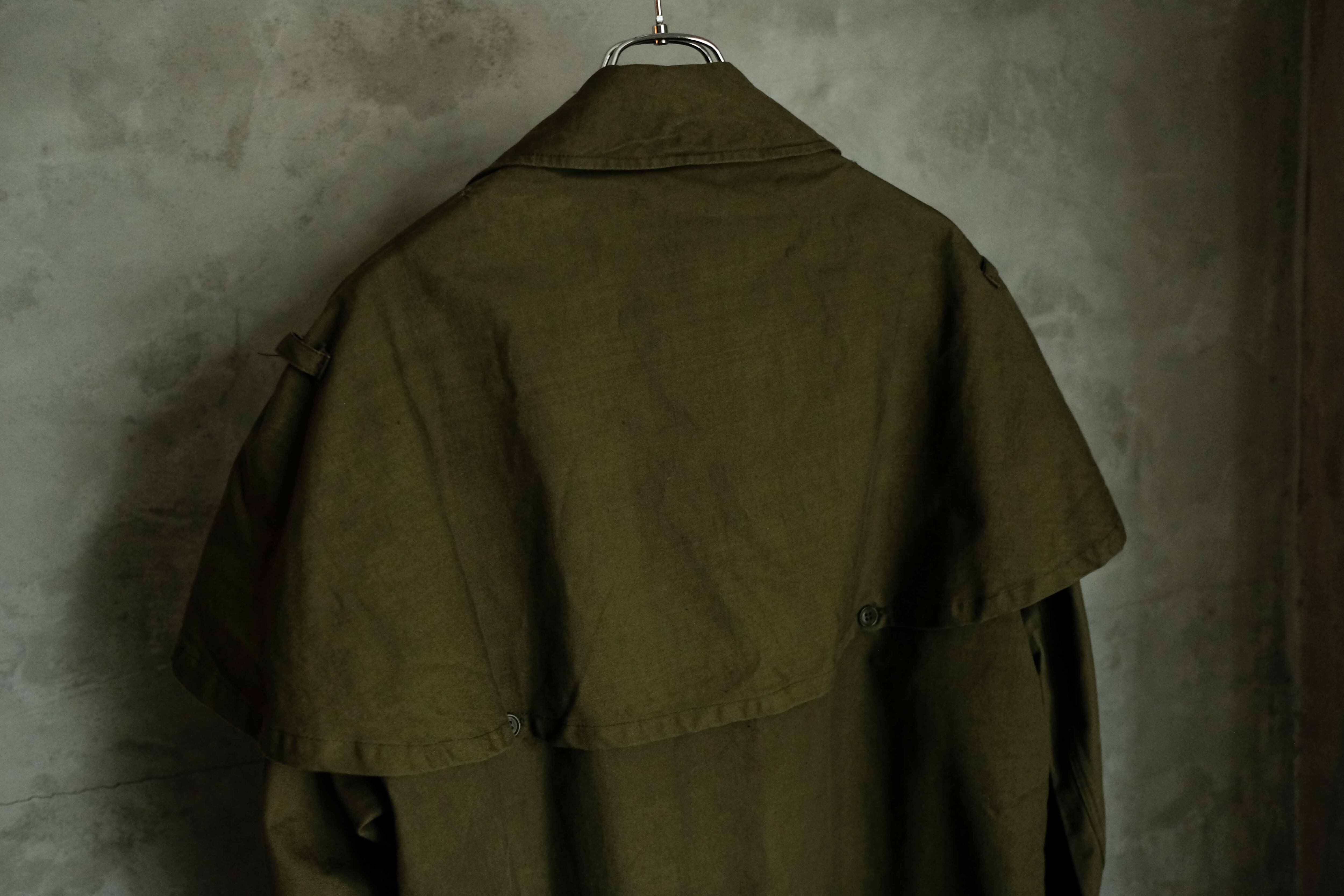 パキっとしたオリーブグリーンカラーに、肩周りに付いた大きなケープが特徴的なデザイン。