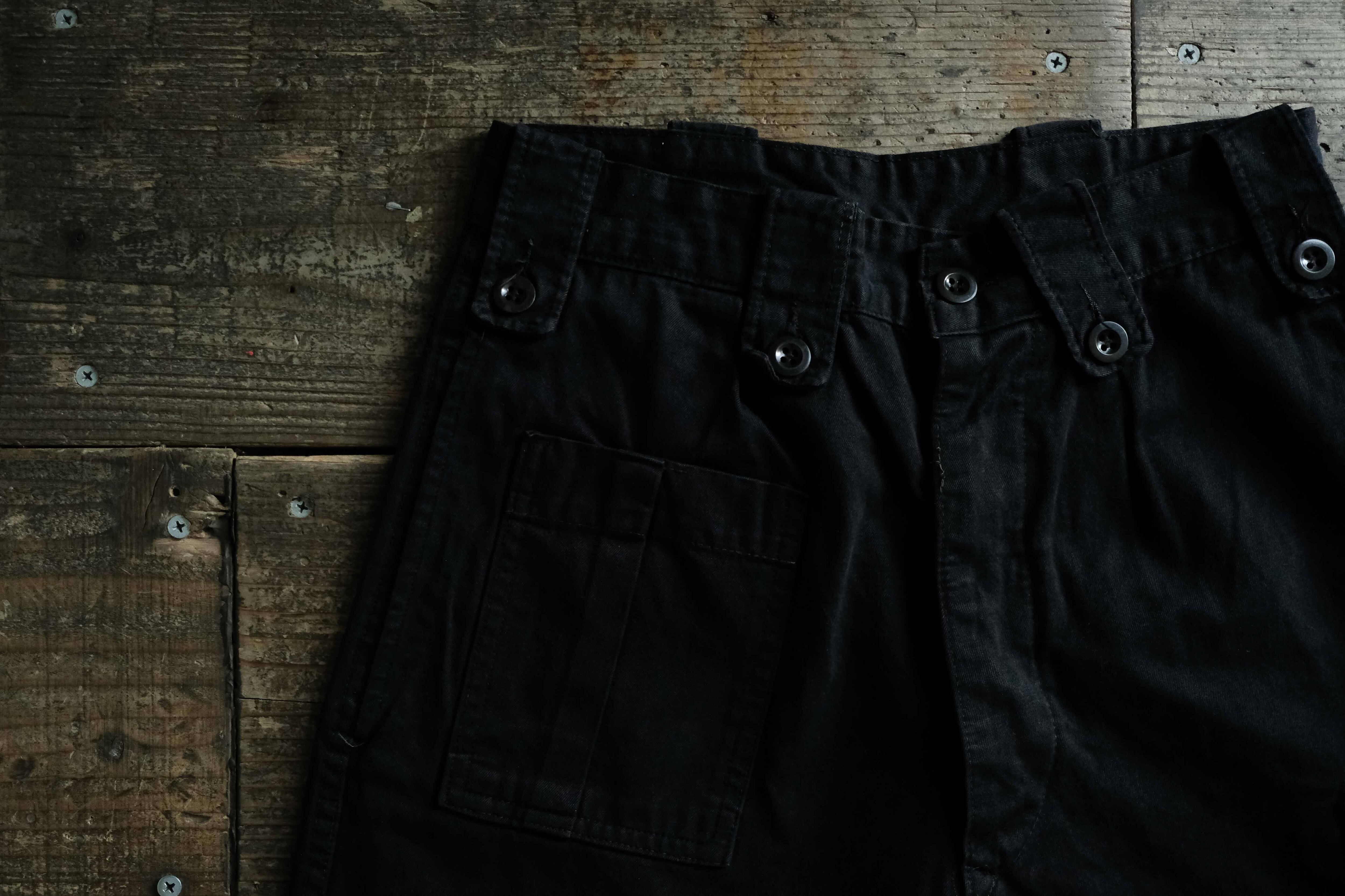 イギリス軍のフィールドパンツを模したベルトループと、アシンメトリーのポケットのつき方が特徴的です。