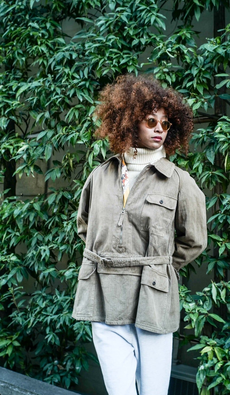胸下くらいまで伸びるハーフジップデザイン。古い洋服ですが、現代にも通づるポイントです。