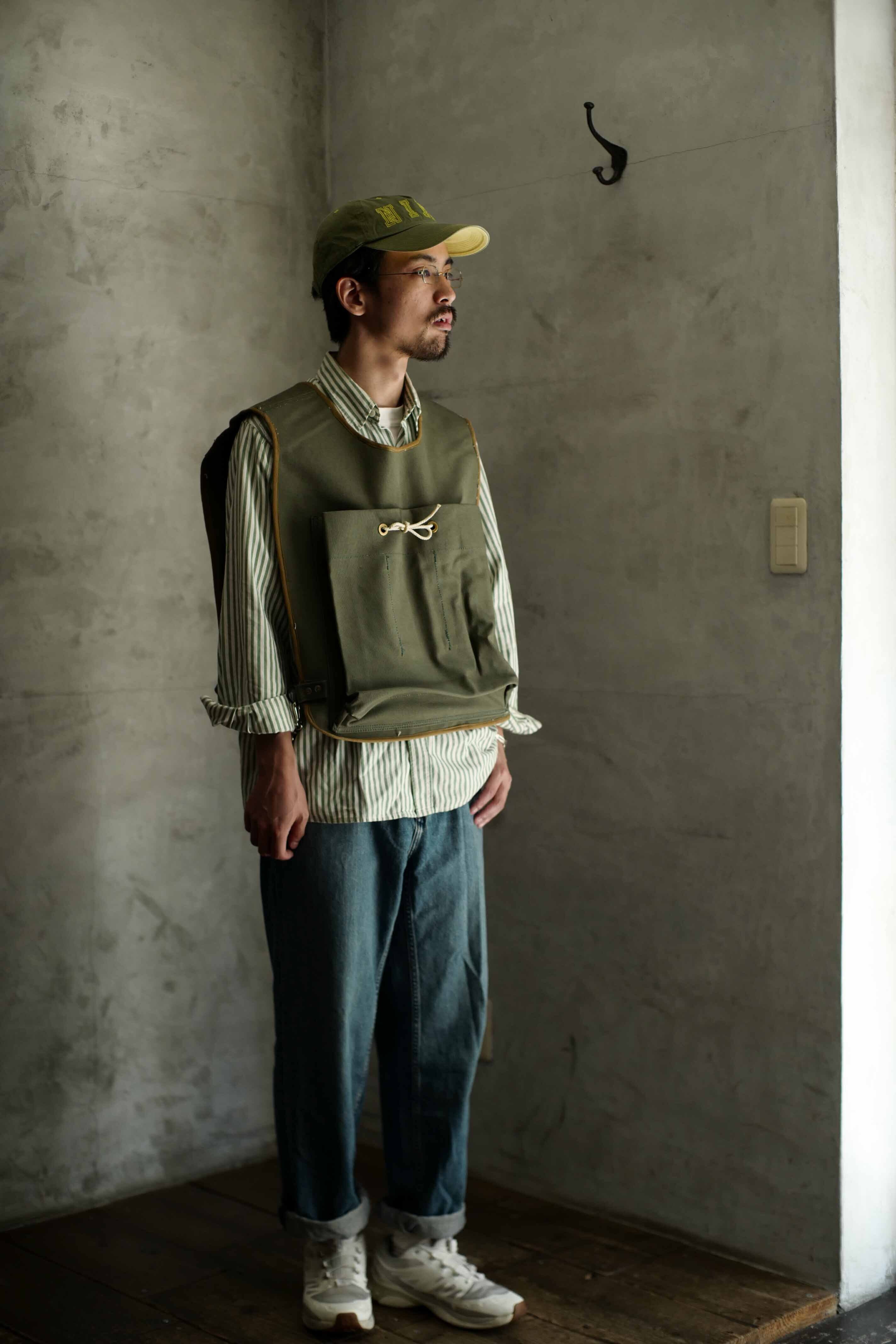 前後ろのサイドをDカンとフックでつなぎ留めて、ベストとして着用する作りです。